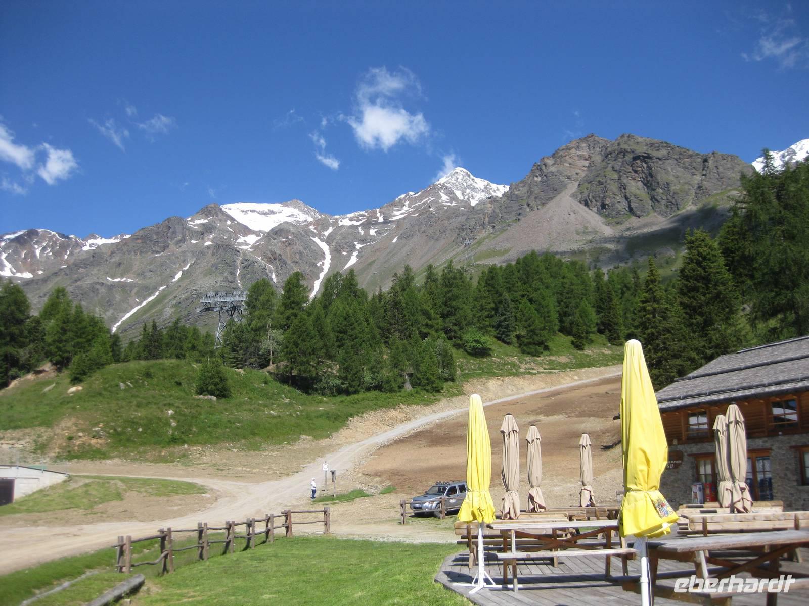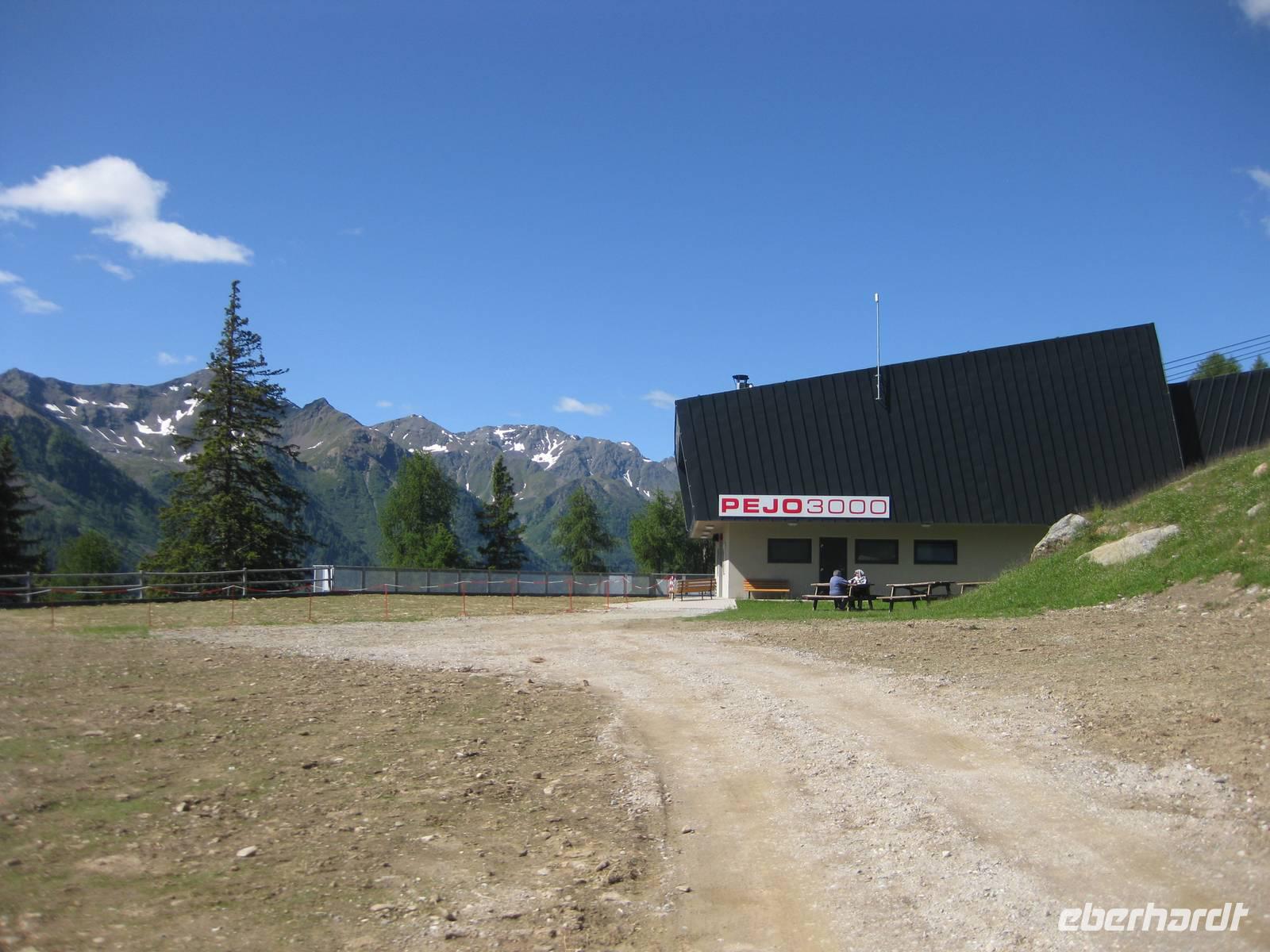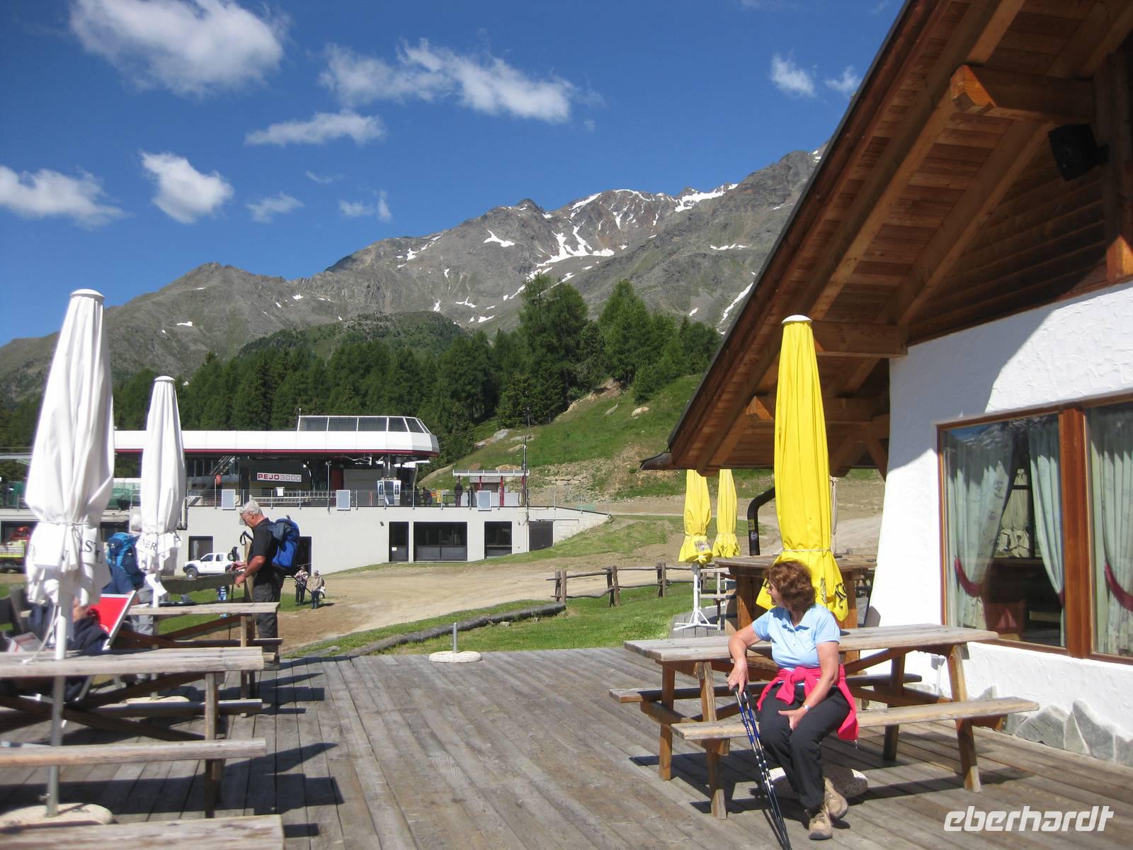 Wir fahren mit der Gondelbahn hinauf bis in eine Höhe von 2030 Metern. Hier kann man umsteigen auf einen Sessellift, der die Gäste bis zur Rifugio "Doss dei Gembri" in eine Höhe von 2300 m bringt und dann kann man weiter zu Fuß bis zur Rifugio "Mantova al Voiz" in eine Höhe von 3535 m gehen. Die Spitze des Monte Voiz (3645m) können wir sehen. Die Kabinenbahn "Peio3000" bringt die Gäste auch noch weiter nach oben, in eine andere Richtung. Beide fahren aber noch nicht, sondern erst ab 27.06.2015. Hier oben ist die Hütte "Lo Scoiattolo" mit einer Sonnenterrasse, die traumhafte Ausblicke auf die schneebedeckten Berge und in die Täler bietet. Wir verweilen ein paar Minuten auf der Terrasse und genießen die Aussichten. Dann starten wir zu unserer Wanderung.