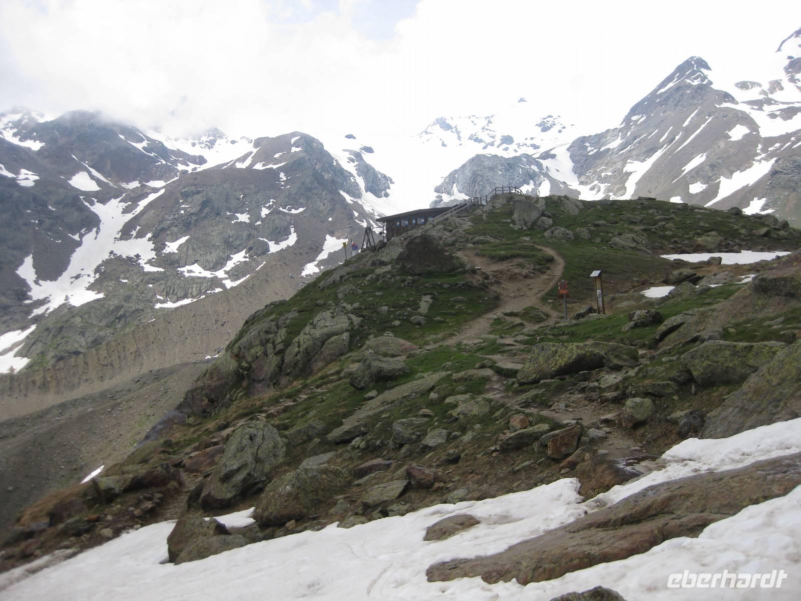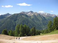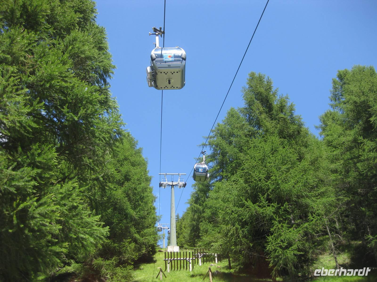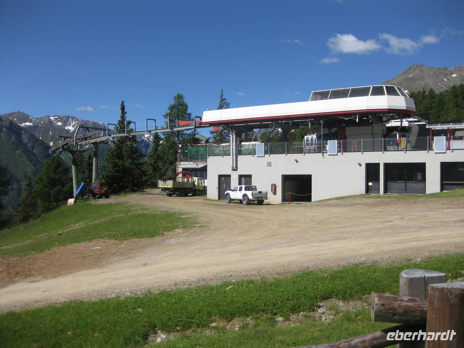 Wir fahren mit der Gondelbahn hinauf bis in eine Höhe von 2030 Metern. Hier kann man umsteigen auf einen Sessellift, der die Gäste bis zur Rifugio "Doss dei Gembri" in eine Höhe von 2300 m bringt und dann kann man weiter zu Fuß bis zur Rifugio "Mantova al Voiz" in eine Höhe von 3535 m gehen. Die Spitze des Monte Voiz (3645m) können wir sehen. Die Kabinenbahn "Peio3000" bringt die Gäste auch noch weiter nach oben, in eine andere Richtung. Beide fahren aber noch nicht, sondern erst ab 27.06.2015. Hier oben ist die Hütte "Lo Scoiattolo" mit einer Sonnenterrasse, die traumhafte Ausblicke auf die schneebedeckten Berge und in die Täler bietet. Wir verweilen ein paar Minuten auf der Terrasse und genießen die Aussichten. Dann starten wir zu unserer Wanderung.