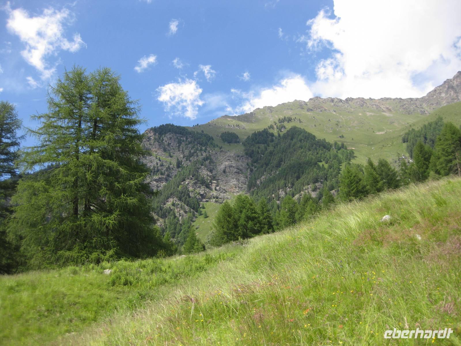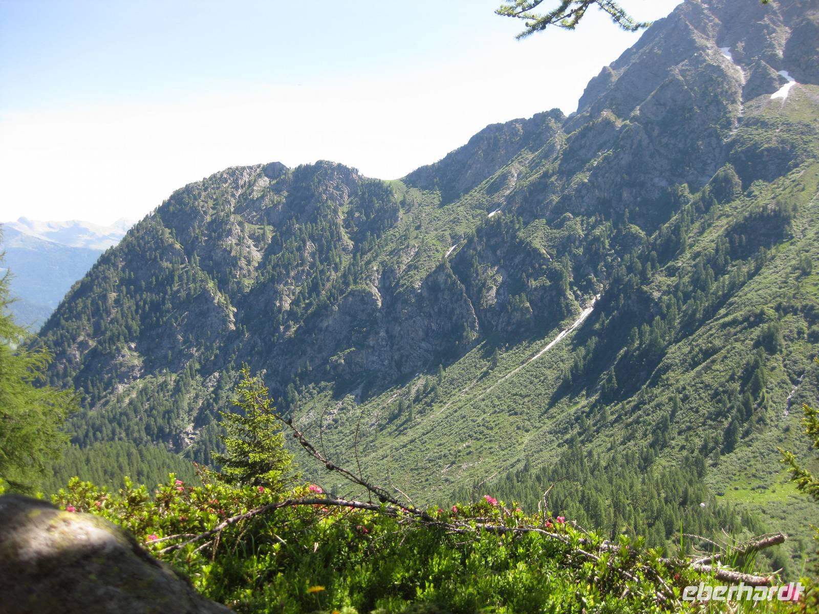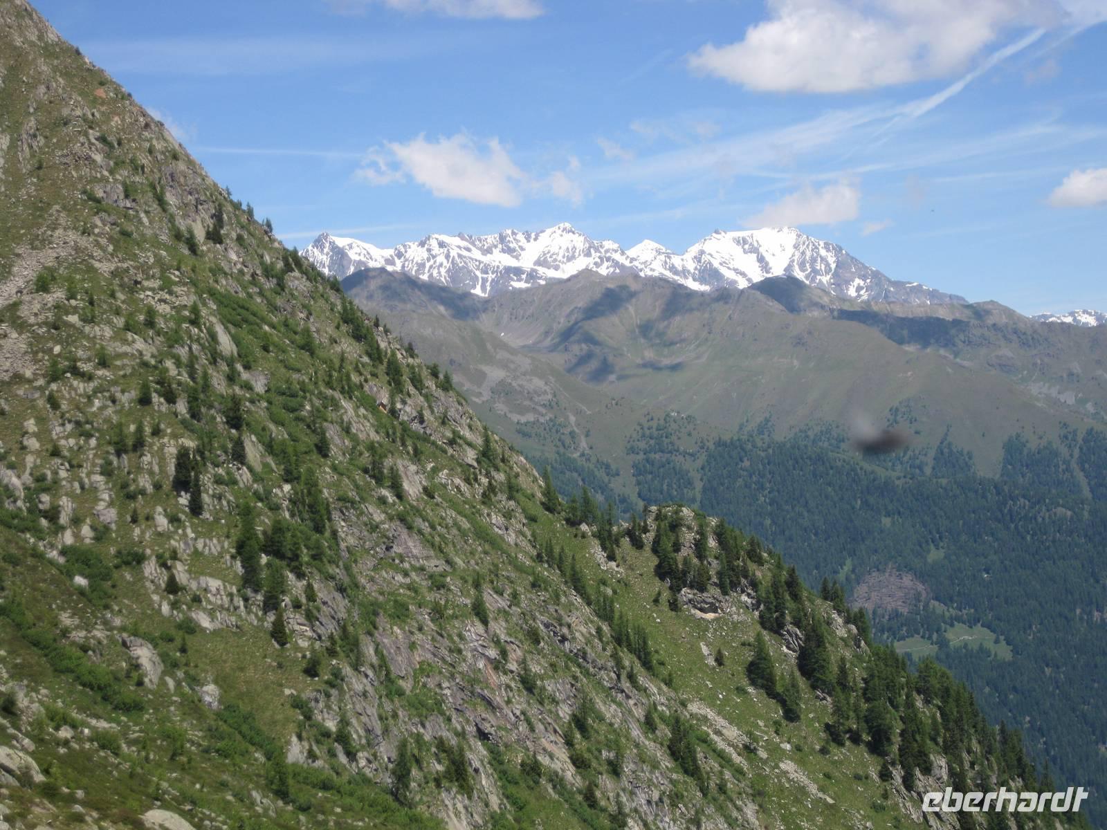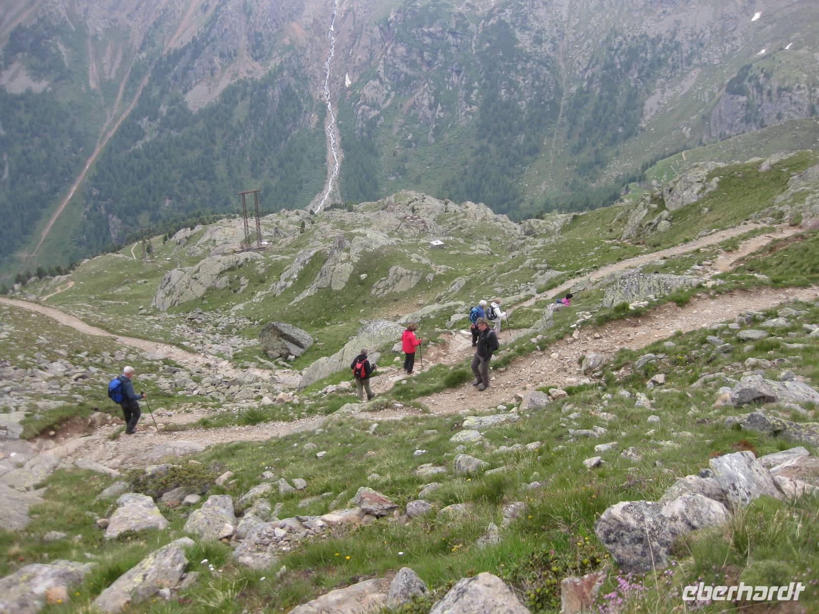 Von der Malga Levi müssen wir noch ein ganzes Stück hinauf. Wir haben weiter oben schon die andere Gruppe gesehen, die auch die Wanderung macht. Wir überwinden heute wieder 900 Höhenmeter und steigen bis zu einer Höhe von 2230 m hinauf. Dann geht es ein ganzes Stück ziemlich eben weiter und immer wieder bieten sich fantastische Ausblicke in Richtung Peio mit dem Monte Voiz, wir können auch den Pian-Palu-See sehen und später blicken wir in Richtung Ortles-Cevedale-Gruppe. Es ist einfach atemberaubend.