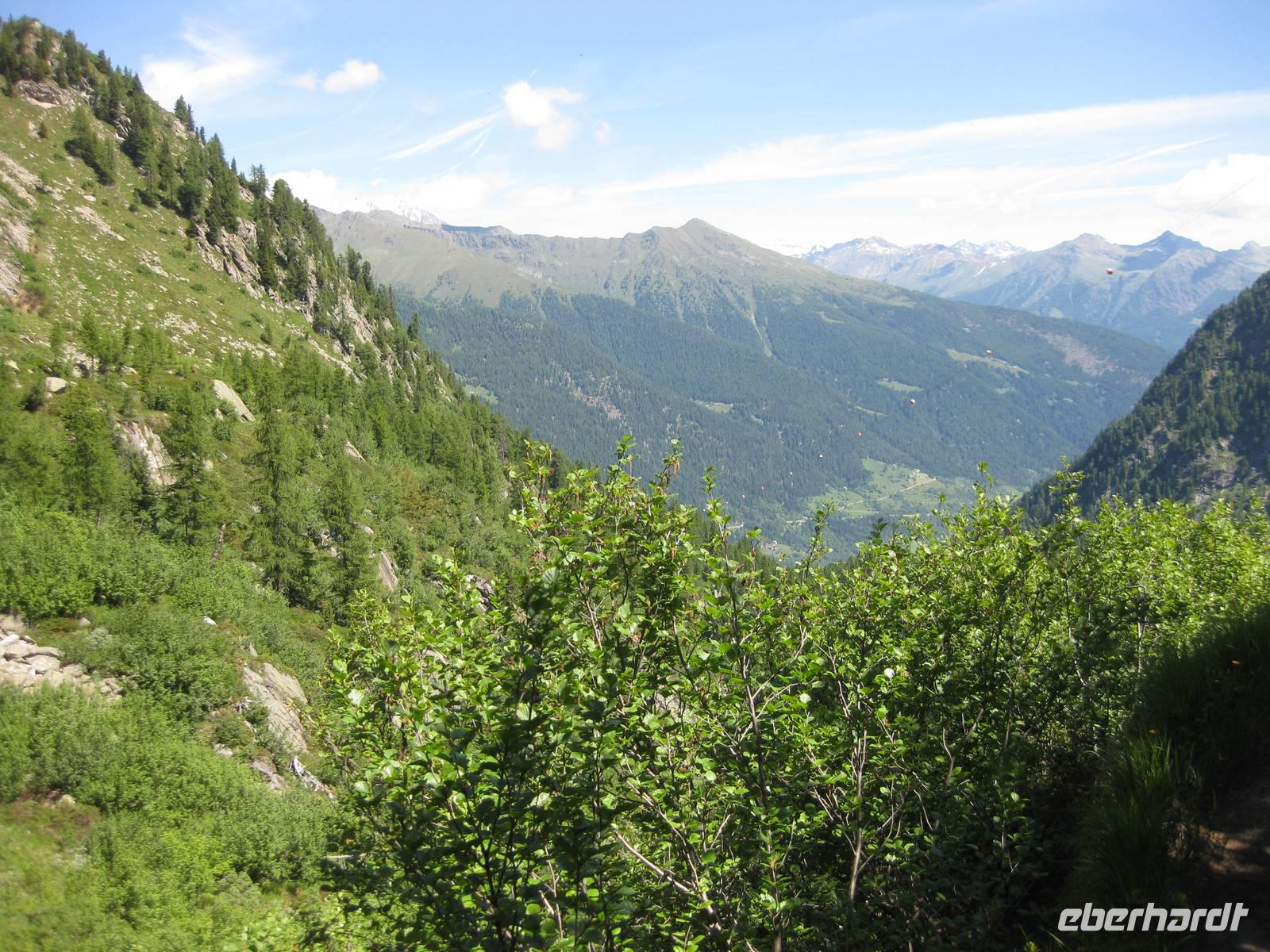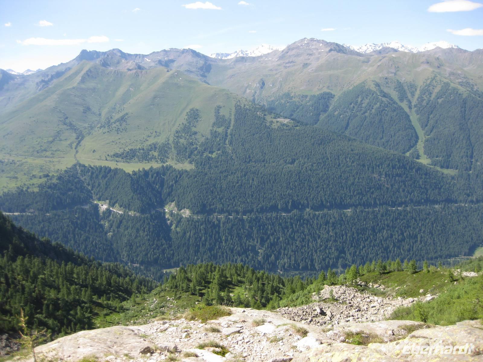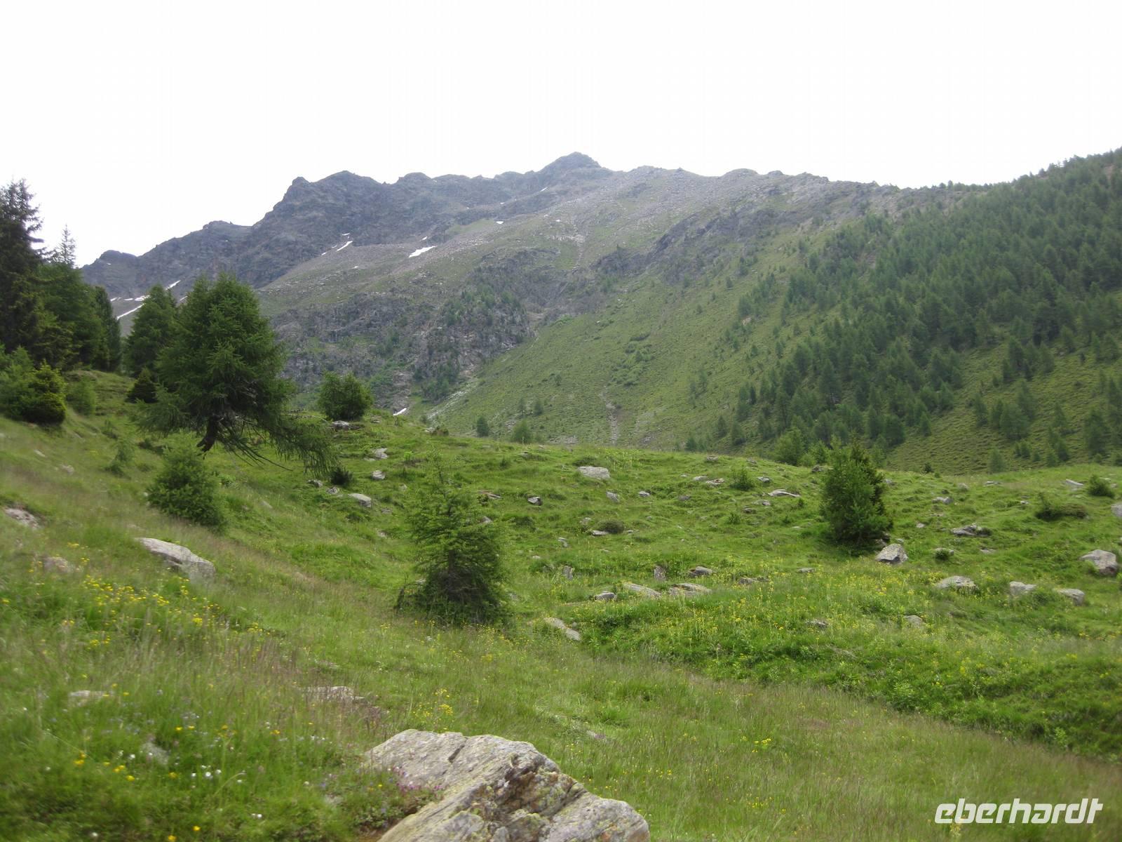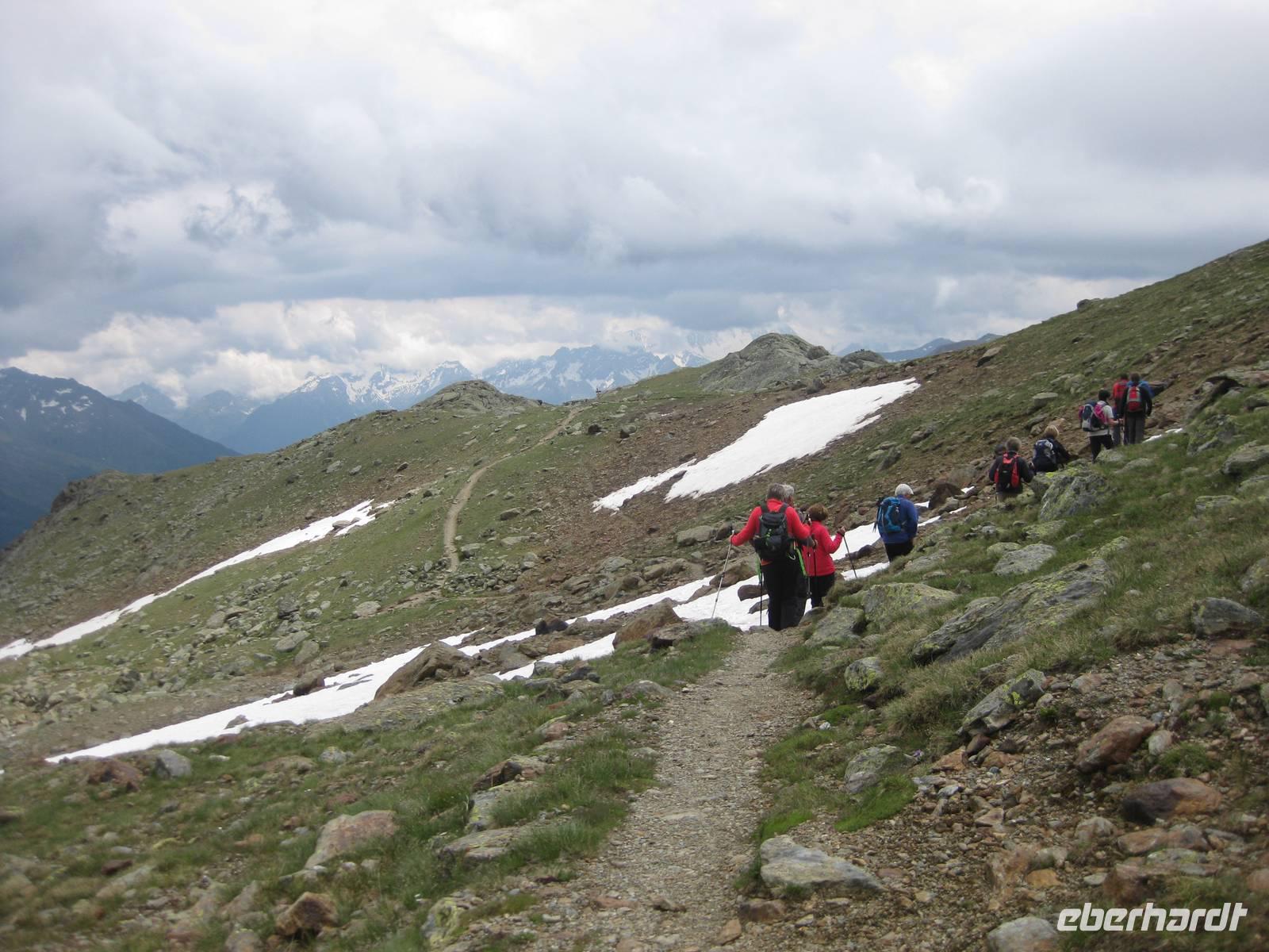 Von der Malga Levi müssen wir noch ein ganzes Stück hinauf. Wir haben weiter oben schon die andere Gruppe gesehen, die auch die Wanderung macht. Wir überwinden heute wieder 900 Höhenmeter und steigen bis zu einer Höhe von 2230 m hinauf. Dann geht es ein ganzes Stück ziemlich eben weiter und immer wieder bieten sich fantastische Ausblicke in Richtung Peio mit dem Monte Voiz, wir können auch den Pian-Palu-See sehen und später blicken wir in Richtung Ortles-Cevedale-Gruppe. Es ist einfach atemberaubend.