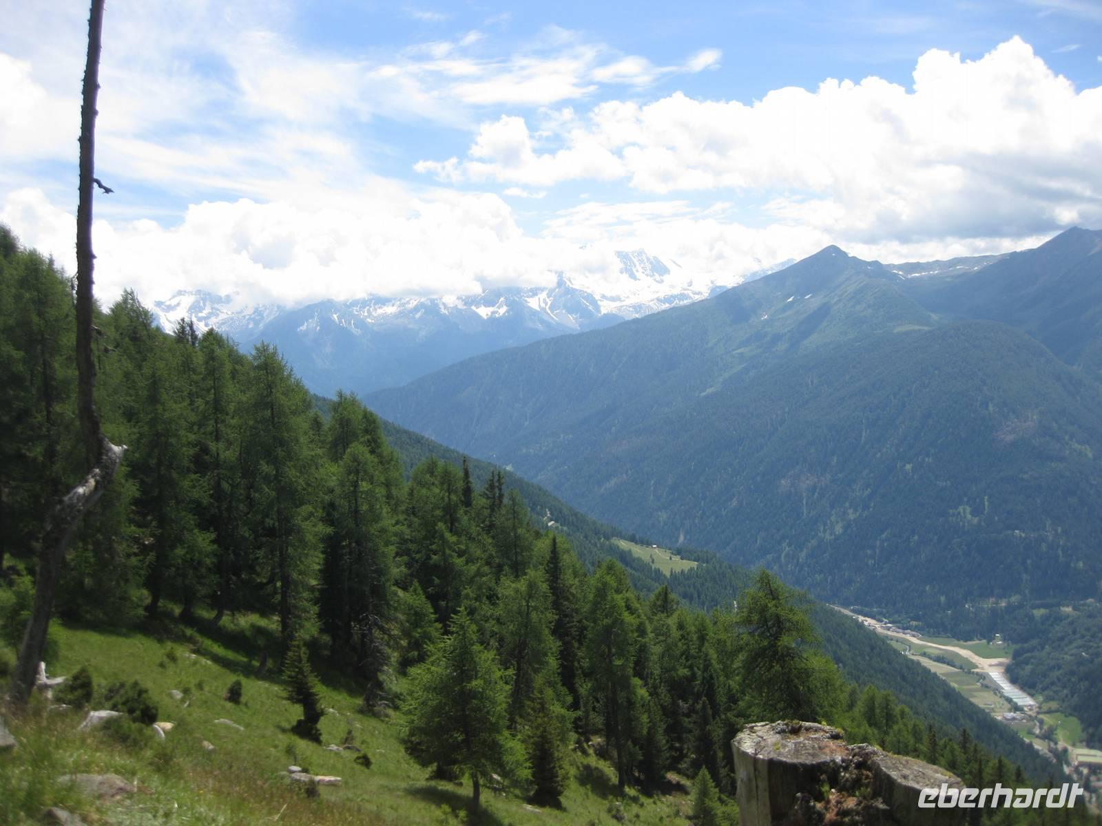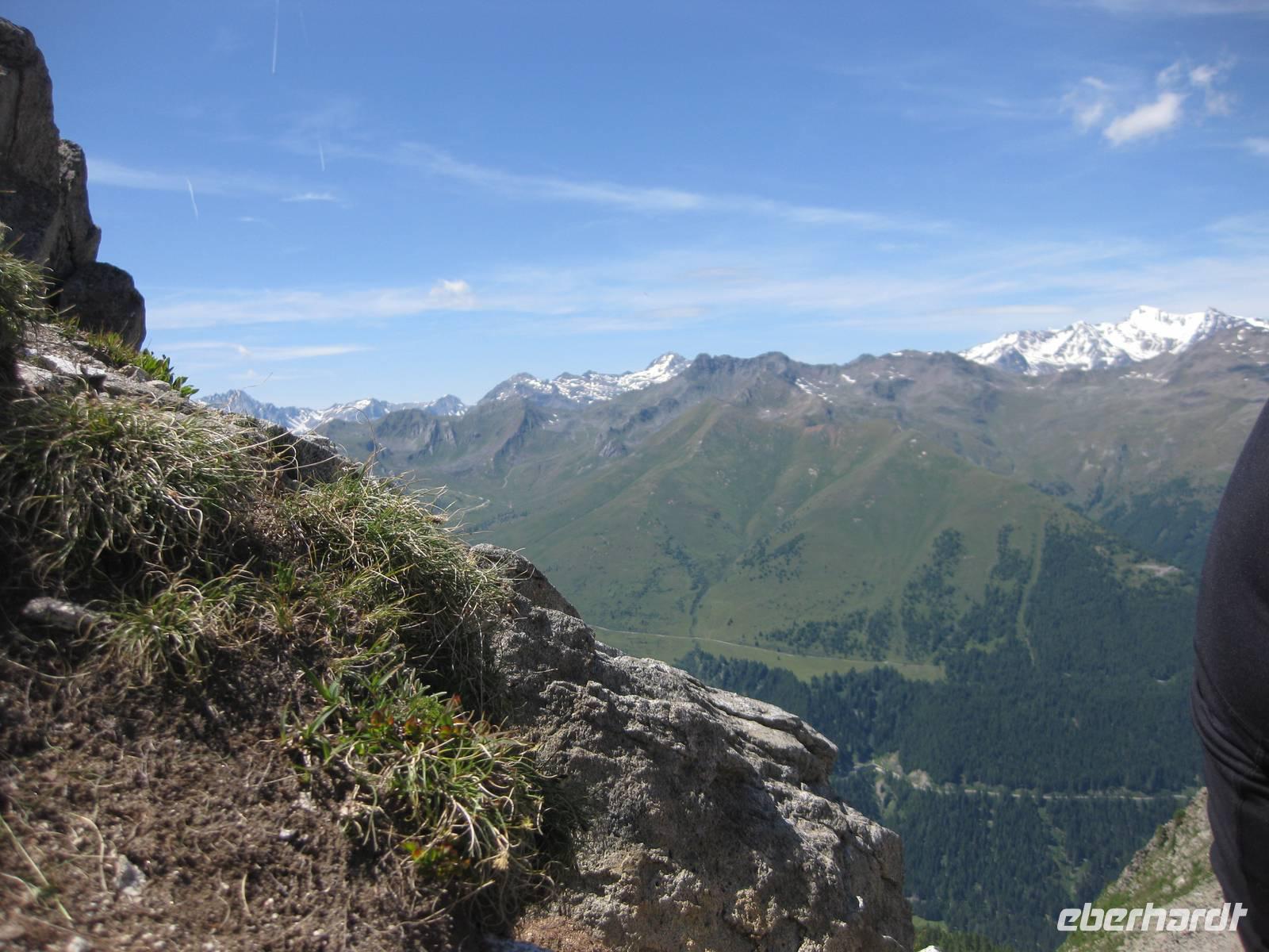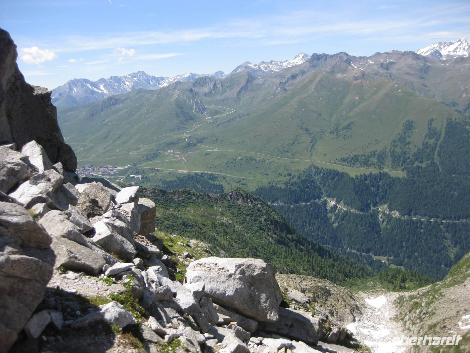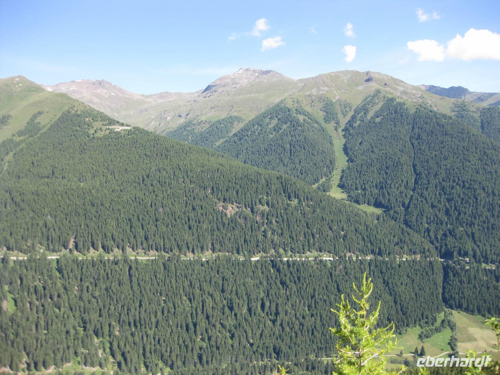 Von der Malga Levi müssen wir noch ein ganzes Stück hinauf. Wir haben weiter oben schon die andere Gruppe gesehen, die auch die Wanderung macht. Wir überwinden heute wieder 900 Höhenmeter und steigen bis zu einer Höhe von 2230 m hinauf. Dann geht es ein ganzes Stück ziemlich eben weiter und immer wieder bieten sich fantastische Ausblicke in Richtung Peio mit dem Monte Voiz, wir können auch den Pian-Palu-See sehen und später blicken wir in Richtung Ortles-Cevedale-Gruppe. Es ist einfach atemberaubend.