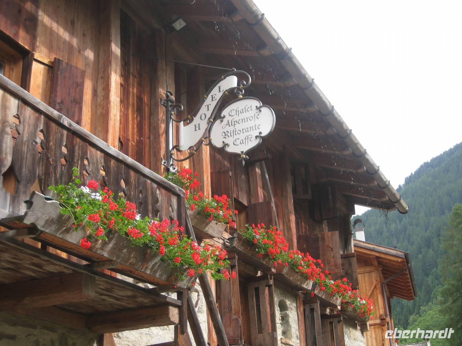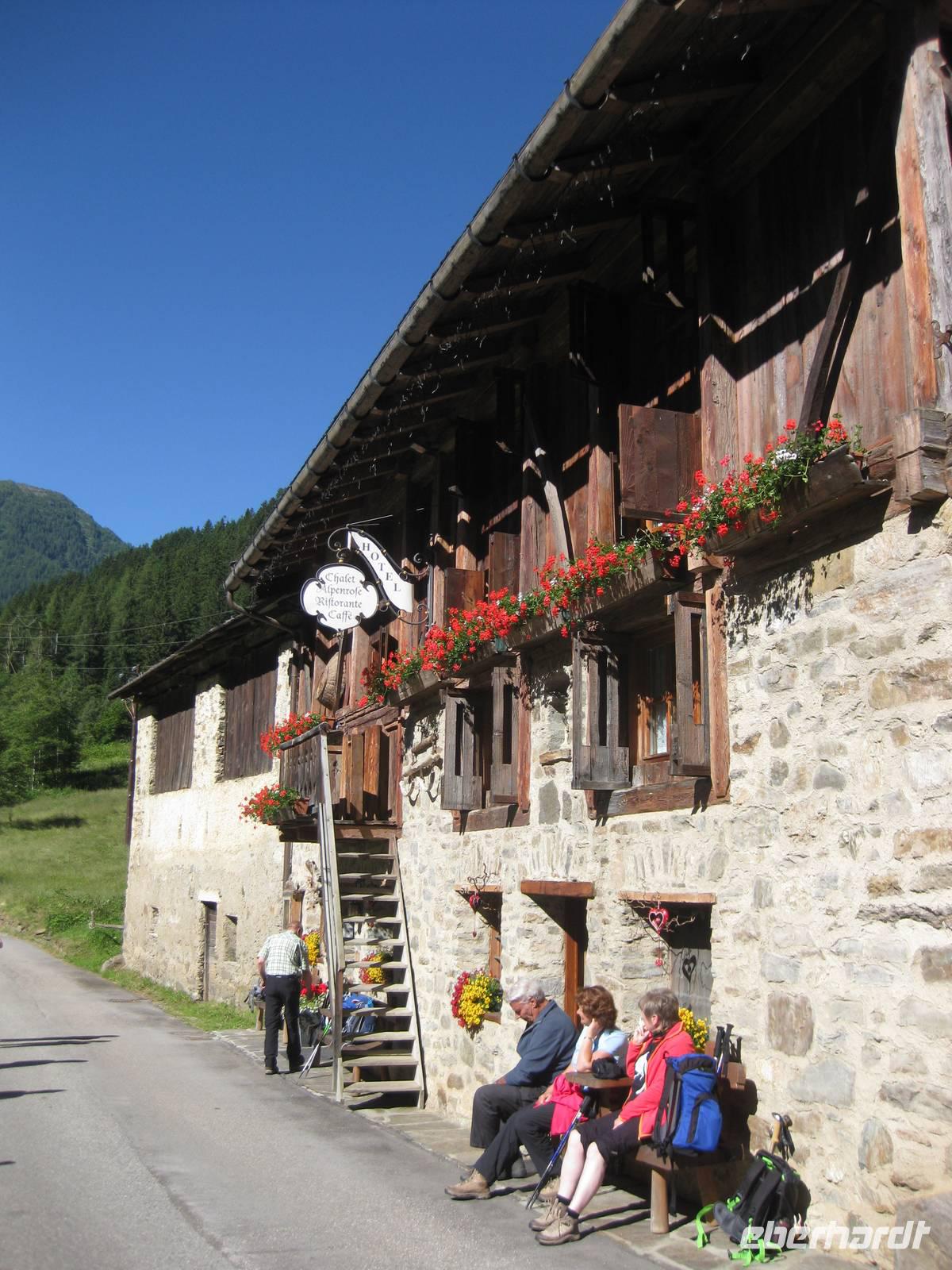 19.20 Uhr erreichen wir das "Benny Bio Hotel" in Commezzadura. Hier wohnt die andere Wandergruppe. Wir verabschieden uns. Unsere Gruppe wird mit zwei Fahrzeugen abgeholt und zum ca. 15 Kilometer entfernten "Hotel Chalet Alpenrose" in Cogolo gebracht. Unser Hotel liegt ein wenig außerhalb von Cogolo, schon im Val de la Mare. Dort erwartet uns Martina, die Chefin des Hauses. Sie begrüßt uns ganz herzlich. Wir checken ein und beziehen unsere Zimmer. In einer halben Stunde treffen wir uns zum Abendessen wieder.