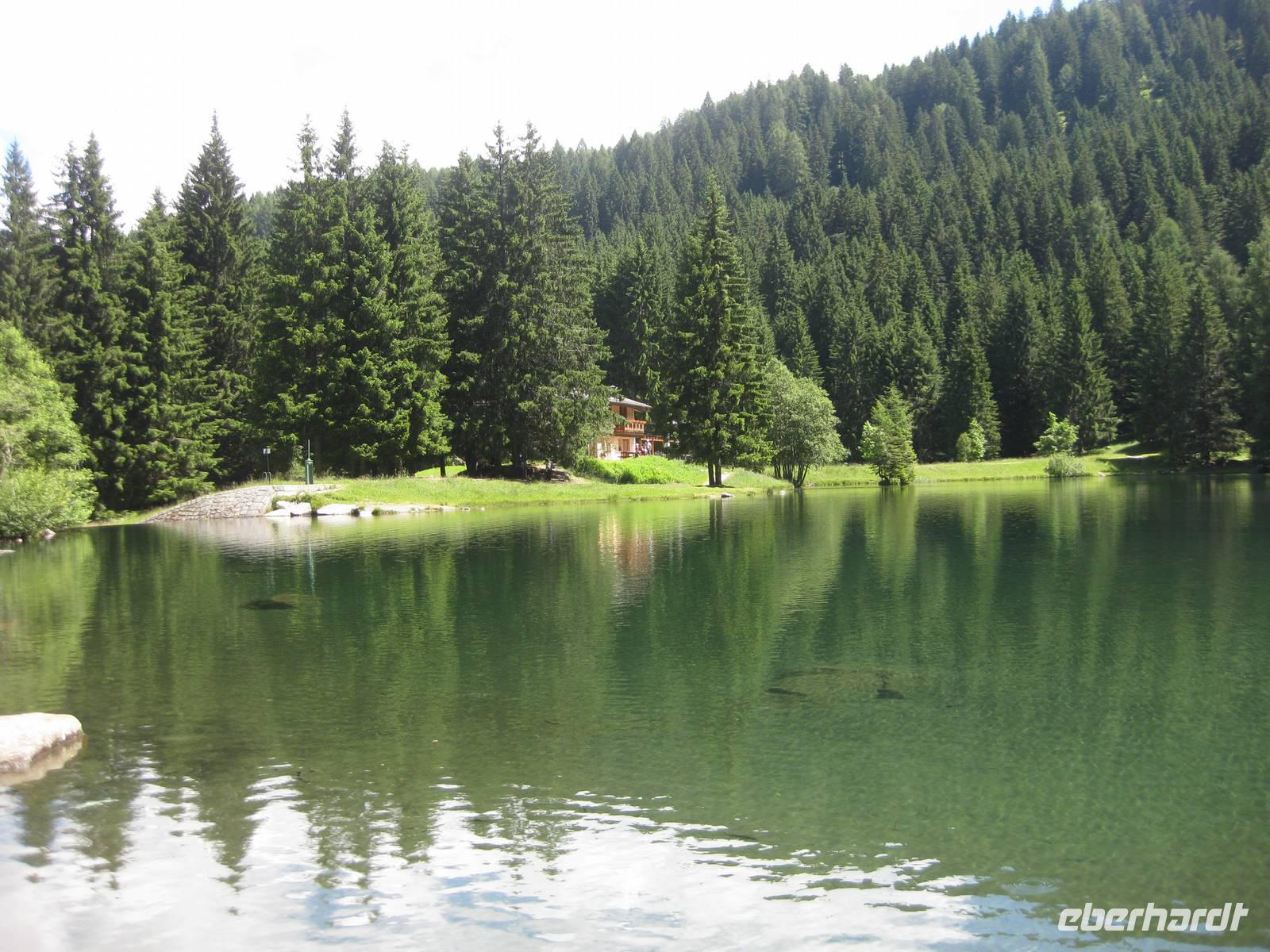 Nicht weit vom Botanischen Garten entfernt befindet sich der Caprioli-See. Der erste Blick auf den See ist bezaubernd. Er liegt, umgeben von Wäldern und herrlich blühenden Bergwiesen, zu Füßen der Adamello-Presanella Berggruppe. Im klaren Wasser des Sees spiegelt sich die Umgebung des Sees wieder. Wir machen eine Runde um den See und kehren im Restaurant am Ufer zur Mittagsrast ein. Auf der Terrasse genießen wir das herrliche Wetter.