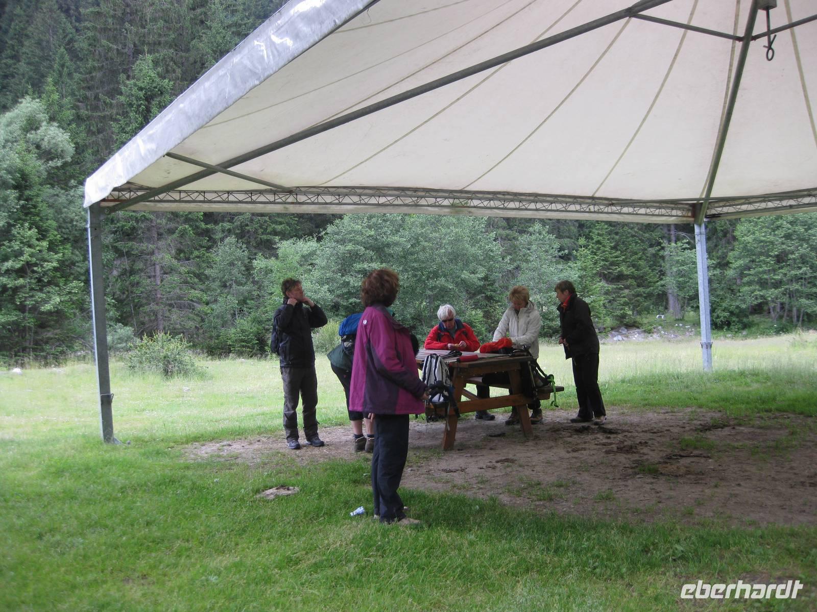 Am Nachmittag steigen wir hinab in Richtung Pontevecchio. An den Grillplätzen im Val de la Mare erwartet uns Tiziano mit einem tollen Picknick. Es gibt gegrillte Würstchen und Fleisch, Chiche, Brot, Kuchen, Wein, ... . 15.45 Uhr treffen wir ein. Wir sind ganz schön hungrig und langen kräftig zu. Dann wird auch die Laune wieder besser.