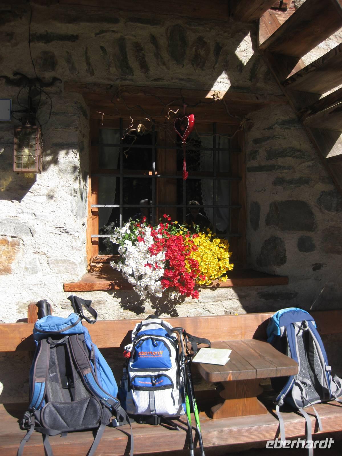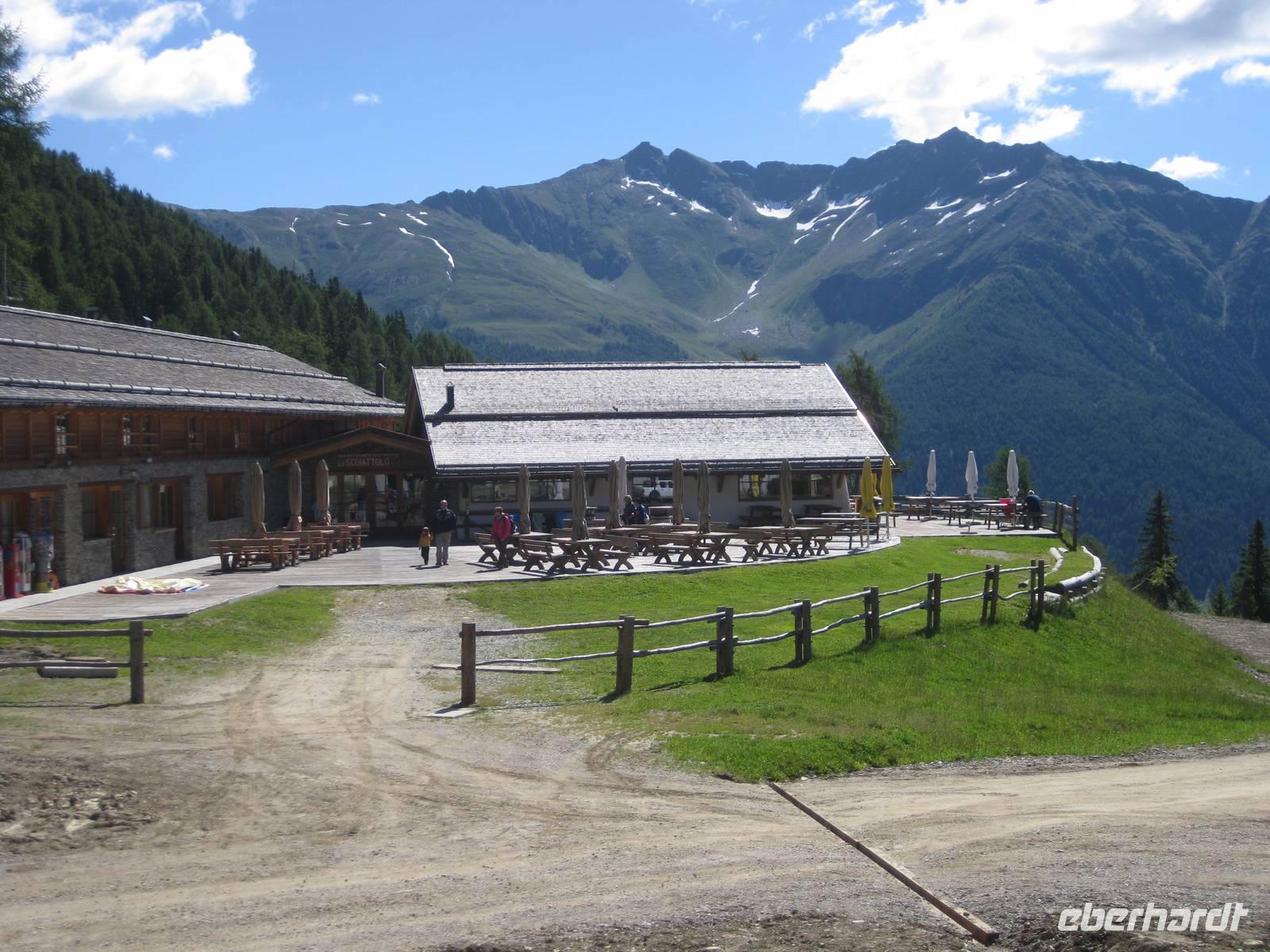 Heute abend ist Hüttenabend. Da gibt es das Abendessen nicht im Hotel in der "Sissi-Stube" sondern in der Hütte in den Bergen. Deshalb treffen wir uns, d.h. alle Hotelgäste, 17.30 Uhr vor dem Hotel Alpenrose. Wir laufen alle gemeinsam mit Martina zur Hütte. Wir müssen ca. 1,5 Stunden bergauf laufen, bis wir die Hütte erreichen. Das ist noch mal eine ganz schöne Anstrengung, denn es ist ganz schön warm heute. Tiziano empfängt uns mit einem Hugo und dann wird in der Hütte das Abendessen serviert. Es gibt auch reichlich zu trinken. Es fehlt nichts. Da sind die Strapazen des Aufstiegs ganz schnell wieder vergessen. Nach 21.00 Uhr steigen wir dann alle wieder den Weg hinab zum Hotel. Dann fallen alle nur noch in ihre Betten.