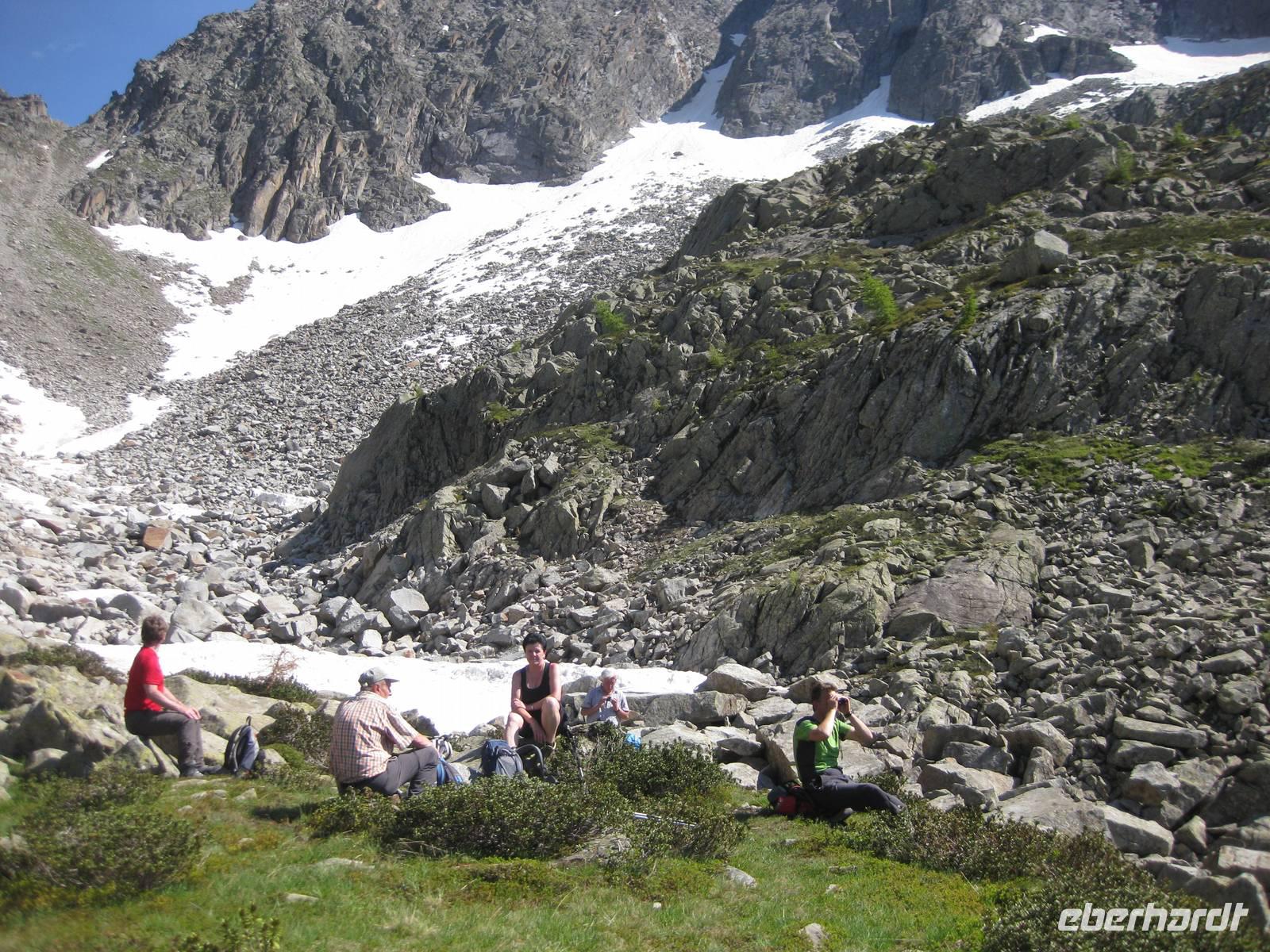 11.45 Uhr erreichen wir die Schutzhütte Rifugio Denza in 2298 m Höhe bei herrlichstem Sonnenschein. Wir sind alle total beeindruckt von der Schönheit der Landschaft hier oben so unmittelbar am Fuße der Schneefelder und Gletscher. Nach einer kurzen Verschnaufpause machen wir noch einen Abstecher zum Bergsee Lago Presanella hinter der Hütte. Auf den Bergwiesen blühen Enzian, Primel, Kuhschelle und ... Wir blicken auf die Berge rundherum und sind sprachlos. Dann kehren wir in der Hütte ein und stärken uns mit einer deftigen, sehr leckeren Gerstensuppe (Gräupchensuppe). Auf der Terrasse vor der Hütte hat Italo sein Fernrohr aufgebaut. So können wir noch etwas weiter in die Ferne schauen. Hier oben ist es so schön, man möchte am liebsten gar nicht wieder hinab.