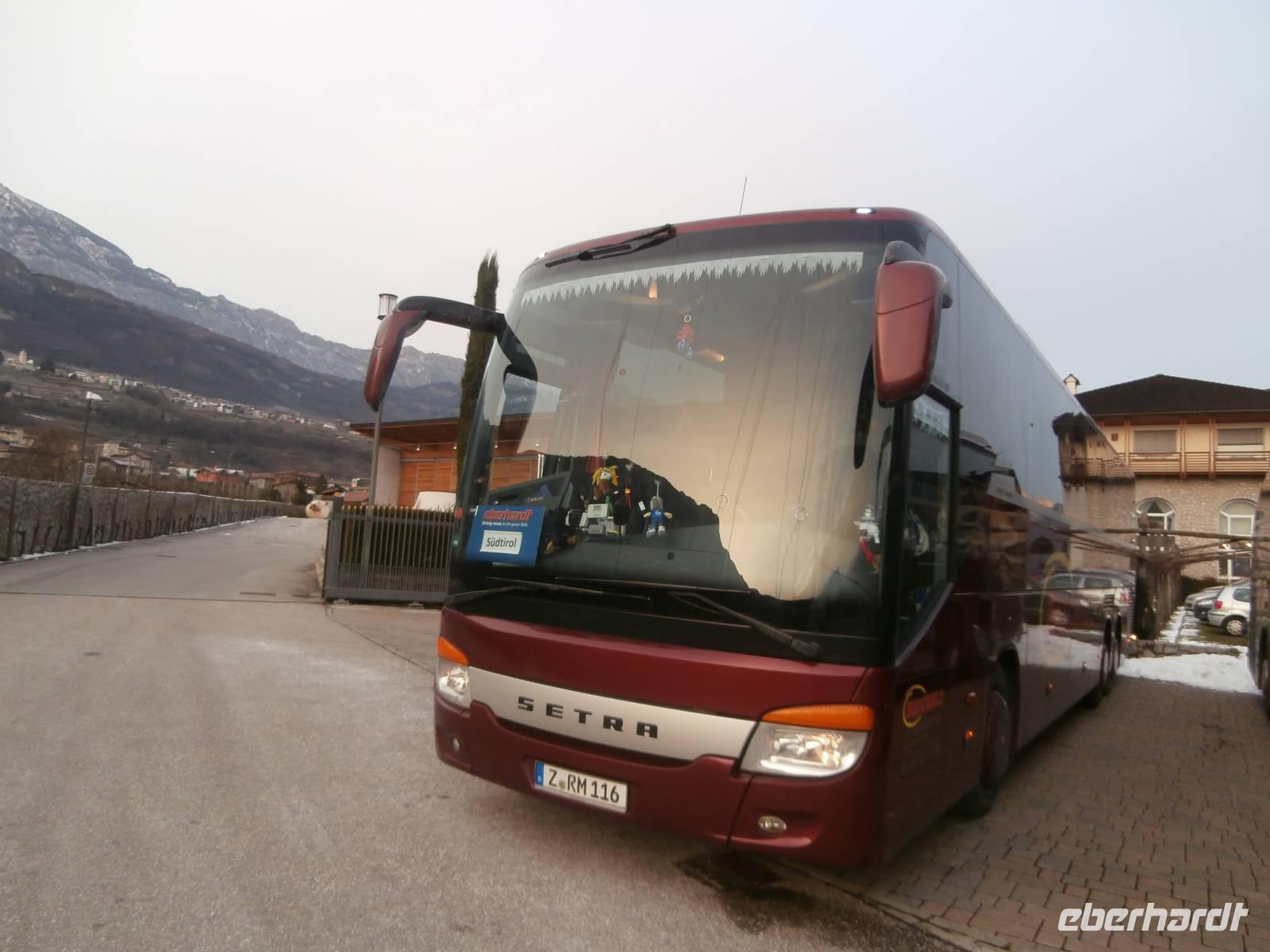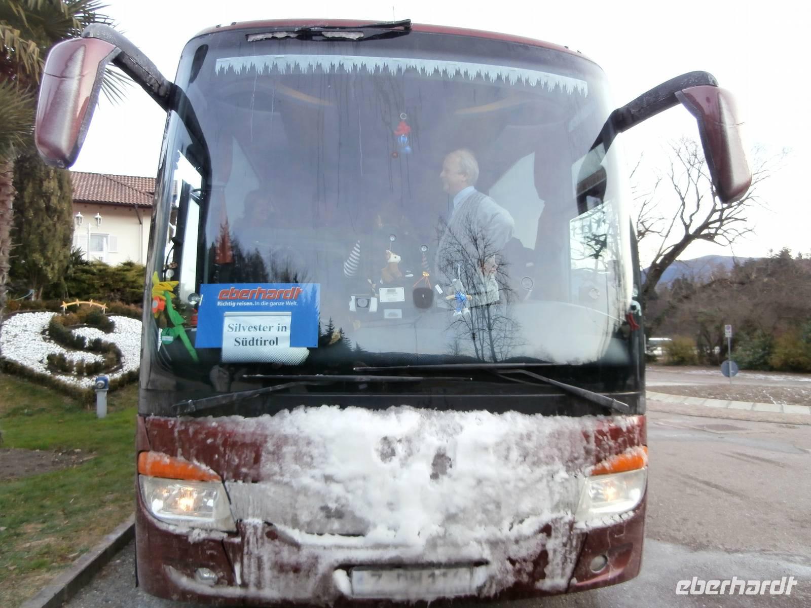 Wir starten unsere "Silvestertour" in Dresden bei extremen, winterlichen Bedingungen! Schnell wird uns allen bewusst, dass es heute sehr schwierig wird, mit dem Bus vorwärts zu kommen. Souverän steuert Marion, unsere Buschauffeurin, den Reisebus über die zugeschneite Autobahn, auf der es chaotisch zugeht. Räumfahrzeuge suchen wir vergebens und mit über zwei Stunden Verspätung erreichen wir Münchberg, unsere letzte Zustiegsstelle. Alle Gäste sind frohen Mutes und so kommen wir, wenn auch nicht so schnell, gegen halb neun im Seehotel Sparer in St. Michael/Eppan am Montiggler See an. Ja und hier in Südtirol an der Weinstraße gibt es kaum Schnee, es ist schon wie ein Hohn, in unserer Region versinkt man im Schnee und hier können wir den Schnee gebrauchen. Wir sind im großen Bus der Firma Reichelt unterwegs und mit Jörg haben wir einen sehr netten und kompetenten Reisebusfahrer am Steuer. Spät wird heute Abend gegessen, aber wir sind alle glücklich, gut und sicher hier angekommen zu sein bei diesem Wintereinbruch in Deutschland und Österreich. Im Seehotel Sparer ist man bestens auf unsere Reisegruppe vorbereitet und so fallen wir alle nach einem vorzüglichen Abendessen in unsere Betten.