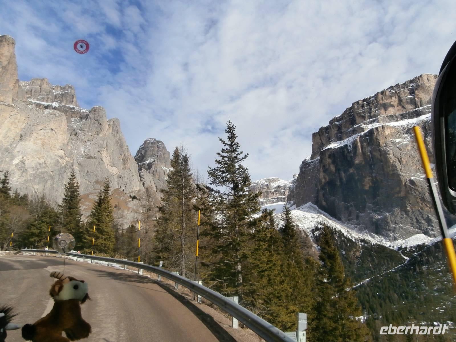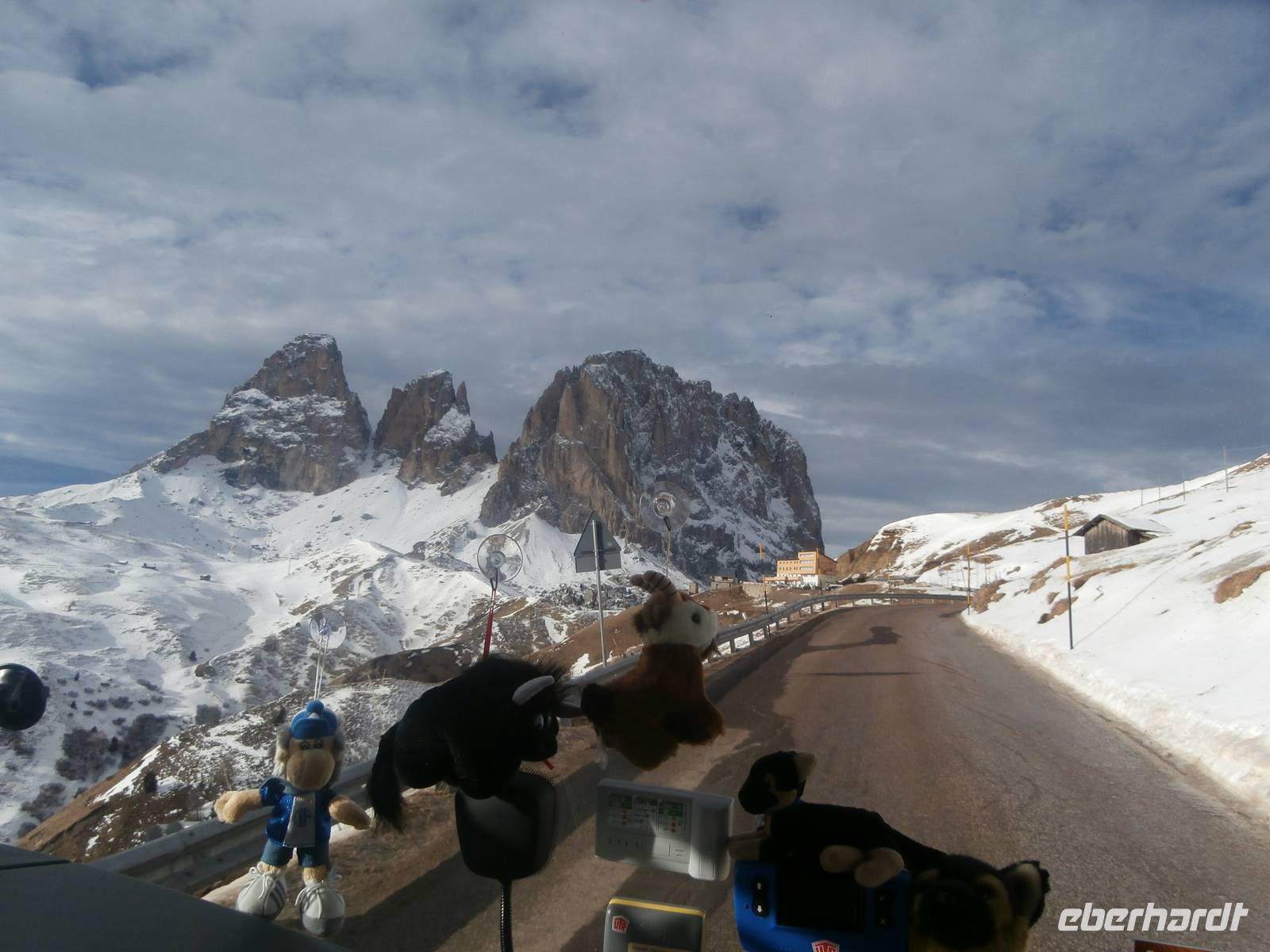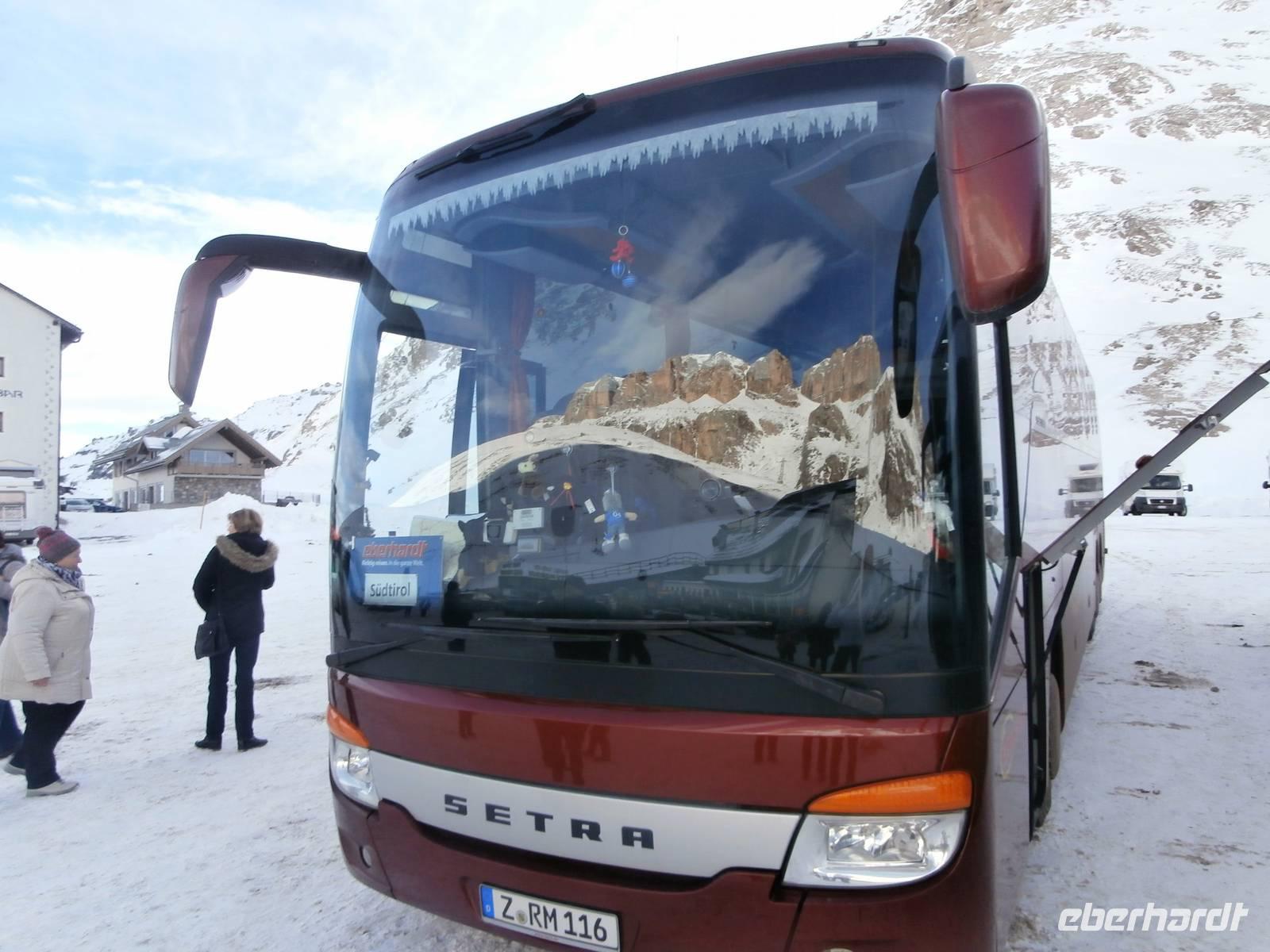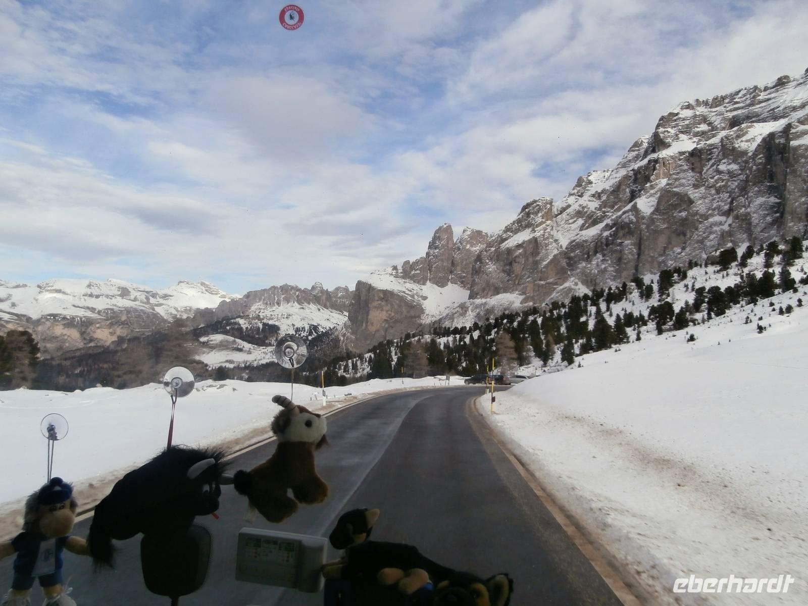 Über Wetter spricht man nicht, wir haben es für uns gemietet, azurblauer Himmel erwartet uns zur Dolomitenrundfahrt. Mit Siegfried Schwingshackl geht es auf unserer Fahrt durchs Eggental auf der großen Dolomitenstraße entlang. Am Karrersee legen wir einen Stopp ein und vor der Rosengartengruppe nehmen wir unser Gruppenfoto auf. Die Kehren hinunter nach Canazei meistert unser Buschauffeur Jörg ganz souverän. Auf dem Weg zum Sella Joch liegt zunächst unser Halt am Pass Pordoi und wieder gibt es eine schöne Fotokulisse. Auf dem Weg zum Sella-Joch erhaschen wir einen Blick auf die Marmolada, sie ist mit 3342 Meter der höchste Berg der Dolomiten. Auch die Passhöhe des Sella-Joches mit 2240 Meter ist stark frequentiert von Wintersportlern. Ob Geißlerspitzen oder die Langkofelgruppe, wir sehen so manches Massiv vom Sella Pass aus. Weiter geht die Fahrt über das Grödnertal mit seinen bekannten Orten wie Wolkenstein und St. Ullrich. Im Unterfinser Hof haben wir für eine Bretteljause vorbestellt, Schinken, Käse, Kartoffeln und warme Schlutzkrapfen mit Mohn und Marmelade gefüllt, werden uns in uriger Stube serviert. Ein köstlicher Rotwein rundet diese Jause würdig ab. Im Hotel werden wir schon zur Weinprobe mit einem Sommelier erwartet, er präsentiert typische Weine seiner Südtiroler Heimat. Das Abschiedsessen ist wieder mit viel Liebe zubereitet. 177 km