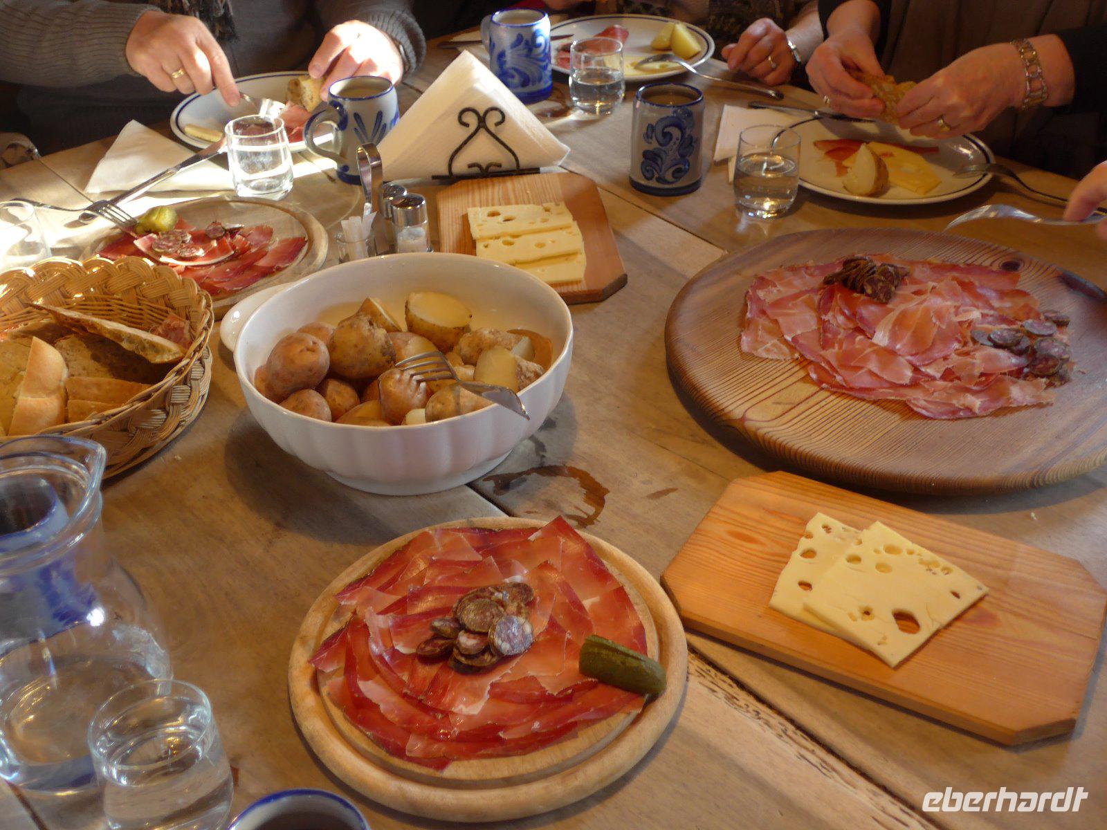 Über Wetter spricht man nicht, man hat es einfach. Azzurblauer Himmel erwartet uns zur Dolomitenrundfahrt. Mit Siegfried Schwingshackl geht es auf große Dolomitenrundfahrt. Karersee mit Rosengartenmassiv. Weiter in Richtung Canazei. Die Kehren meistert unser Steffen ganz souverän. Auf dem Weg zum Sella-Joch erhaschen wir sogar einen Blick auf die Marmolada. Sie ist mit 3342 Meter der höchste Berg der Dolomiten. Auch die Passhöhe des Sella-Joches mit 2240 Meter war es Zeit für einen Glühwein. Am Joch traumhafte Fotokulisse mit Blick auf Langkofel und Fünf-Finger-Spitze. Soweit man schauen kann ziehen Skifahrer ihre Bögen. Weiter geht die Fahrt über das Grödnertal mit seinen bekannten Orten Wolkenstein, Christina und St. Ullrich.in Richtung Autobahn. Am Unterfinser Hof bei Lajen machten wir dann auch ohne Bretter einen Einkehrschwung. Schinken, Käse, Kartoffeln und warme Krapfen mit Mohn und Marmelade gefüllt, werden uns in uriger Stube serviert. Ein köstlicher Wein rundet diese Jause würdig ab. Im Hotel werden wir schon zur Weinprobe mit einem Sommelier erwartet, er präsentiert typische Weine seiner Südtiroler Heimat. Das Abschiedsessen ist wieder mit viel Liebe zubereitet und lässt den Abschied etwas erträglicher werden.