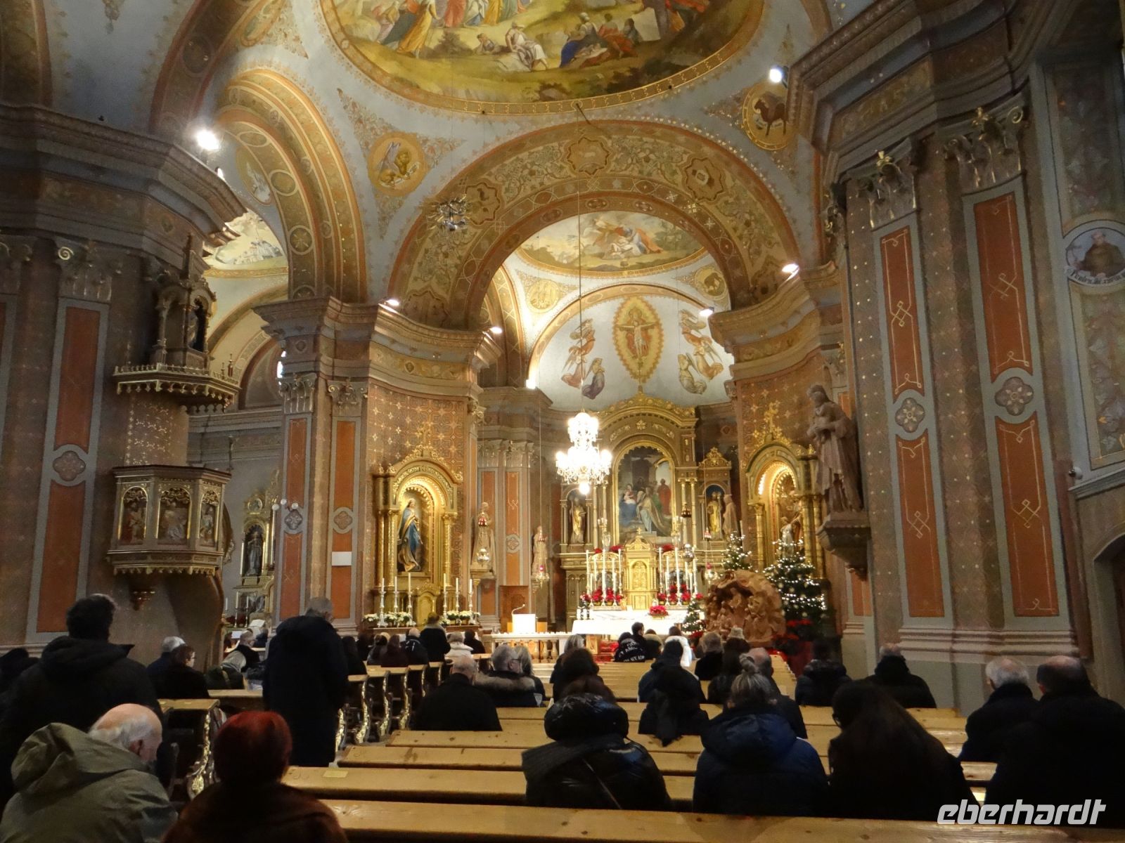 Die Kirche, die dem Heiligen Ulrich gewidmet ist, zeugt von der Wohlhabenheit des Ortes: ein einheitlicher gestalteter Innenraum sowie die golden verzierten Seiten der Kirchbänke zum Mittelgang hin bezeugen den Stolz dieser Kirchengemeinde. Namenstafeln auf den Kirchbänken stellen klar, wer hier jeden Sonntag seine Gebete in den Himmel schickt. Und sie haben auch eine gewisse Kontrollfunktion – denn, welcher Platz bleibt frei?