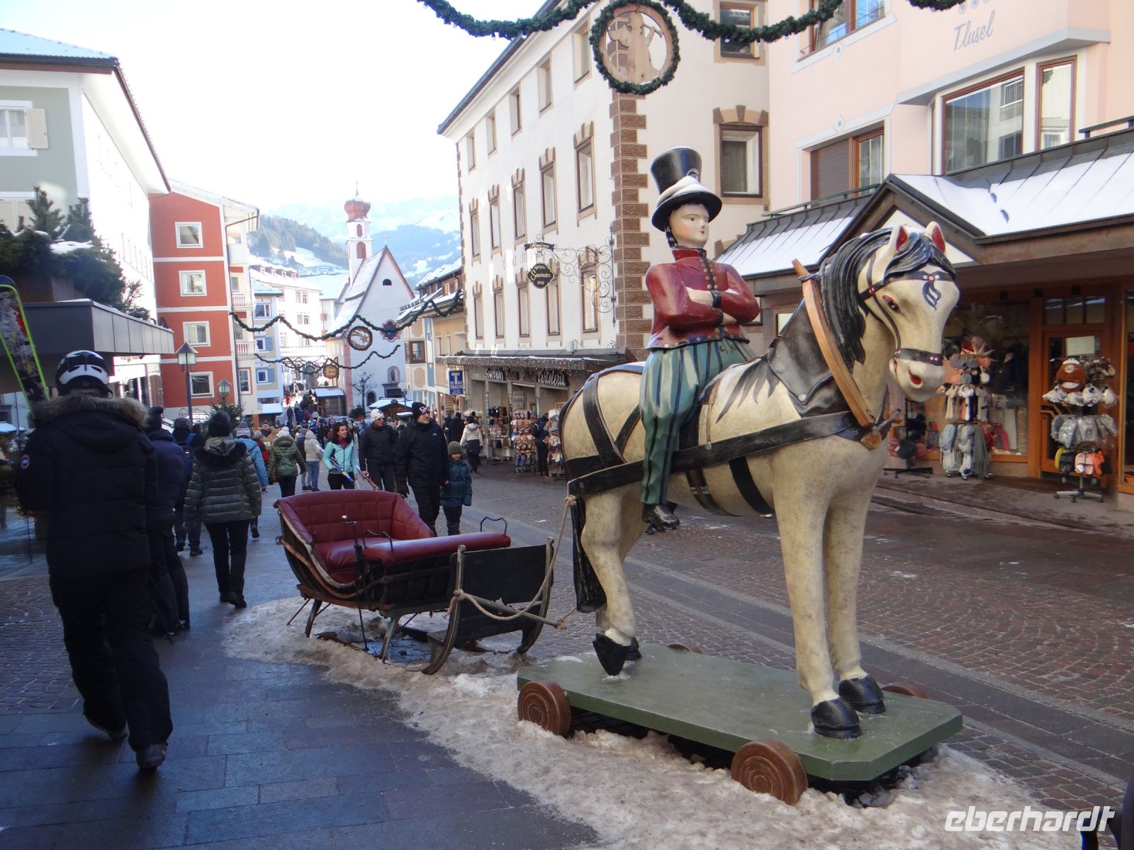 In St. Ulrich laufen wir zwischen Heerscharen von Skifahrern durch den Ort. Mit Helm, Stöcken und dem steifen Gang in den Skischuhen sehen sie aus wie moderne Ritter.