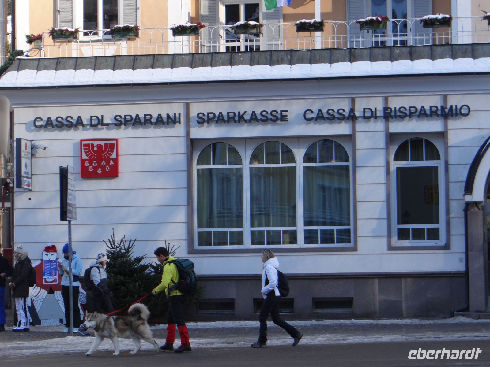 Wir fahren weiter nach Kastelruth. Am Ortseingang grüßen die Kastelruther Spatzen als Silhouette. Obgleich der Ort nicht groß ist und der Platz zum Bauen begrenzt, stehen die Kirche und der große Glockenturm getrennt. Dazwischen passt die Eisbahn und der kleine Weihnachtsmarkt und am Glühweinstand schwatzen die Dorfbewohner miteinander.