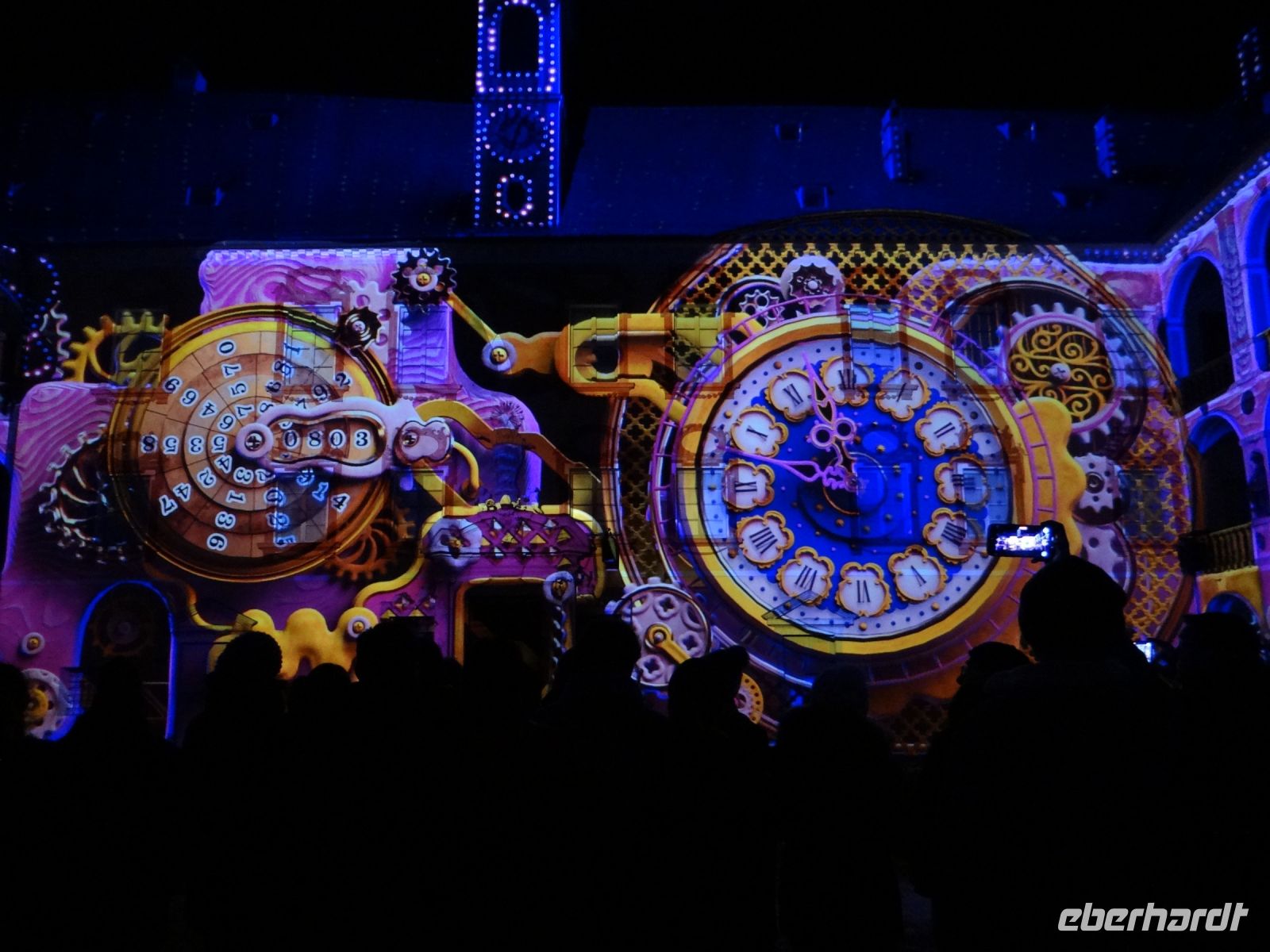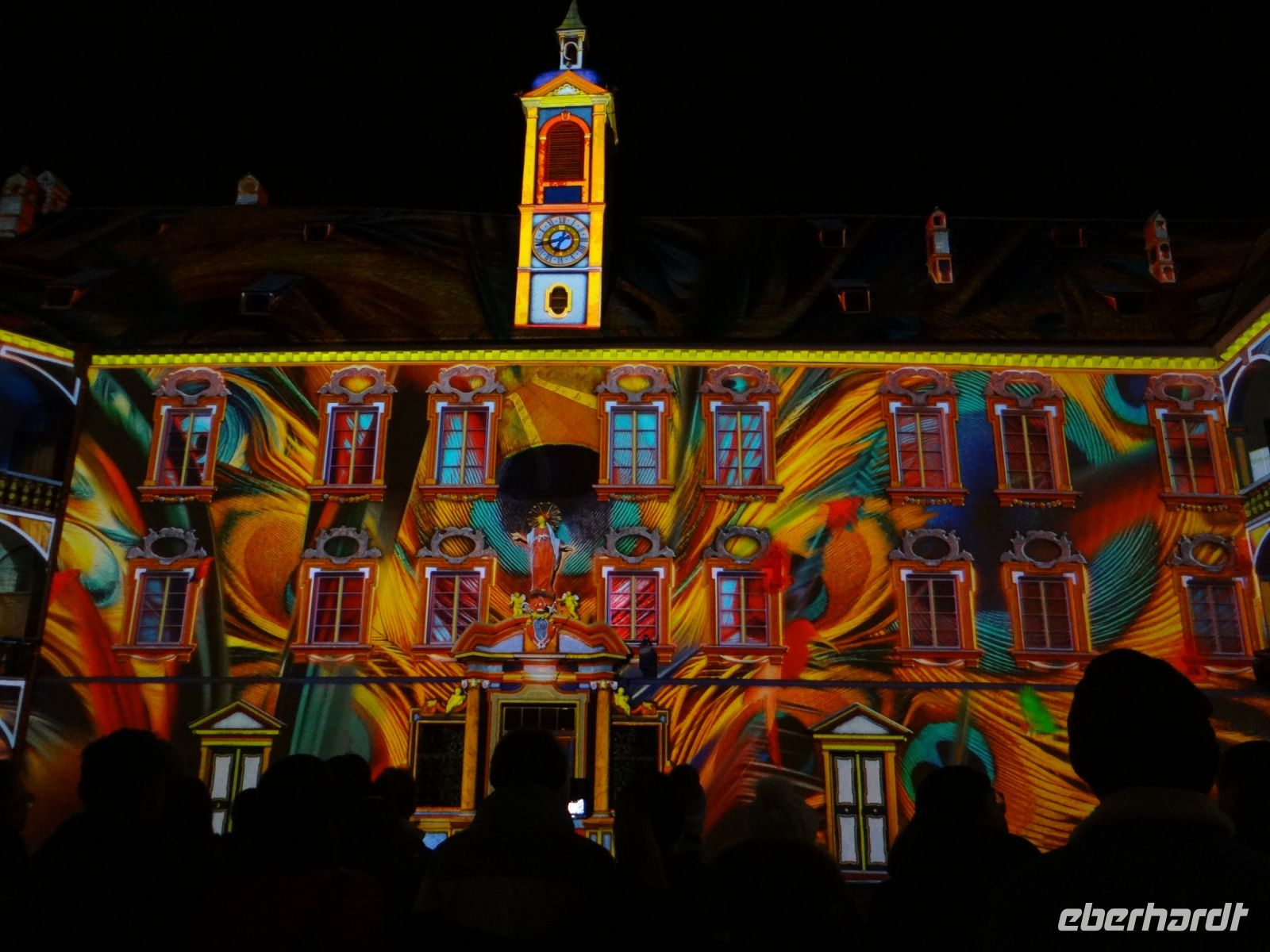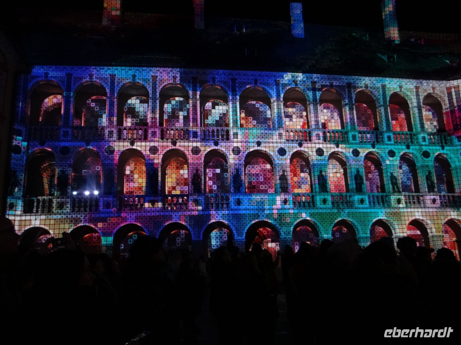 Was uns bei der anstehenden Veranstaltung erwartet, wissen wir nicht ganz genau. Doch das, was wir dann sehen, begeistert uns. Auf drei Seiten des malerischen Innenhofs fließen Farben, Formen und Ornamente ineinander, häufig abgestimmt auf die Fenster und Arkadenbögen. Auch die Madonna über dem Mittelportal und ihre Strahlenkrone werden mit Farbe neu in Szene gesetzt. Fische schwimmen über die Fassade, eine Giraffe, deren langer Hals in den zweiten Stock reicht, marschiert majestätisch an uns vorbei. Es ist ein kindliches Staunen über diese meisterhafte Darbietung.