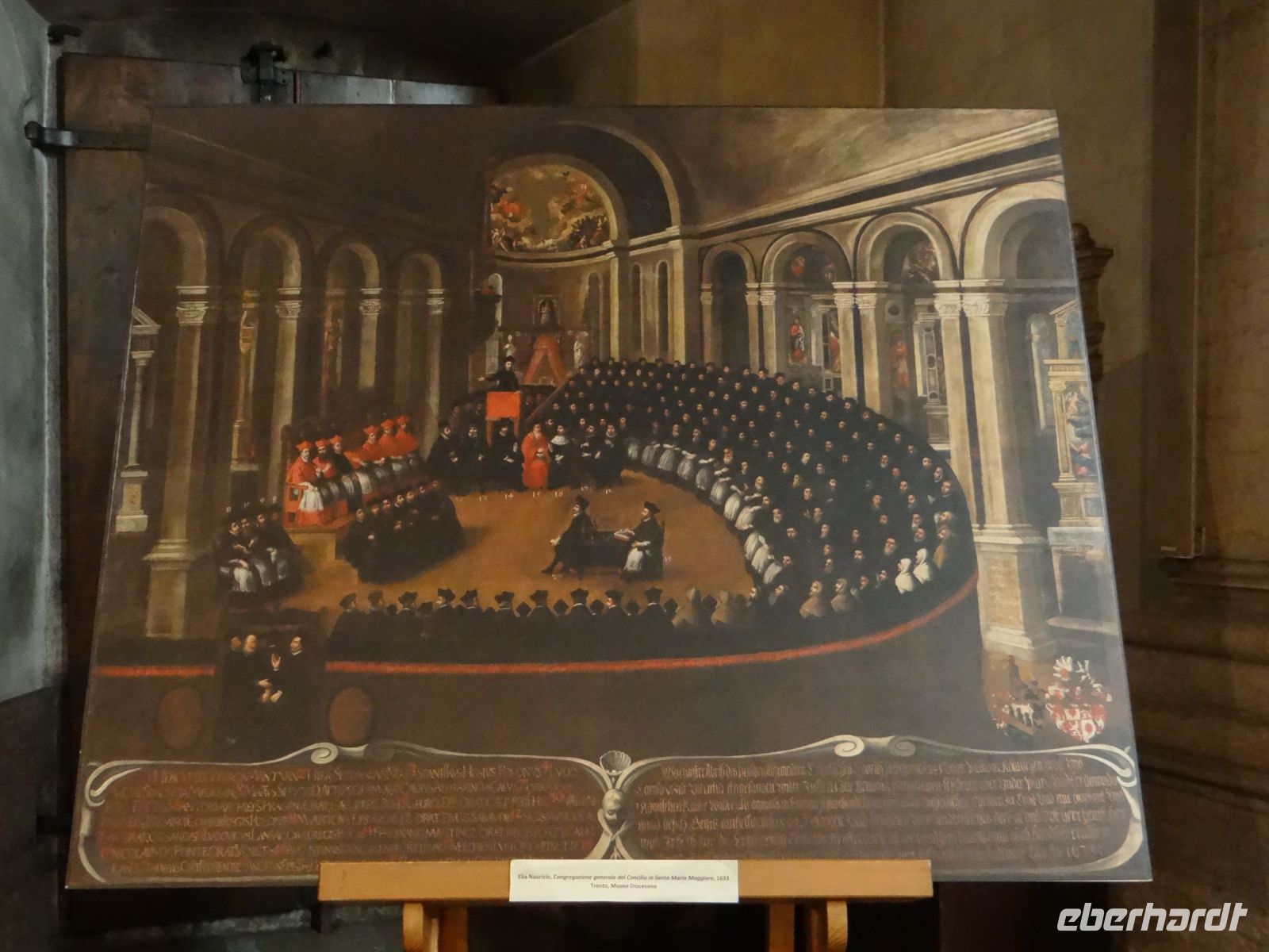 Das Konzil von Trient fand zwischen 1545 und 1563 statt. Die katholische Kirche musste auf die Forde-rungen und Lehren der Reformation reagieren. Doch das gestaltete sich als schwierig und da man sich nicht einigen konnte und die Teilnehmerzahl wuchs, zog man von der Kathedrale in die größere Kirche Santa Maggiore um, die wir besuchen. Die Kopie eines Gemäldes zeigt, wie die werten Herren im Halb-kreis entlang des Hauptschiffes saßen und sich berieten. 25 Sitzungen waren nötig, um zu einer Eini-gung zu kommen. In der Zeit ging es der Stadt sehr gut, denn die Kardinäle, Erzbischöfe, Bischöfe, Ordensgeneräle, Äbte und ihr ganzer Stab mussten nicht nur schlafen und essen, sondern auch mal zum Friseur, die Kutschen vielleicht repariert oder die Sitzpolster darin neu bezogen werden. Kurzum, diese Treffen waren über die 18 Jahre eine gute Einnahmequelle für die Stadt.