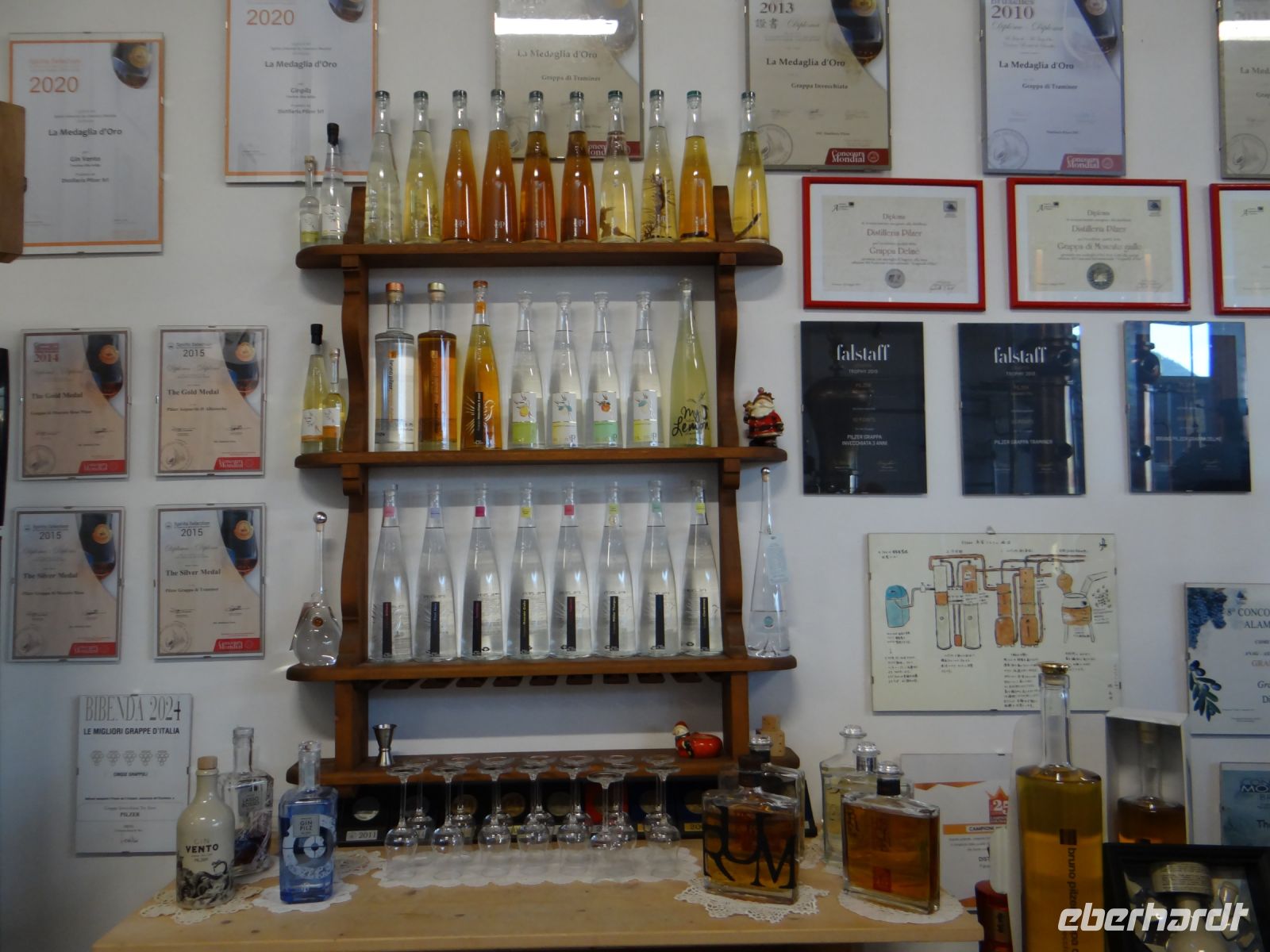 Dann geht es endlich zur Verkostung und wir beginnen mit einem Grappa aus dem Trester der Traube Müller-Thurgau. Beim Verkauf im kleinen Laden wird schnell klar, dass jeder der Gäste seinen Liebling bei der Verkostung gefunden hat, sei es Grappa oder Weinbrand.
