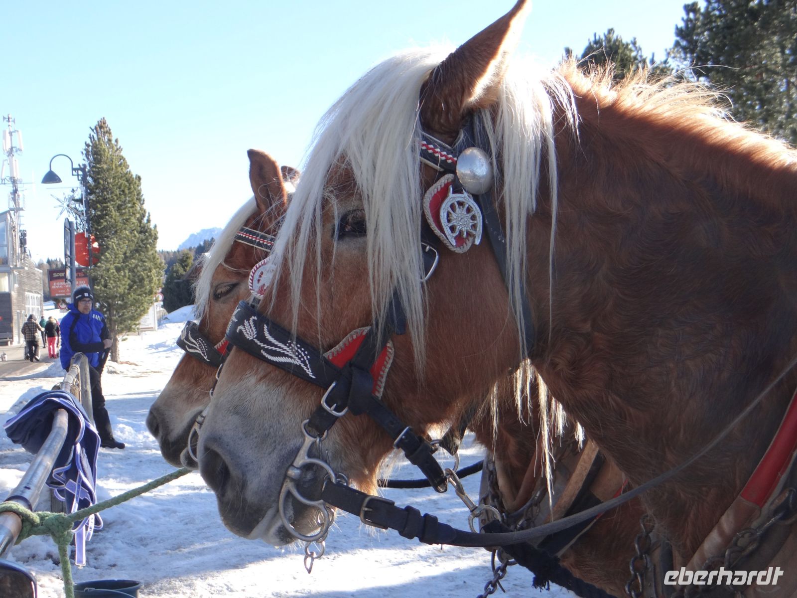 Die erste Gruppe besteigt zwei Kutschen und fährt los. Fröhliche Gesichter bei der Abfahrt, lachende Gesichter bei der Ankunft. Die Kutschen fahren hybrid und haben Kufen wie Räder. Heidi und Ti Amo, unsere beiden Haflinger Stuten, ziehen uns sehr souverän über den Schnee und die Straße. Ich bewun-dere ihre Trittsicherheit im Schnee. Das fällt dem einen oder anderen ja schon mit zwei Beinen schwer.