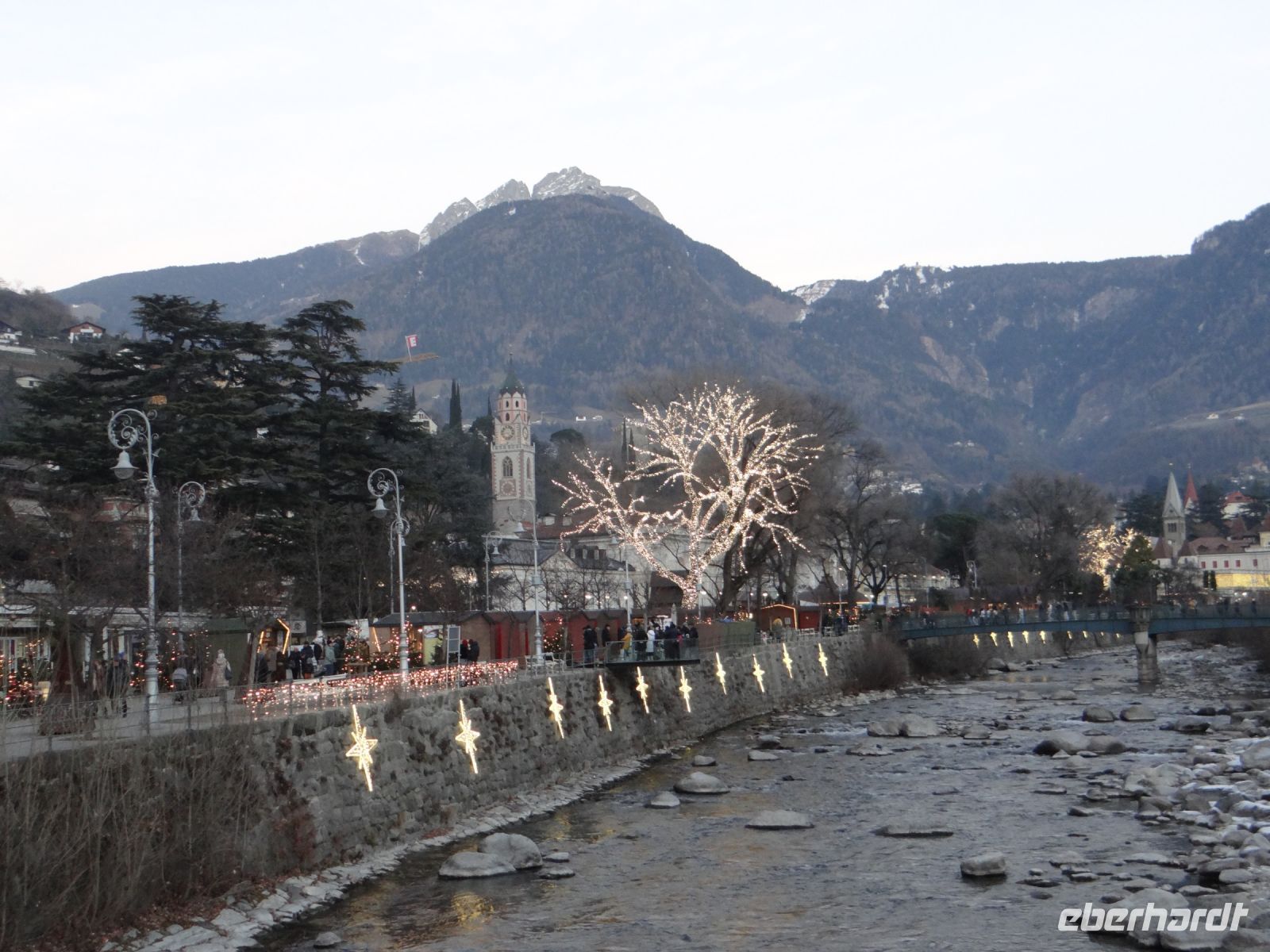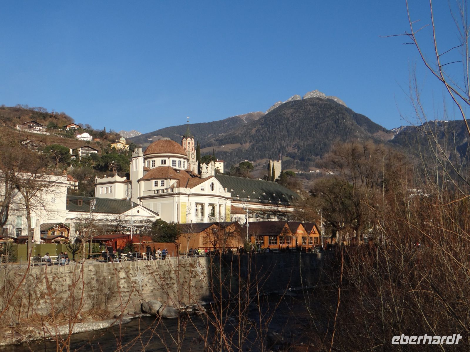 Wir ziehen weiter – nach Meran, einem Kurort. Hier erwartet uns Sonia und führt uns durch den hübschen Ort. Geschützt von hohen Bergen und nach Süden offen, ist Meran für seine milden Winter bekannt. Hier wachsen auch Palmen und andere sonnenverwöhnte Pflanzen. Die Winterpromenade ist hell und von wenigen Bäumen bestanden, die Sommerpromenade spendet Schatten.