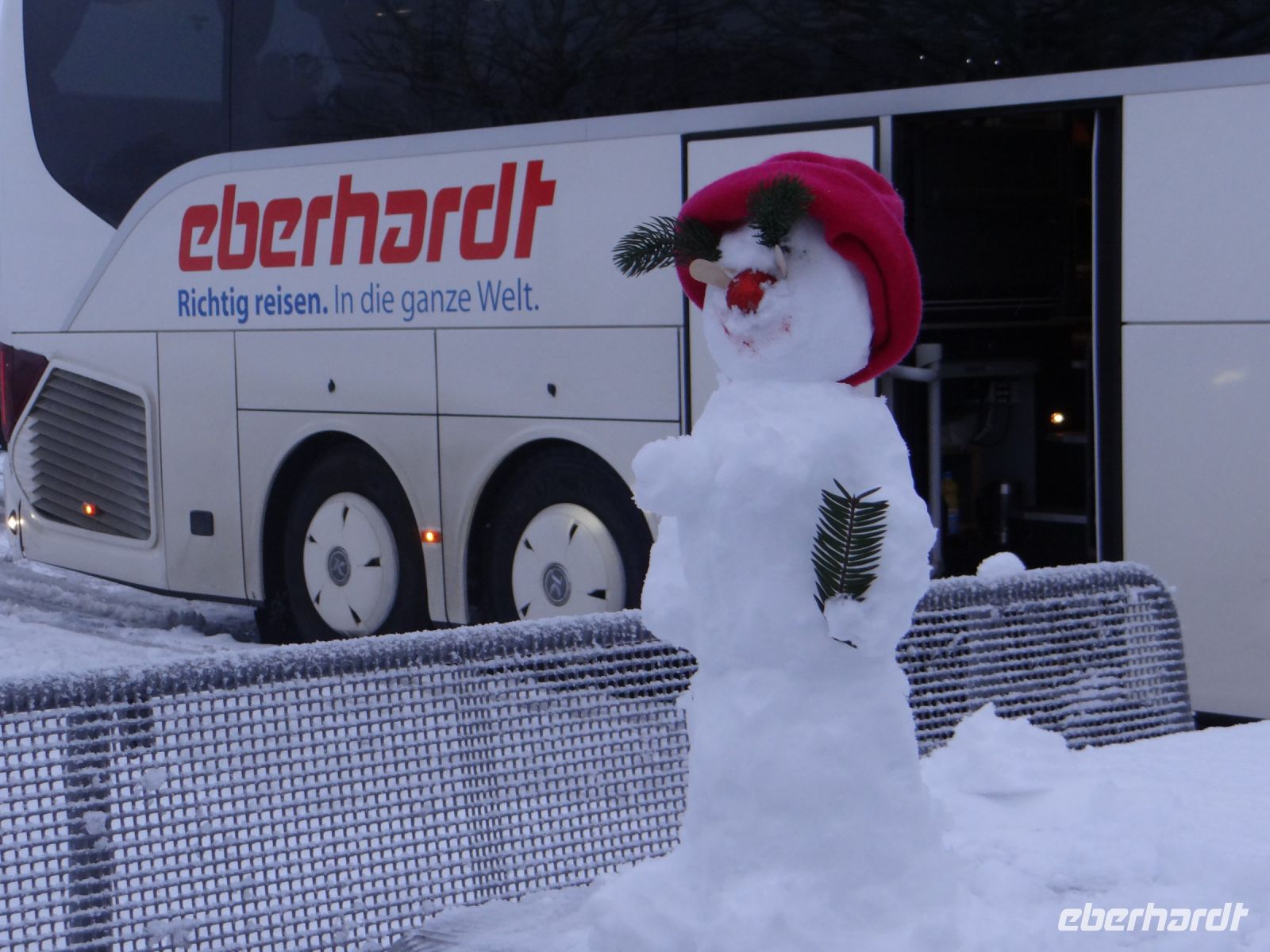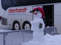 In der Zwischenzeit wechselt Daniel vom Fahrer zum Barkeeper und gibt Getränke aus eigenem Bestand aus: heiße Schokolade oder Kaffee mit Rum. Im Bus ist es schön warm, draußen wächst die Schneefamilie und dann kommt der Transfer - eine Viertelstunde eher. Bitte alles wieder einsteigen, die Fahrt geht weiter. Zurück bleiben unsere Schneeskulpturen, die Erinnerung an diesen Aufenthalt nehmen wir mit.
