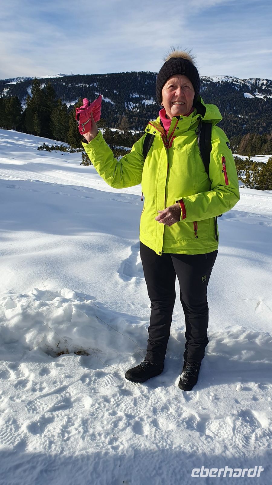 Bereits 8.40 Uhr holten uns Kleinbusse am Hotel ab und brachten uns auf einer sehr aussichtsreichen Strasse hinauf zur Gasserhütte und dort begann unsere erste Winterwanderung im Schnee. Bei herrlichem Sonnenschein genossen wir zunächst die Aussicht hinüber zu den Dolomiten und machten zahlreiche Fotos. Danach wanderten wir durch eine Landschaft gesäumt von Latschenkiefern und Zirben bis zur nächsten Alm und weiter immer stetig leicht bergan zur Mair in Plun Hütte. DORT reservierten wir Plätze für unser Mittagessen. Unser Tagesziel, den Gasteiger Sattel, konnten wir scbon gut sehen und Josef, unser Wanderführer prophezeihte uns, den Sattel in einer Stunde zu erreichen. Der Weg dortbin führte stetig bergauf und zum Schluss in Serpentinen. Am Gasteiger Sattel hatten wir eine gute Sicht nach Süden bis bin zur Texelgruppe bei Meran, zum Ortlermassiv und bis zu den Brenta Dolomiten. Auf dem Weg zurück ins Tal genossen wir die Aussicht bis hin zur Marmolada und die Gipfel auf der Seiser Alm waren ganz nah. In der Hütte stärkten wir uns zu Mittag mit leckeren Suppen und Kaiserschmarrn und wir konnten draussen sitzen in der Sonne und sogar unsere Jacken ausziehen. Was für ein toller Tag ! Das letzte Stück unserer Wanderung führte über Skipisten zurück zur Gasser Hütte und dort holten uns die Busse wieder ab und brachten uns zurück ins Hotel.