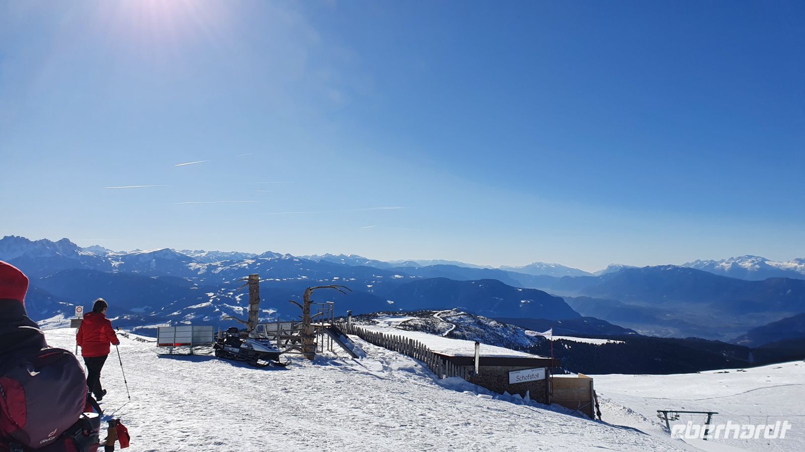 Heute fuhren wir alle zusammen mit einem Bus zunächst im Eisacktal abwärts und dann auf der alten Kaiserstrasse hinauf nach Pemmern zur Seilbahnstation. In einer Umlaufkabinenbahn schwebten wir hinauf auf 2071 m Höhe zur Schwarzseespitze. Schon da hatten wir eine fantastische Sicht auf die umliegenden Gipfel. Viele Skifahrer waren mit uns unterwegs. Wir wanderten auf dem Premium Panorama Weg hinauf Richtung Rittener Horn. Der Gipfel war schon weithin zu sehen und die Aussicht konnte nicht besser sein. Wir hatten den perfekten Tag erwischt. Beim Aufstieg pfiff uns ein frischer Wind um die Nase und im Gegenlicht der Sonne glänzten die grossen Schneeflächen ganz silbern. Kurz vor 12 Uhr kamen wir oben an und Josef erklärte uns zunächst alle Bergmassive mit den wichtigsten Gipfeln. So konnten wir recht gut König Ortler und die Königsspitze, das Brentamassiv, den Mendelkamm, Latemar, Rosengarten, Schlern, ganz hinten die Marmolada, Plattkofel und Langkofel, das Sellamassiv, die Geisslerspitzen , den Peitlerkofel, Plose und die Berge des Alpenhauptkammes erkennen und noch viele Gipfel mehr. Heute war der Tag unseres Bergfestes und dazu durfte jeder einen "winzigen Schluck" vom Zirbenschnaps probieren. Für den Abstieg nahmen wir den gleichen Weg und kehrten unterwegs in der Felturner Hütte zu mittag ein. Es war sehr voll und dauerte lange bis jeder sein Essen hatte. Auf dem Rückweg zur Seilbahnstation nahmen wir einen anderen Weg , der nochmals fantastische Ausblicke bereit hielt. Auf der Busrückfahrt legten wir in Klobenstein am Ritten einen Stopp ein und Josef zeigte uns die berühmten Erdpyramiden und wir waren dem Schlern ganz nah. Gegen 17 Uhr erreichten wir unser Hotel und da war noch genügend Zeit, um den Wellnessbereich vor dem Abendessen zu nutzen.