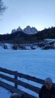 Heute gab es einen Geburtstag in der Gruppe zu feiern. Und nach dem Frühstück fuhren wir diesmal zusammen mit den Schneeschuhwanderern ins Völlnesstal, dort wo Reinhold Messner aufgewachsen ist. An der Zanser Alm am Fusse der Geisslerspitzen stiegen wir aus und begannen unsere Wanderung. Der gut präparierte Weg führte durch den Wald immer bergan. Wir kamen zu einer großen Alm und da war der Blick frei bis hinauf zur Schlüterhütte. Wir wanderte weiter bergan durch diese zauberhafte Almenlandschaft und hatten das gewaltige Massiv der Geisslerspitzen immer rechts neben uns. Der Weg wurde steiler und traf mit der Rodelbahn zusammen. Da war Vorsicht geboten, als die ersten Rodler uns entgegen kamen. Schliesslich erreichten wir die Hütte der Gampenalm und kehrten ein zum Mittagessen. Im Gegensatz zum Vortag ging es hier ganz schnell mit dem Servieren und alles schmeckte vorzüglich. Auf dem Rückweg nahmen wir eine andere Route und waren somit den Geisslerspitzen noch näher. Der Weg bergab liess sich gut laufen und so waren wir bereits 14 Uhr wieder unten auf der Zanser Alm- viel zu früh. Josef empfahl uns deshalb noch den Naturlehrpfad zu gehen und der war sehr angenehm und im Sommer sogar für Rollstuhlfahrer geeignet .
