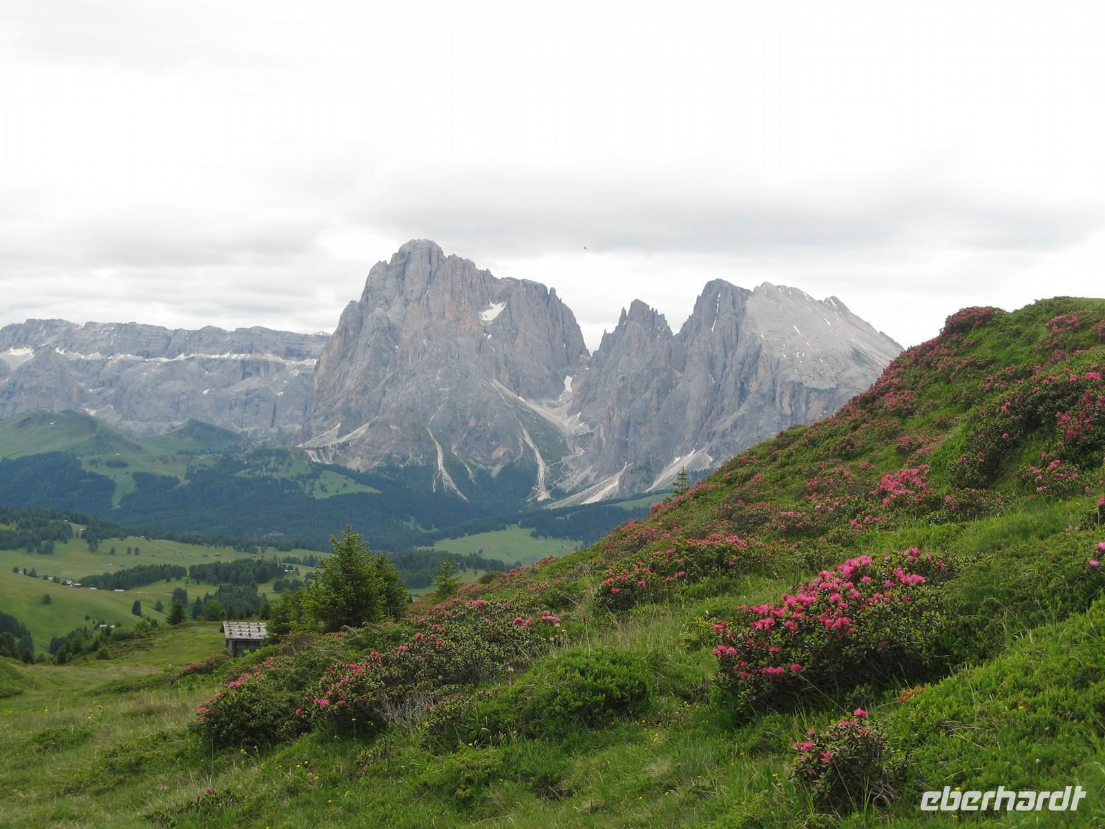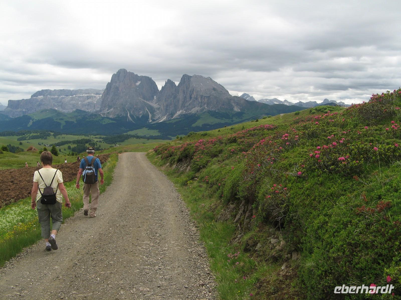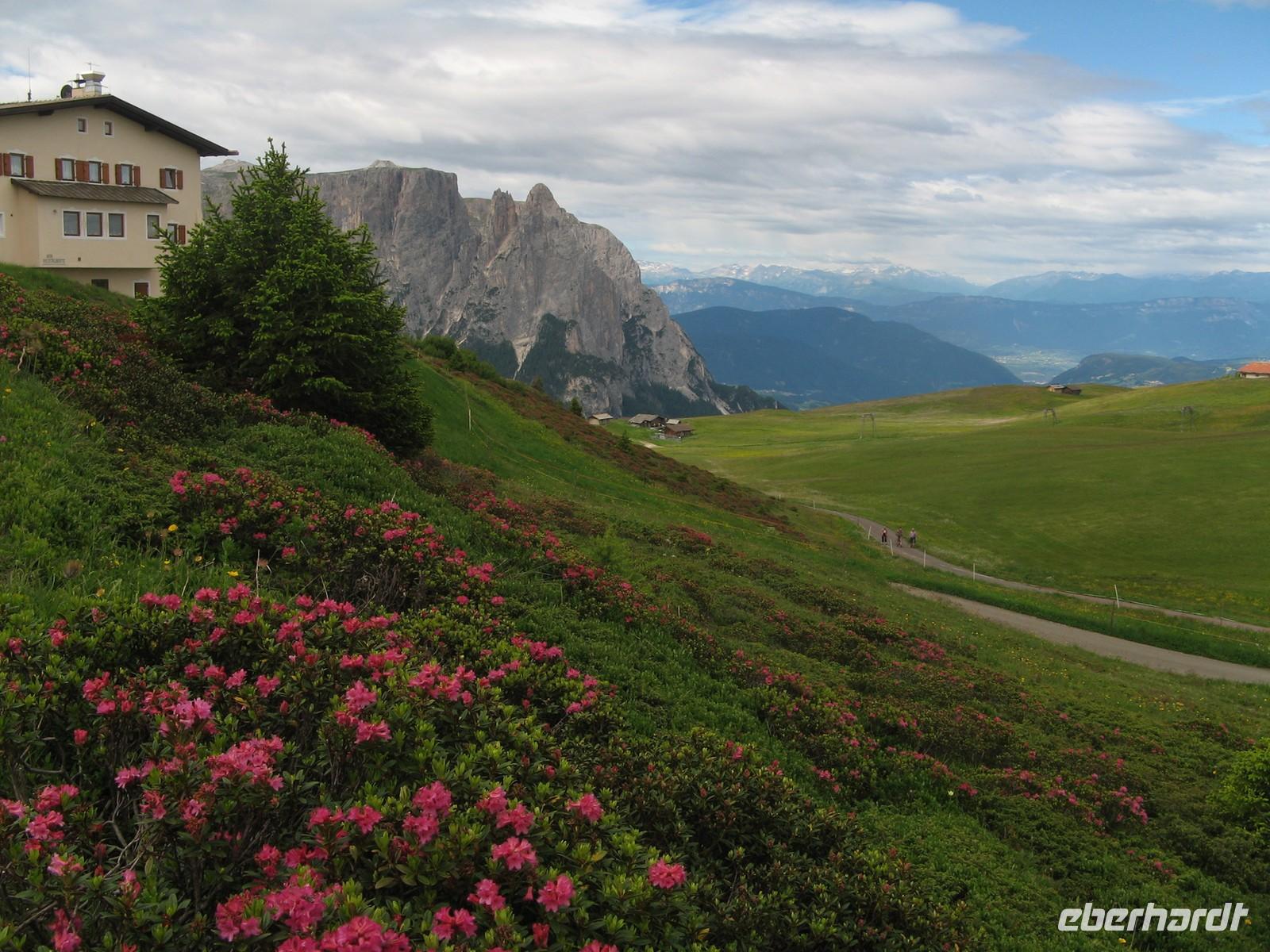 Zwischendurch genießen wir die Blicke über die Seiser Alm, zum Schlern, zum Langkofel, den Blick in das Grödner Tal und weiter bis zu den schneebedeckten Bergen der Zillertaler Alpen. Wir können Kastelruth sehen und die Sarntaler Alpen mit dem Ritten. Und natürlich viele Alpenblumen, Enzian, Alpenrosen, Arnika, Trollblumen und viele mehr. Am Nachmittag machen wir einen kurzen Abstecher in Kastelruth zum Spatzenladen, um dann noch in St.Ullrich einen kleinen Stadtbummel zu unternehmen und uns bei einem Eis zu laben. Nach dem Abendessen bereitet uns Maria mit ihrem Akkordeon und ihren Liedern einen lustigen Abend.