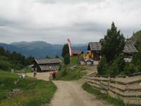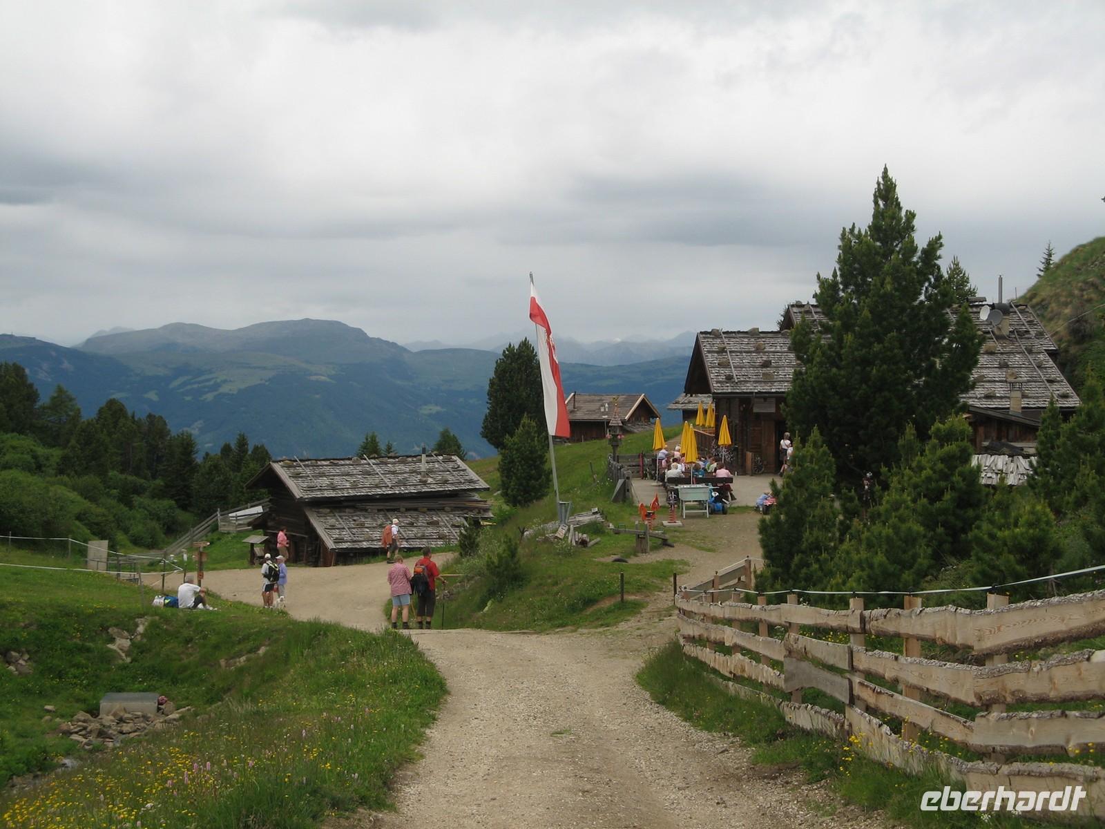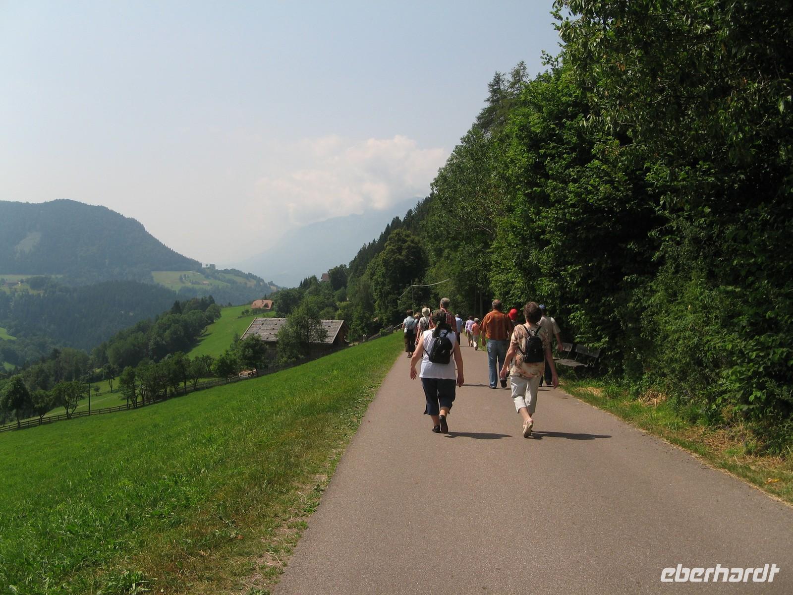 Es ist wieder sehr warm, aber halb Elf machen wir uns mit unserem Wirt, Herrn Wieser, auf den Weg. Drei Gäste, die nicht so gut zu Fuß sind, hat der Wirt schon mit dem Auto zum Rofisboden gebracht. Sie erwarten uns mit Speck, Käse, Brot und Wein auf einer Waldwiese auf schattigem Picknick-Platz. Es werden zwei schöne gesellige Stunden für unsere Gruppe.