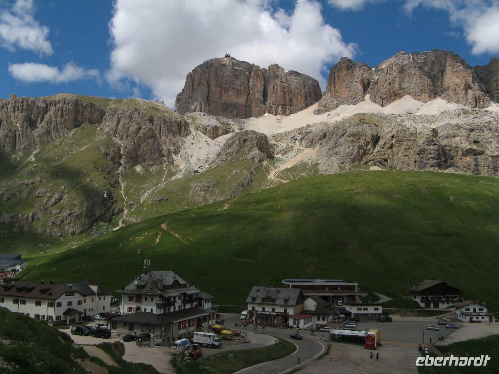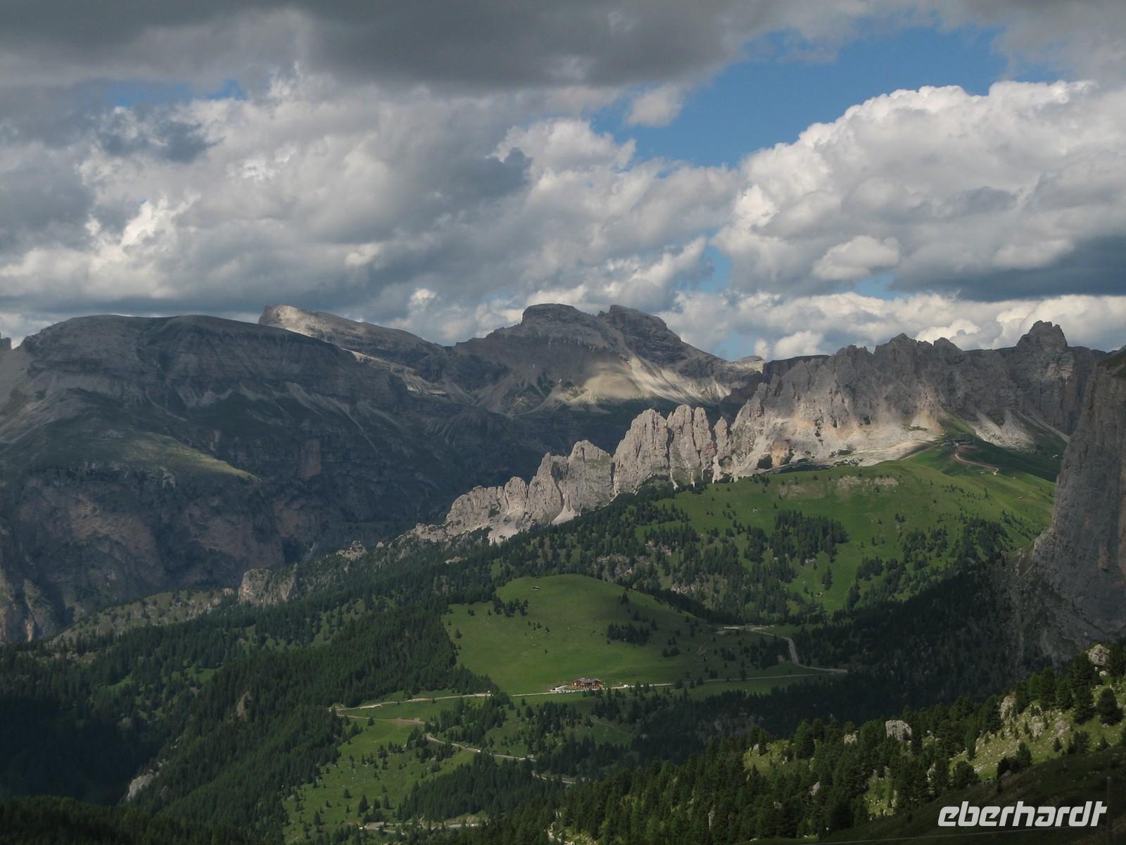 Weiter einige Kehren hinab, dann wieder hinauf zum Sellapass, der höchste Pass unserer Tour mit 2240 m. Da Andre keinen Parkplatz findet, machen wir einen Fotostopp mit herrlichem Blick auf die Langkofelgruppe und zum Grödnerjoch. Durch das Grödnertal bringt uns der Bus wieder zurück nach Stilfes.