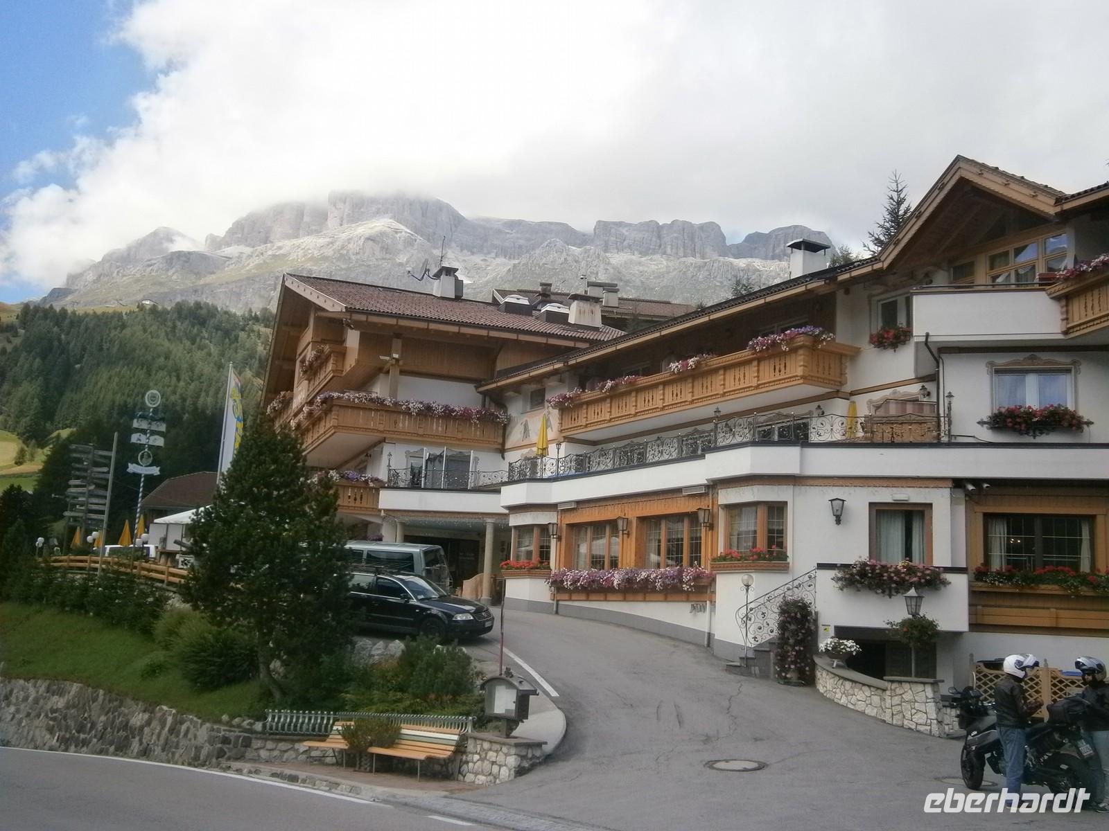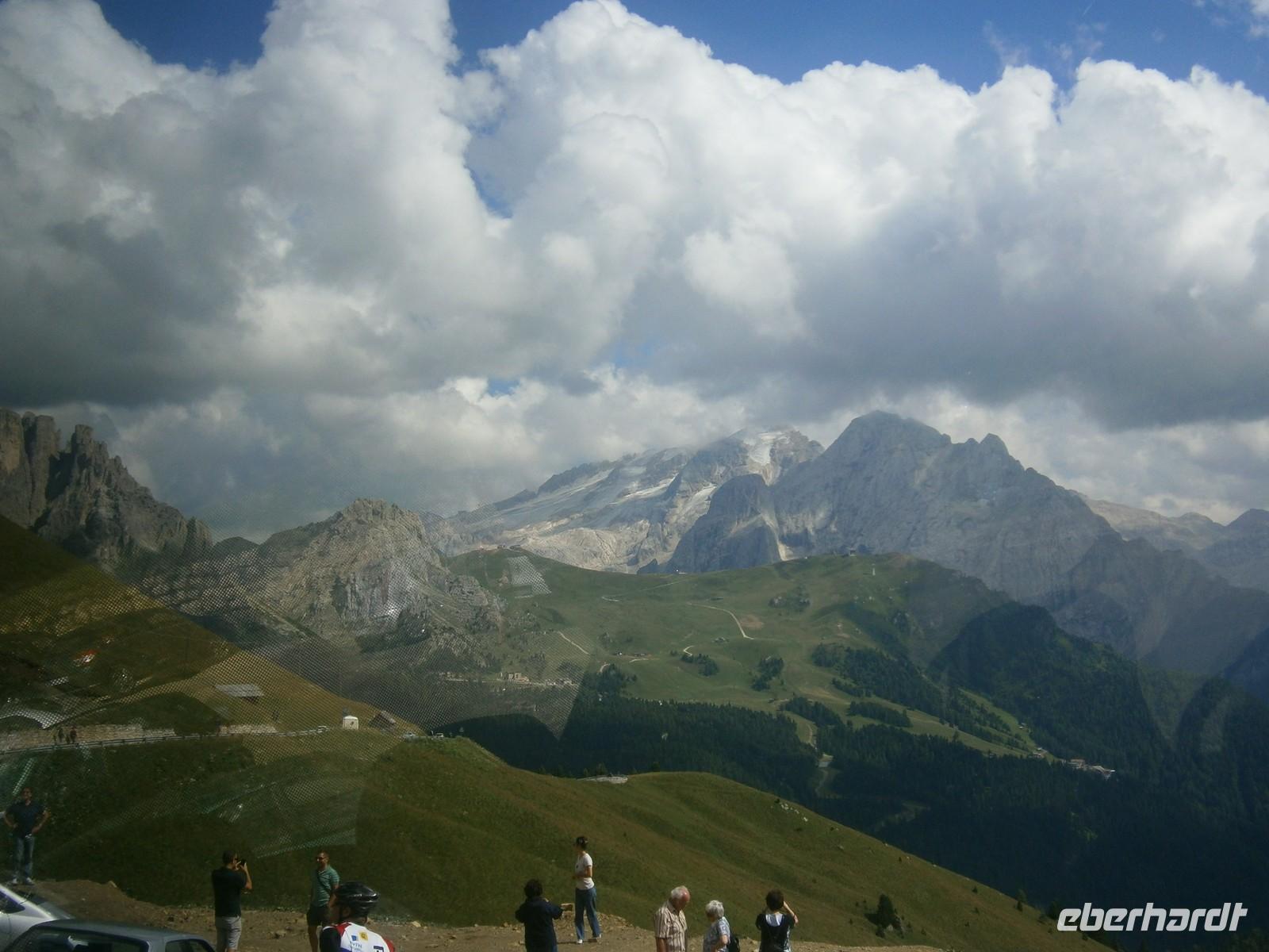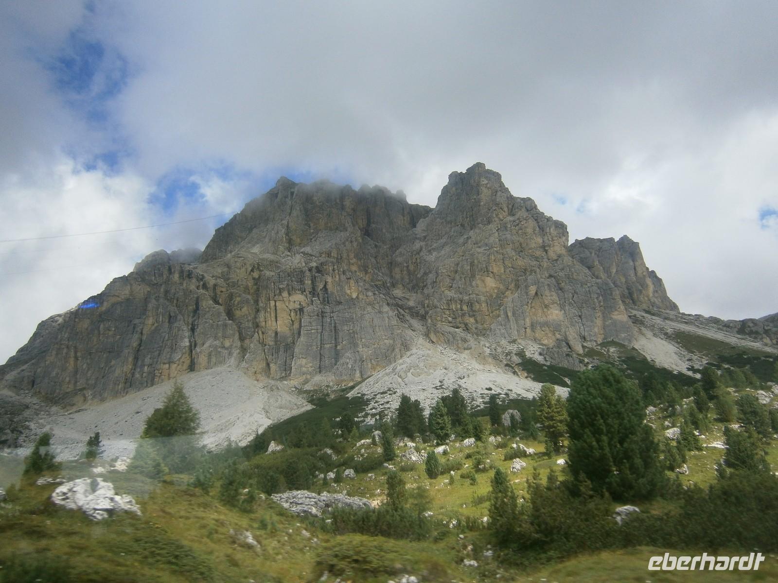 Während unserer Weiterfahrt geht eröffnen sich immer wieder phantastische Ausblicke auf die Bergwelt der Dolomiten. Monte Christallo, die Sellagruppe, die Marmolada. Es geht buchstäblich bergauf und bergab und wir überfahren eine Vielzahl an Passübergängen: