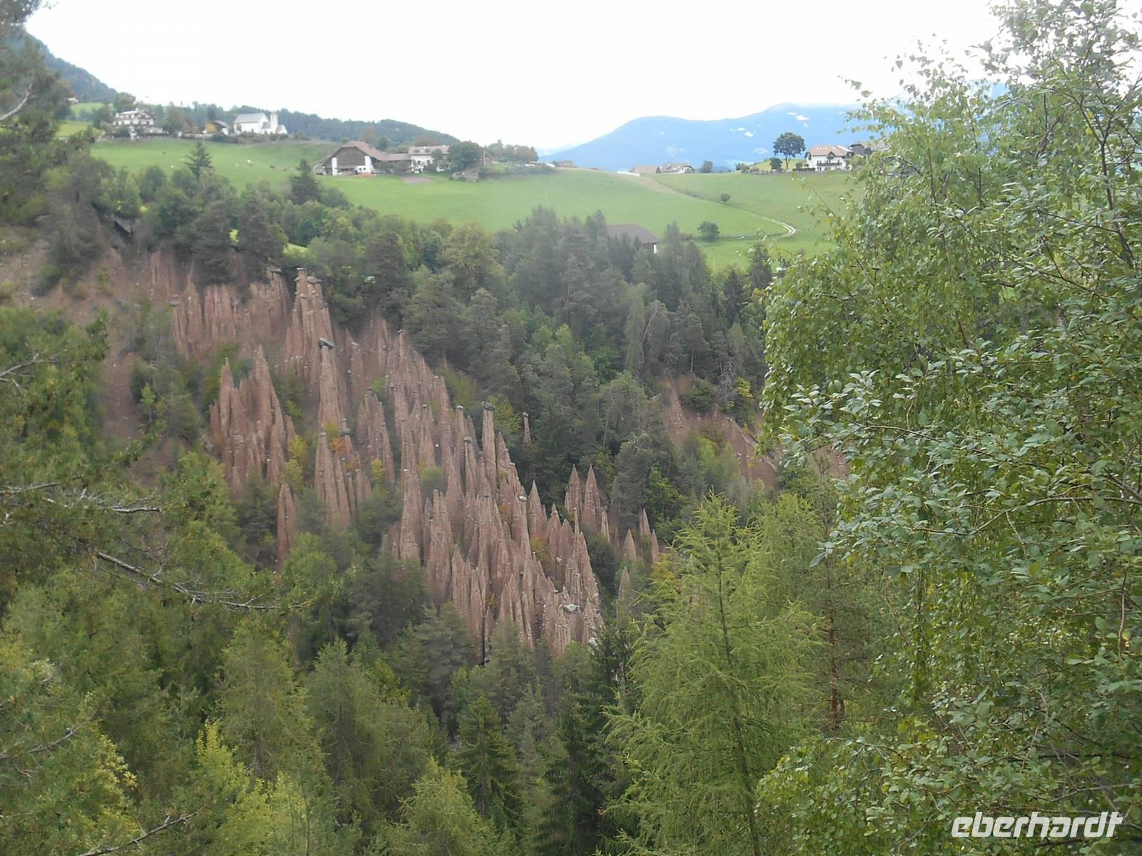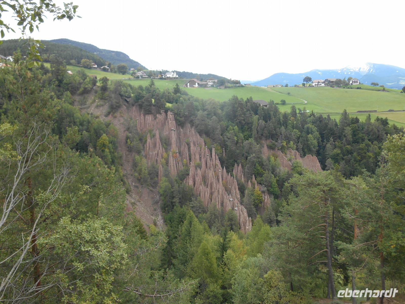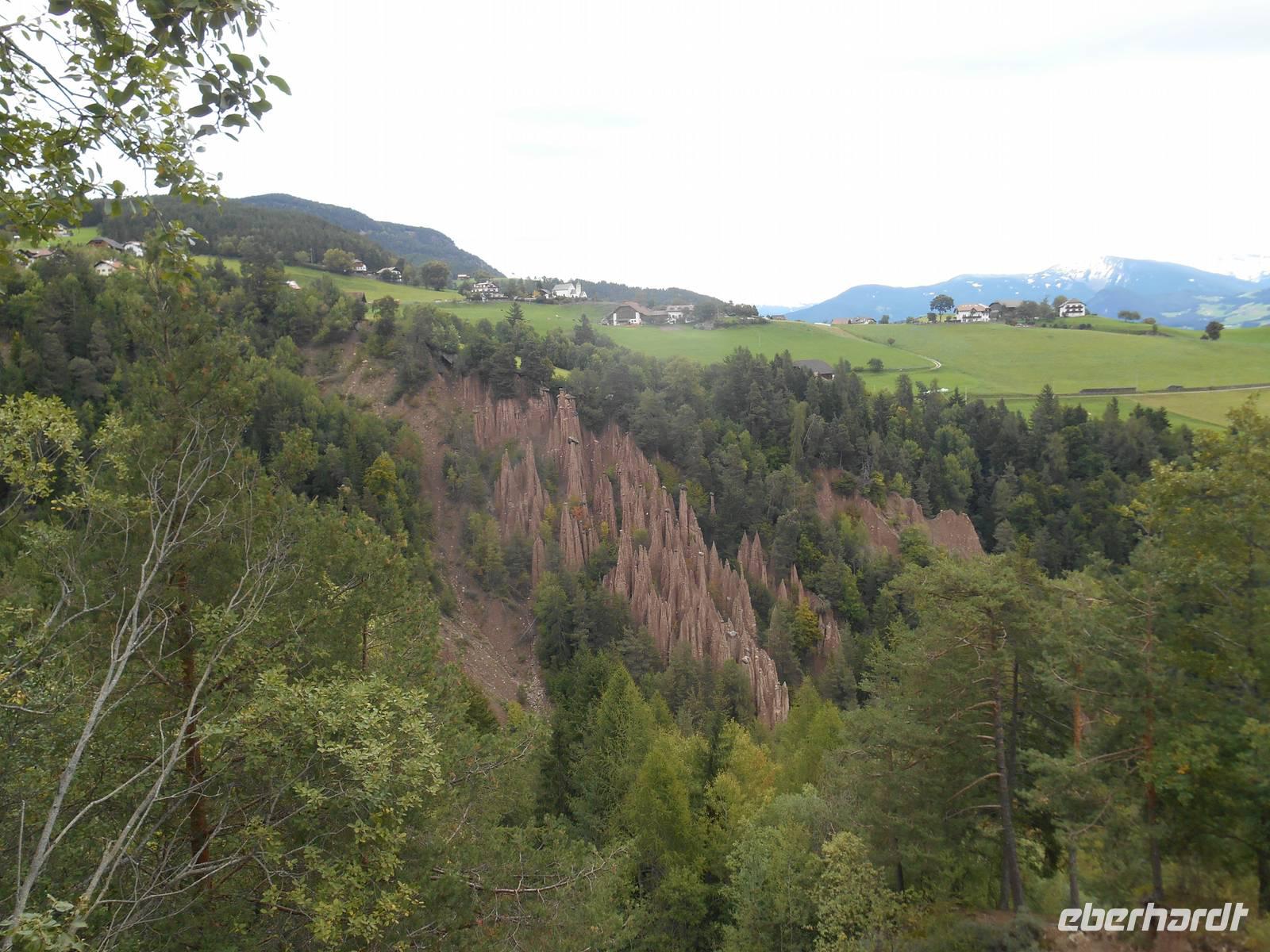 Unser Bus brachte uns zuerst in die größte Stadt Südtirols, nach Bozen, heute u. a. Sitz der Landesregierung, Universitätsstadt und auch Bischofsstadt. Gemeinsam ging es vom Parkhaus zu Fuß in nur knapp zehn Minuten in die „gute Stube" Bozens, dem Waltherplatz. Davor erhebt sich der mächtige Dom Maria Himmelfahrt. Herz der Stadt sind natürlich die Lauben - Tür an Tür laden hier Boutiquen, der traditionsreiche Obstmarkt und natürlich die Feinkostläden, für die Bozen über die Stadtgrenzen hinaus bekannt ist, zu jeder Jahreszeit zum Bummeln und Flanieren ein. Nach einem kurzen Rundgang durch die historische Altstadt endete unsere kleine Führung am Archäologischen Museum, welches einige unserer Gäste besuchten. Hier ist die Geschichte von Südtirol dokumentiert und ausgestellt. Modelle, Rekonstruktionen und Videos geben auf anspruchsvolle und unterhaltsame Weise einen Einblick in die frühe Vergangenheit des Alpenraums. Und der Star in diesem Museum ist natürlich „Ötzi", der Mann aus dem Eis. Nach dem Mittagessen fuhren wir mit unserem Bus auf den Ritten hinauf, der einstigen Sommerfrische der Bozner. Die Fahrt ging vorbei an den Weinhängen, führte durch kleine Orte, immer mit herrlichem Blick auf die gegenüberliegende Bergwelt und ins Eisacktal. In Lengmoos angekommen, gelangten wir dann auch nach einem kurzen Spaziergang zu den bekannten Rittner Erdpyramiden, die bis zu 15 Meter hoch sind. Sie bestehen aus Lockermaterial, welches aus eiszeitlichen Moränen heraus gewittert wurde, in denen sich Porphyr- und Granitblöcke befinden. Beschirmt durch Platten, hält der Unterbau, stürzt allerdings die Platte ab, wird auch die Pyramide rasch zerstört. Am Abend verwöhnte uns die Hotelküche mit einem reichhaltigen Südtiroler Abendessen.