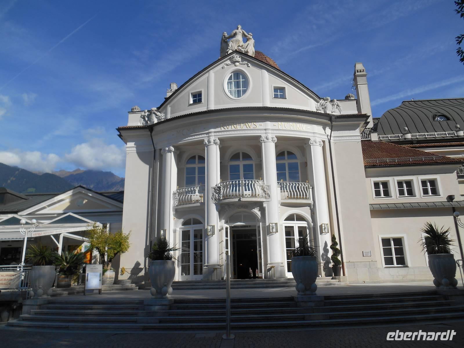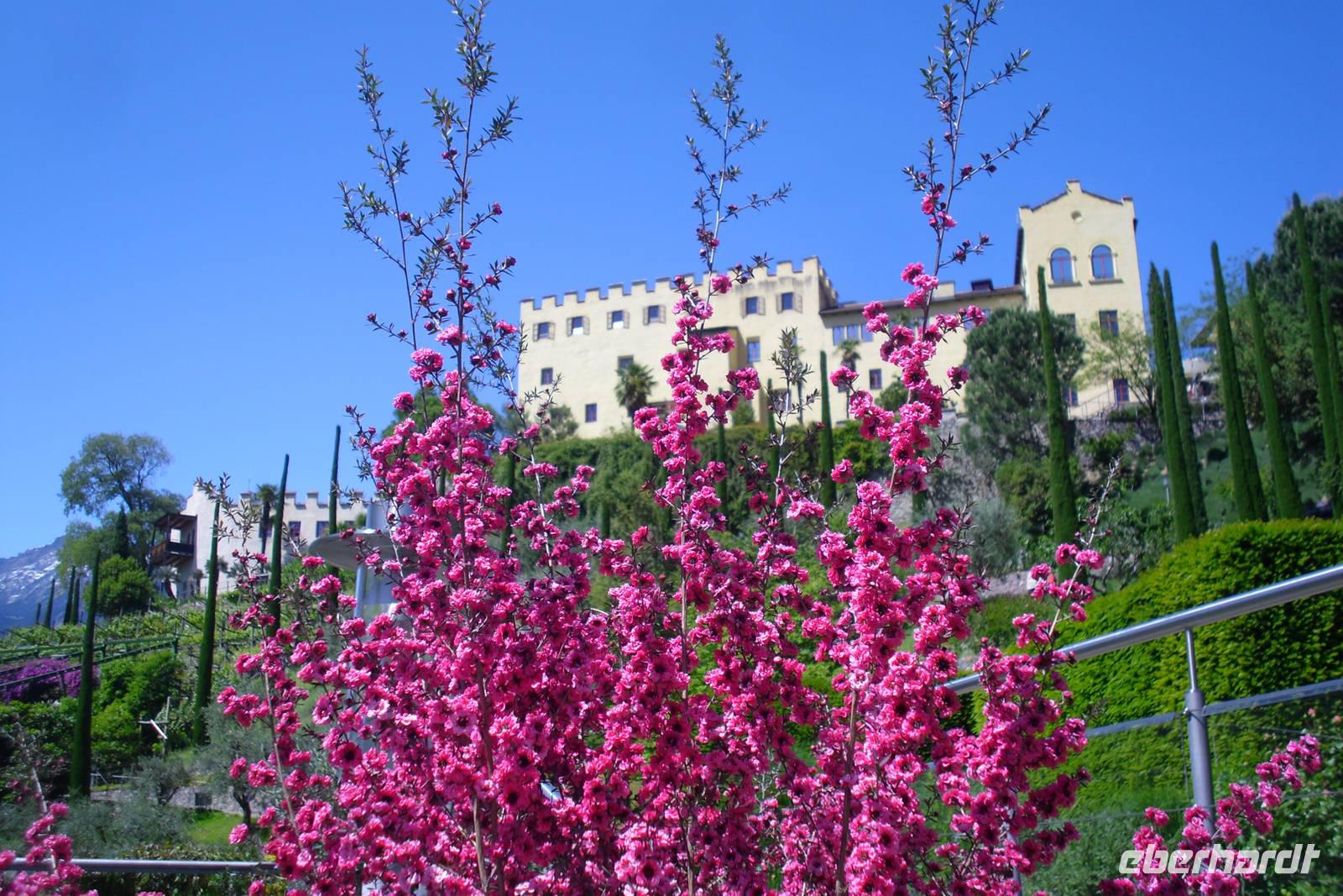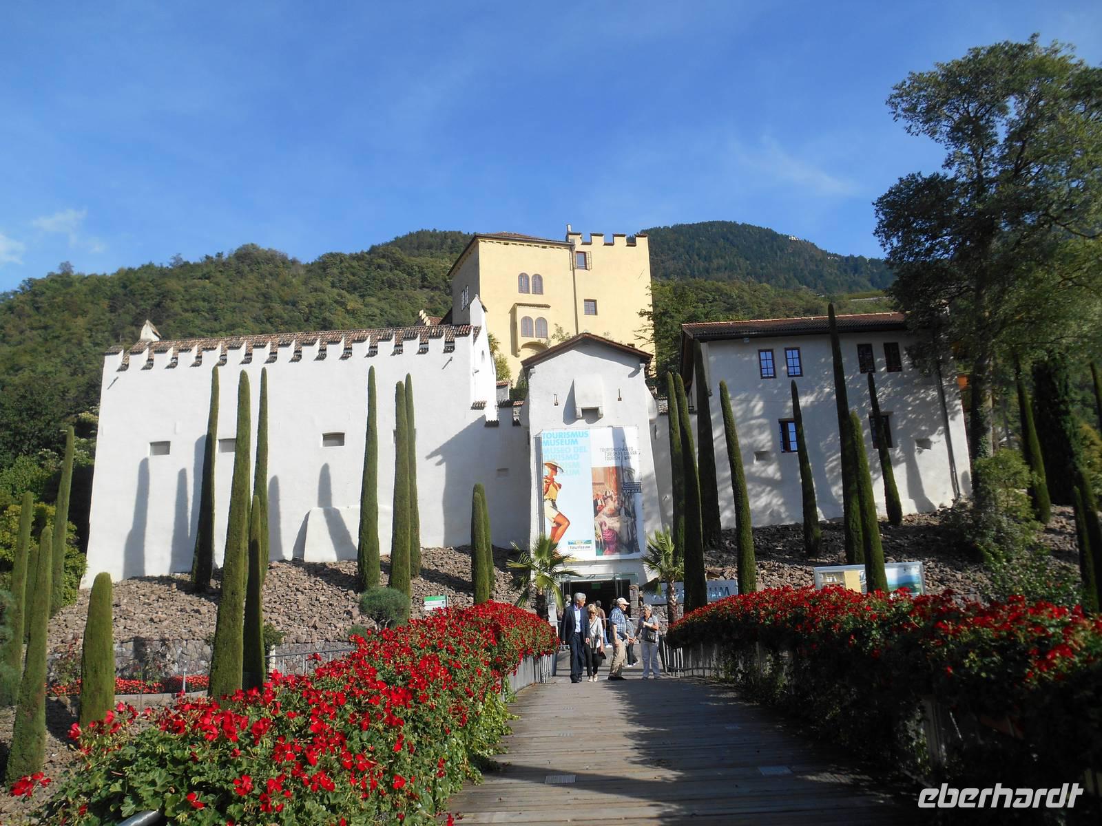 Am Vormittag erreichten wir Meran, für Südtiroler Verhältnisse haben wir es hier übrigens mit einer Großstadt zu tun - zwar nicht auf dem Papier und in den Statistiken, dafür reichen die gut 30.000 Einwohner der zweitgrößten Stadt Südtirols nicht aus - aber die Atmosphäre der Stadt an der Passer ist weltstädtisch-hektisch geprägt. Immer noch, obwohl die Glanzzeiten, als sich Adel und wohlhabendes Bürgertum aus ganz Europa in der habsburgischen Kurstadt tummelten, längst vorbei sind. Heute wird der verblichene Ruhm eher künstlich gepflegt und poliert. Meran liegt in einem weiten Talkessel, umgeben von Bergen. Nur nach Süden öffnet sich der Kessel weitflächig im breiten Tal der Etsch. Von den Gebirgsketten gegen die rauen Nordwinde geschützt, hat Meran ein überaus mildes, fast schon mediterranes Klima. Wir unternahmen einen kleinen gemeinsamen Stadtrundgang und sahen so beispielsweise das Stadttheater, eines der wenigen erhaltenen Jugendstiltheater Europas. Wir spazierten weiter durch die Laubengasse, deren ältesten Häuser in der zweiten Hälfte des 13. Jahrhunderts erbaut wurden und den Reichtum des aufstrebenden mittelalterlichen Städtchens widerspiegeln. Sehenswert ist auch die Stadtpfarrkirche St. Nikolaus aus dem frühen 14. Jahrhundert, die reiche Innenausstattung vereinigt die Kunstauffassungen von der Gotik bis zum Barock. Die meisten nutzen die freie Zeit in Meran für einen ausgiebigen Bummel auf der Kurpromenade - das Alte und das Neue Kurhaus, die Bauelemente des Klassizismus und des Jugendstils vereinigen, stehen nebeneinander. Den Nachmittag verbrachten wir auf dem Gelände des unweit von hier entfernten Schlosses Trauttmansdorff. Am sonnigen Hang oberhalb von Meran, wo einst Kaiserin Sissi flanierte, erstrecken sich die blühenden Gärten von Schloss Trauttmansdorff. Hier erhielten wir Einblicke in exotisch-mediterrane Landschaften, Ausblicke auf die umliegenden Bergketten und die Stadt Meran - die Gärten von Schloss Trauttmansdorff versammeln in einem natürlichen Amphitheater über 80 Gartenwelten. Nach sieben Jahren Bauzeit im Juni 2001 eröffnet, erstrahlt das Gesamtkunstwerk heute in seiner ganzen Pracht. 2005 wurde die 12 Hektar große Anlage sogar zum schönsten Garten Italiens gekürt! Inmitten der Gärten thront das Schloss, das Graf Trauttmansdorff 1850 aus mittelalterlichen Ruinen wieder errichten ließ. Kaiserin Elisabeth, Sissi, schätze Schloss Trauttmansdorff ab 1870 als Wintersitz. Heute beherbergt es das „Touriseum", Südtirols Landesmuseum für Tourismus, das uns auf höchst unterhaltsame Weise etwa zweihundert Jahre alpine Tourismusgeschichte näher brachte.
