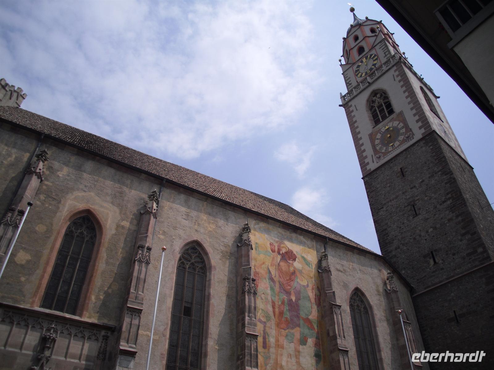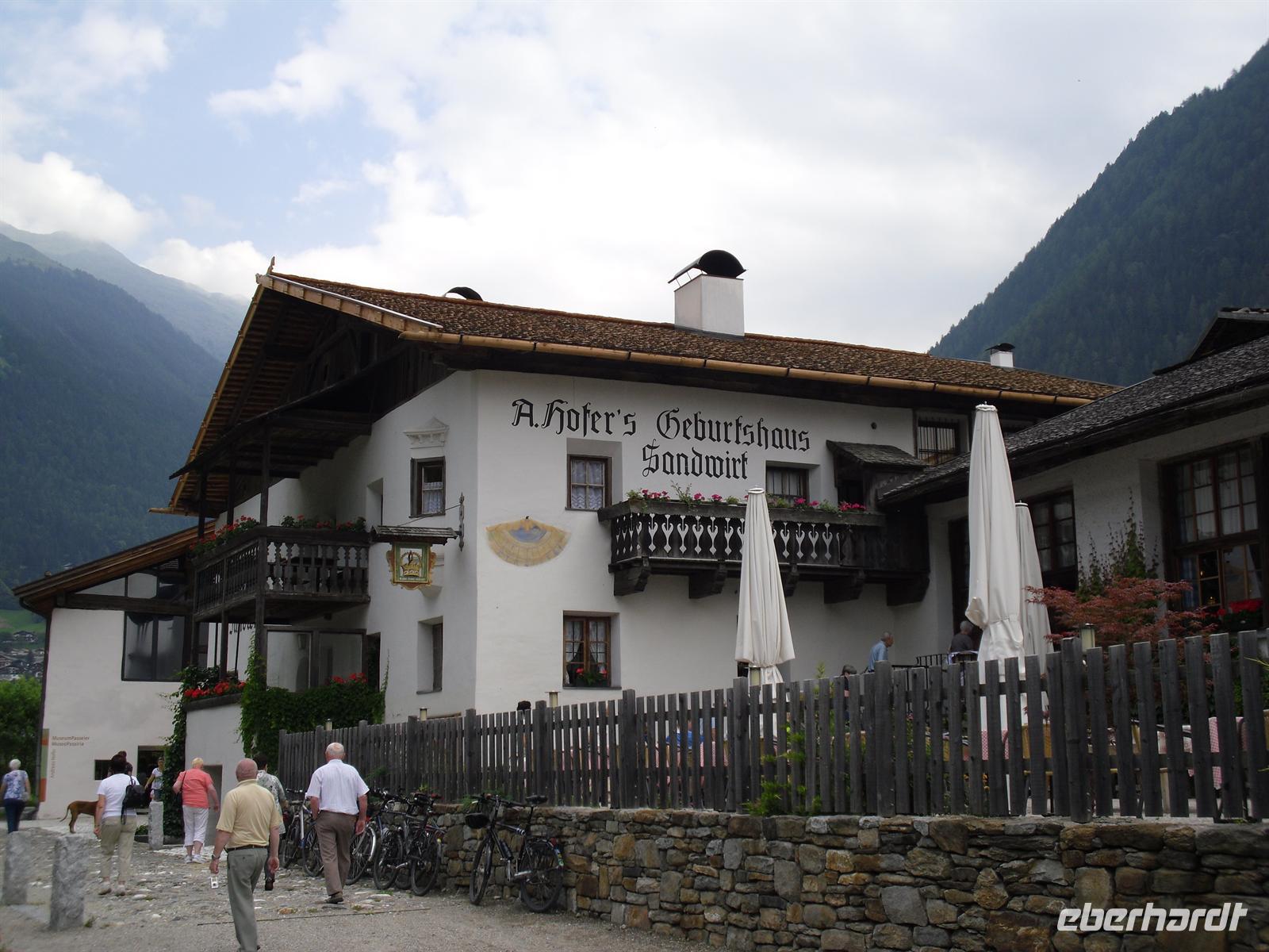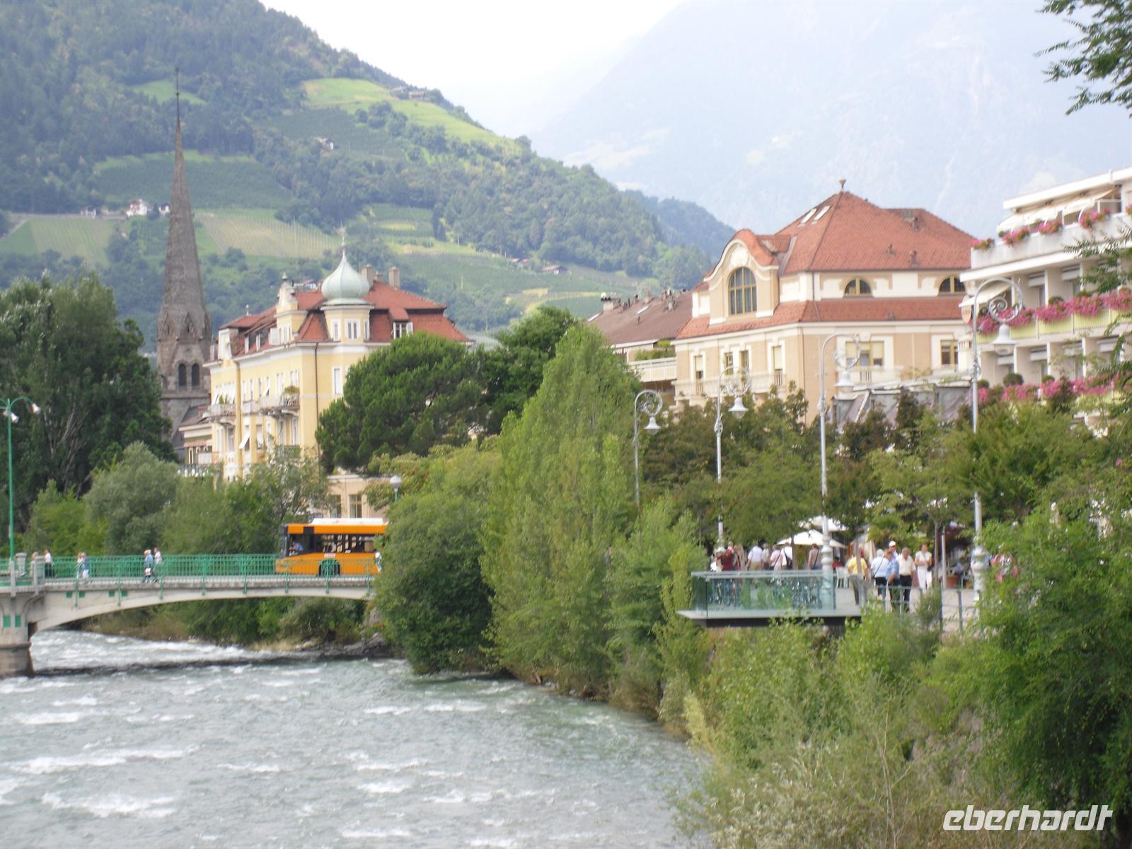 Einen Stopp legen wir unter anderem am berühmten Gasthof „Sandhof“, dem Geburtshaus des Tiroler Freiheitshelden Andreas Hofer, ein. Ein Nebengebäude des Gasthofes ist als Museum eingerichtet und in einer eher schlichten Ausstellung wird Hofer hier als Held verherrlicht. Gegen Mittag erreichen wir Meran, für Südtiroler Verhältnisse haben wir es hier mit einer Großstadt zu tun - zwar nicht auf dem Papier und in den Statistiken, dafür reichen die gut 30.000 Einwohner der zweitgrößten Stadt Südtirols nicht aus - aber die Atmosphäre der Stadt an der Passer ist weltstädtisch-hektisch geprägt. Immer noch, obwohl die Glanzzeiten, als sich Adel und wohlhabendes Bürgertum aus ganz Europa in der habsburgischen Kurstadt tummelten, längst vorbei sind. Heute wird der verblichene Ruhm eher künstlich gepflegt und poliert. Meran liegt in einem weiten Talkessel, umgeben von Bergen. Nur nach Süden öffnet sich der Kessel weitflächig im breiten Tal der Etsch.