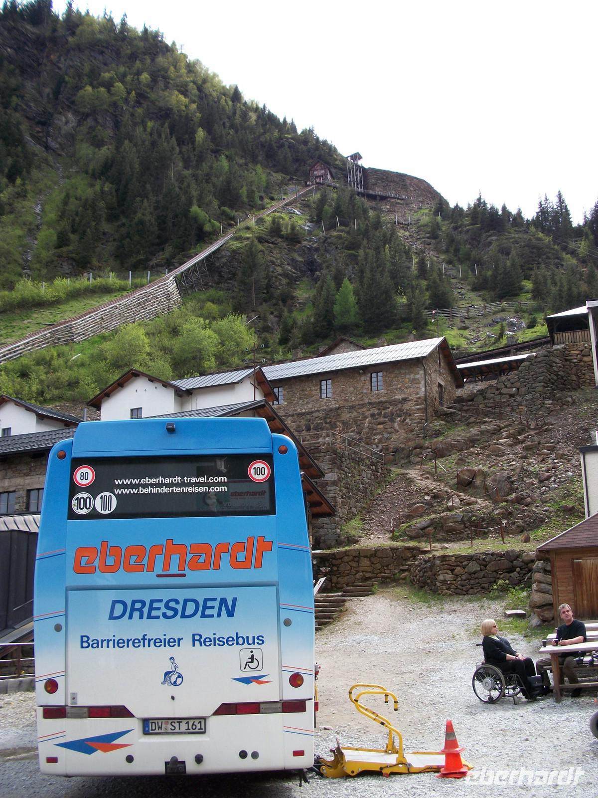 Nach einem entspannten Frühstück beginnen wir gegen neun Uhr unser Gepäck in den Bus zu verladen. Das Hotel Alpin mit seiner hervorragenden Küche, den auf die Ansprüche von Rollstuhlfahrern ausgelegten Zimmern, ja sogar einem für uns nutzbaren Hallenbad und einer Sauna, wird uns in guter Erinnerung bleiben.