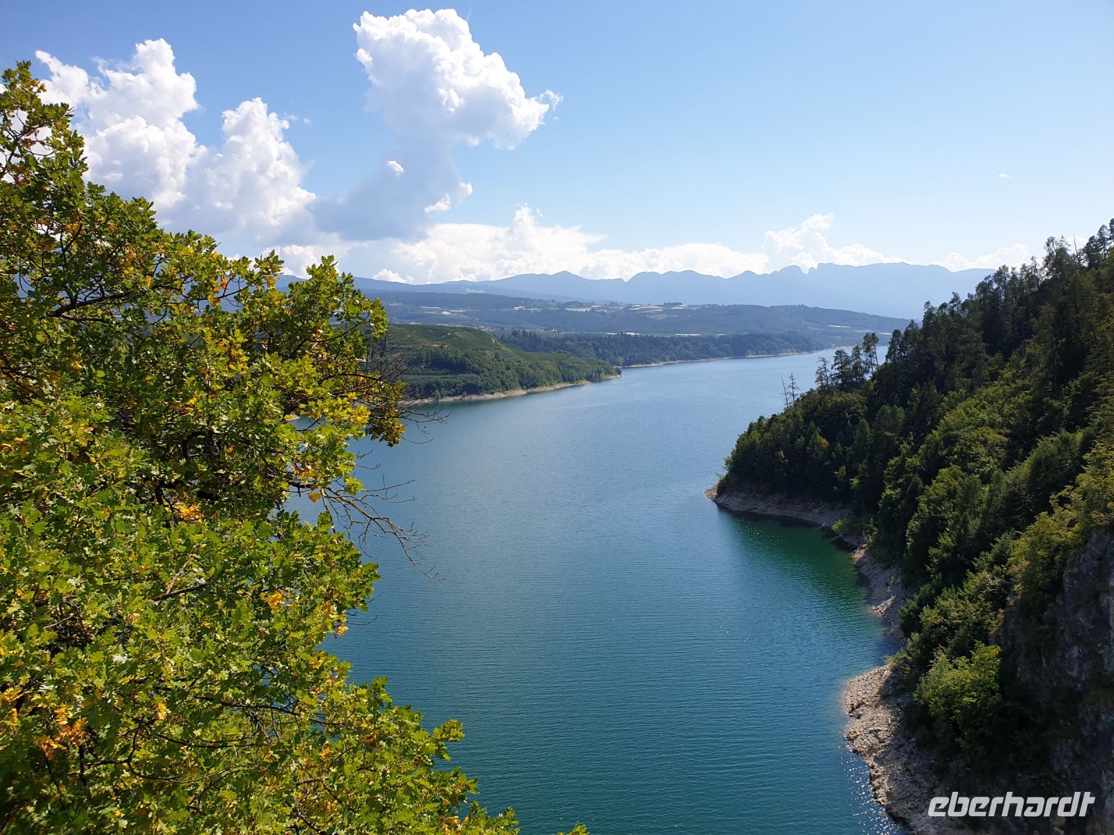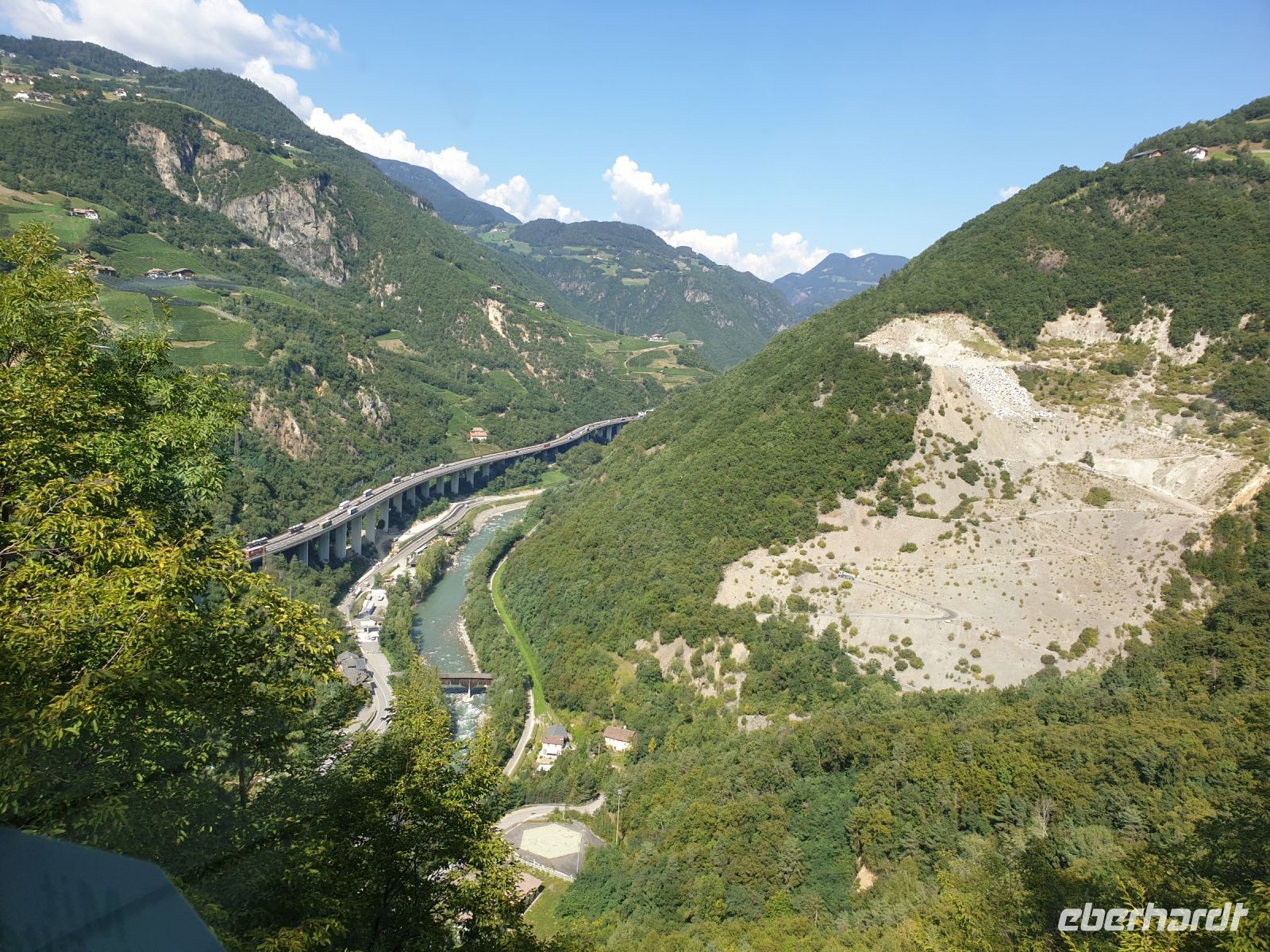 der Stadt, fast selbstverständlich Maria geweiht, lohnt eine Besichtigung. Die großflächige Santa-Giustina Staustufe des Noce wirkt fjordartig. Wir queren sie über eine Brücke welche die Straße über Male, die Brenta konsequent umfahrend, nach Madonna di Campiglio führt. Der Pass Karl des Großen dient uns als letzte Rast- und Aussichtsstation. Das Tal weitet sich und mündet bei Trient ins Tal der Adige. Flussaufwärts begleitet die Tauernautobahn den Hauptfluss der Region nach Norden. Nun freuen wir uns auf ein weiteres der leckeren Abenmenüs im Masatsch.