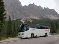 Die Zimmer des Hotels erweisen sich als bestens für unsere spezielle Reisegruppe geeignet. Auch die sonstige Ausstattung des Hauses ist für Menschen mit körperlicher Behinderung optimal; manch einer hat so schon vor dem Frühstück das Hallenbad nutzen können. In entspannter Atmosphäre beginnt unser erster Ausflug dieser Reise. Entlang der alten Brennerstraße, Eisack gegen die Strömung folgend, ist Waidbruck erster Etappenort. Hier beginnt die serpentinenreiche Auffahrt nach Kastelruth. In der Heimat der "Kastelruther Spatzen" natürlich auch ein kurzer Zwischenstopp. Die "kleine Bergfee" begleitet uns nun nach Seis. Die moderne Umlaufbahn ist auch und gerade für Rollstuhlfahrer eine bequeme und vor allem aussichtsreiche Möglichkeit das Hochplateau der Seiser Alm zu besuchen. Ein Panoramablick auf Sellastock, Platt- und Langkofel erwartet uns nach dem Ausstieg an der Bergstation. Ein Kaffee oder eine Jause im modernen Bergrestaurant bei entspanntem Blick in die Bergwelt. Die Berge bestimmen entsprechend auch den weiteren Tourverlauf; via Karerpass entlang des Rosengartens zum Karersee mit Traumblick auf das Latemar Massiv. In den letzten Jahren modernisiert, macht die barrierefreie Zuwegung zum Karersee dieses Naturidyll nun für alle erlebbar.