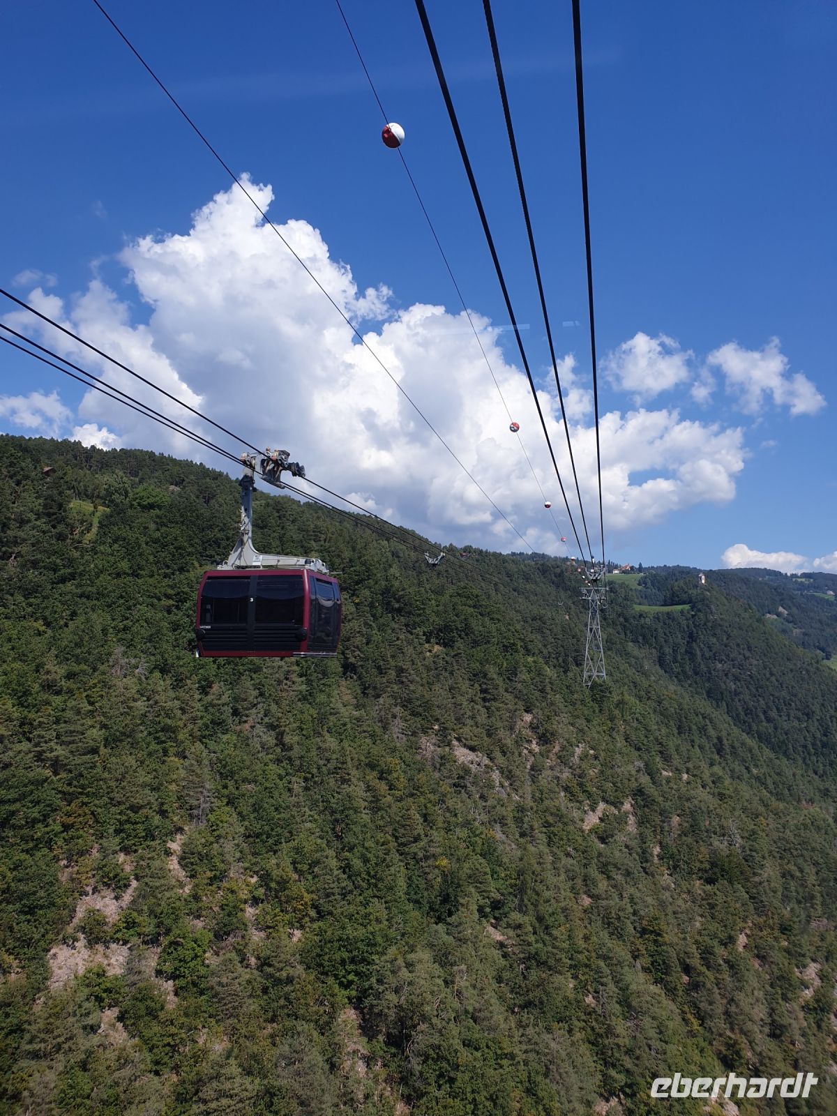 Heute hat man die Qual der Wahl; entweder zum wenige Kilometer entfernten Kalterer See, welcher neben seiner Bademöglichkeiten auch mit dem Rollstuhl umwandert werden kann oder Auffahrt zum Ritten? So setzt unser behindertengerechter Reisebus also erst die Bade- und Wandergäste ab, bevor wir uns auf den Weg in die Hauptstadt Südtirols machen. Eine Großkabine bringt uns in fünfzehnminütiger Fahrt vom Bozner Zentrum über Teile des Rittens, den Hausberg der Stadt, nach Oberbozen und retour. Wenngleich die Umgebung der Bergstation für Rollstuhlfahrer nicht allzuviel bereithält, die Fahrt selbst ist den Ausflug allemal wert.