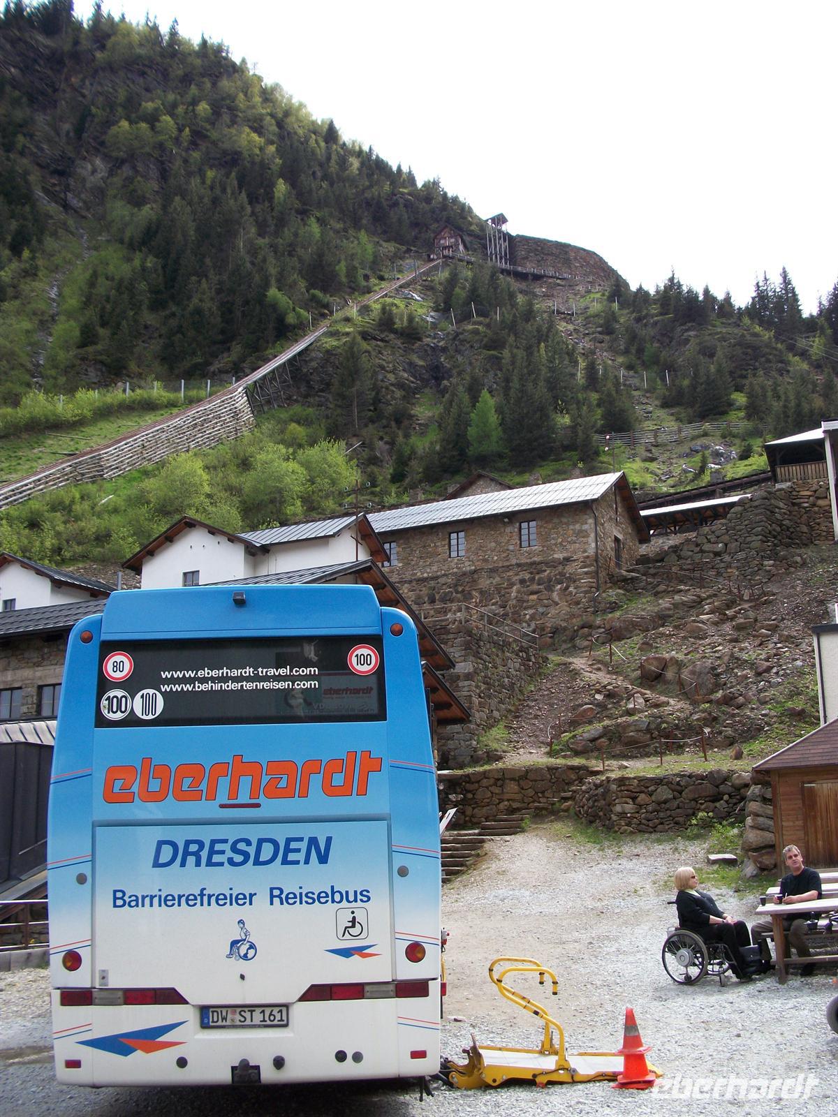 ...Diese vielbereiste, wunderschöne Gegend wollen wir mit einer Gruppe von 12 Rollstuhlfahrern und ebensovielen „Fußgängern“ entdecken. Aus Dresden kommend fahren wir zunächst Richtung Franken. Am Rasthof Vogtland die erste Pause, in behindertengerechten Transferfahrzeugen treffen dort auch die restlichen Gäste ein. Vorbei an Nürnberg führt uns die A9 nach München. Es ist Wochenende wenig Verkehr, also quer durch die Stadt. Wir fahren an der neuen BMW Welt, dem Olympiagelände vorbei und erhaschen aus einiger Entfernung einen Blick auf die Frauenkirche. Am Luise Kieselbach Platz wird an der Untertunnelung gearbeitet - ein gigantisches Projekt. Der Waldfriedhof und das Schloß Fürstenried sind für uns die letzten Impressionen der bayerischen Landeshauptstadt. Vorbei an Kochelsee und Walchensee geht es Richtung Karwendelmassiv - eine Alternative zur Autobahnverbindung Richtung Garmisch. Die kurvenreiche Strecke stimmt uns schon auf die Passfahrten der nächsten Tage ein. In Tirol angekommen geht es über Seefeld mit 16% Prozent Gefälle den Zirler Berg hinunter ins Inntal um bei Innsbruck unmittelbar wieder mit der Auffahrt zum Brennerpass zu beginnen. Die Autobahn welche auch über die berühmte Europabrücke führt, ist immer wieder ein Erlebnis. Vom Brenner aus folgen wir dem Eisack Fluss bis wir ins Pflerschtal abzweigen. Das Personal des Hotel Alpin erwartet uns schon.