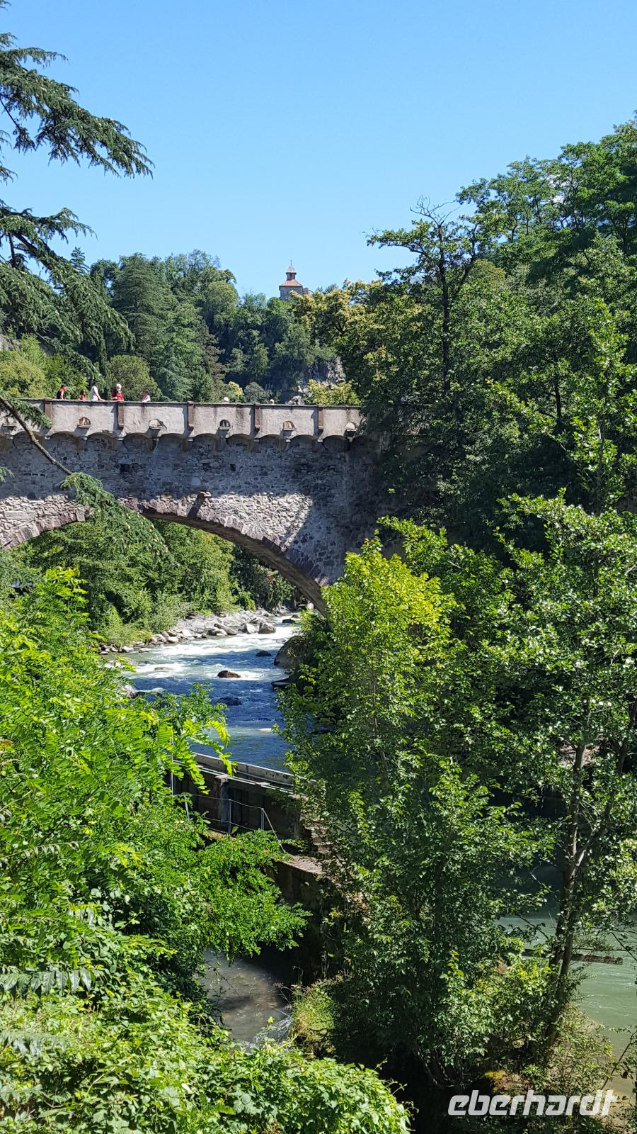 Wir passierten zuerst die Sommerpromenade bis zum Elisabeth Park. Im Anschluss überquerten wir auf der Postbrücke den Fluss „Passer". In der Winterpromenade bewunderten wir Gemälde von verschiedenen Genres. Ab dem „Steinerner Steg", die zwei-bögige Steinbrücke (1616) beginnt die Gilfpromenade. Ein beeindruckendes Naturschauspiel liegt uns zu Füßen, die wilde Passer schlängelte sich spektakulär durch enge Felsschluchten hindurch. Nach wenigen Minuten erreichten wir den Pulverturm am Tappeinerweg.