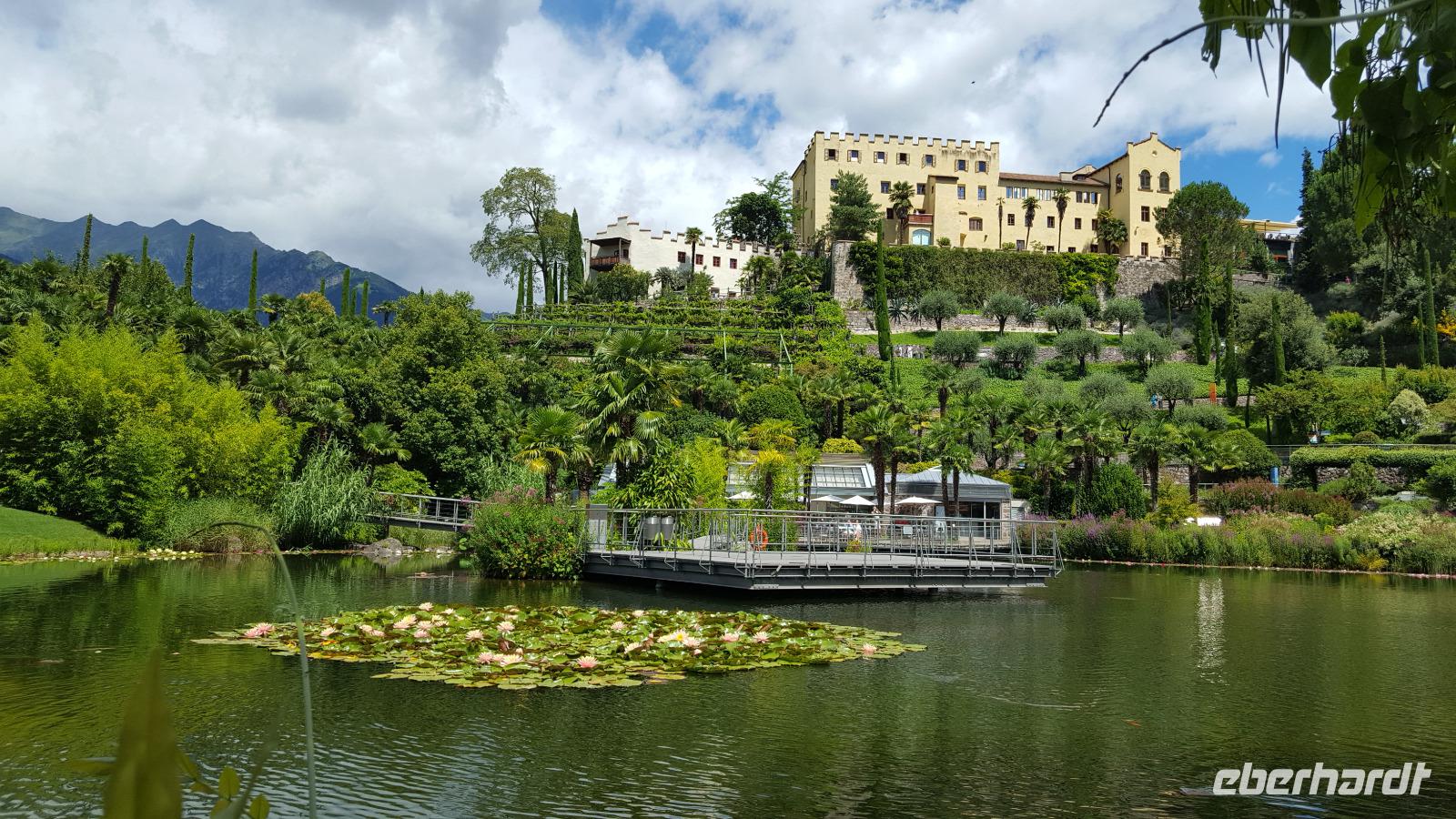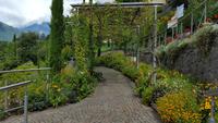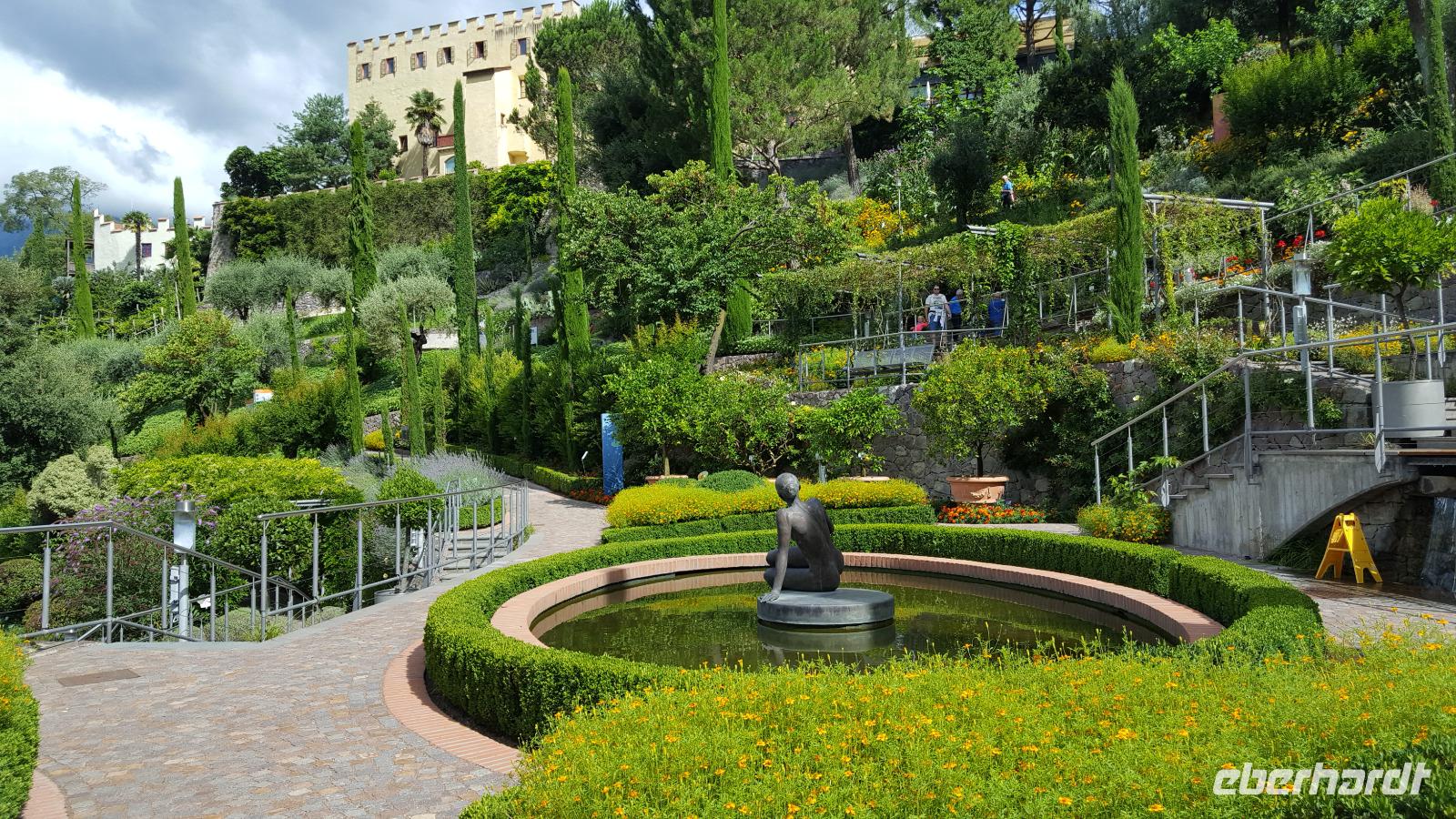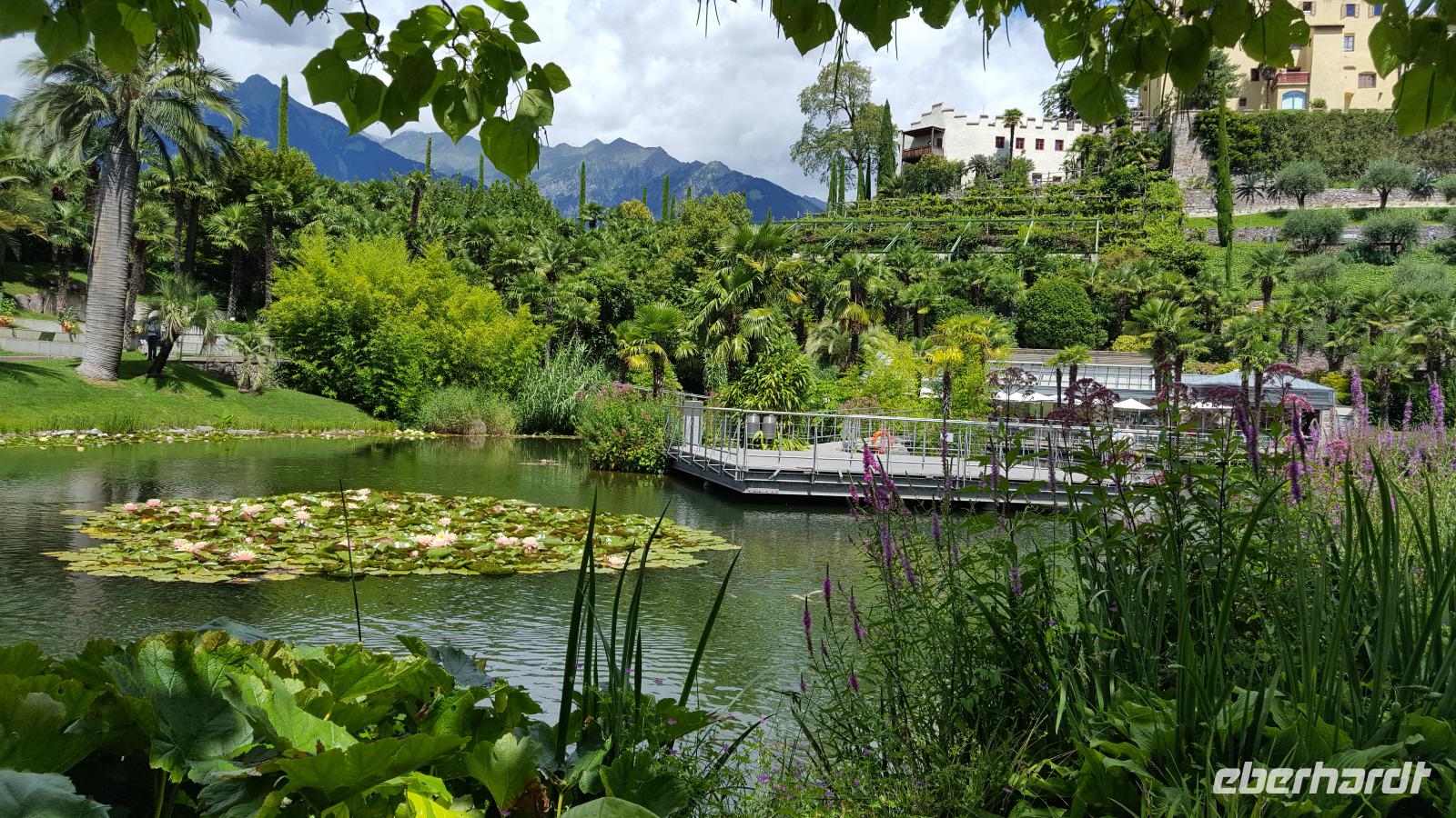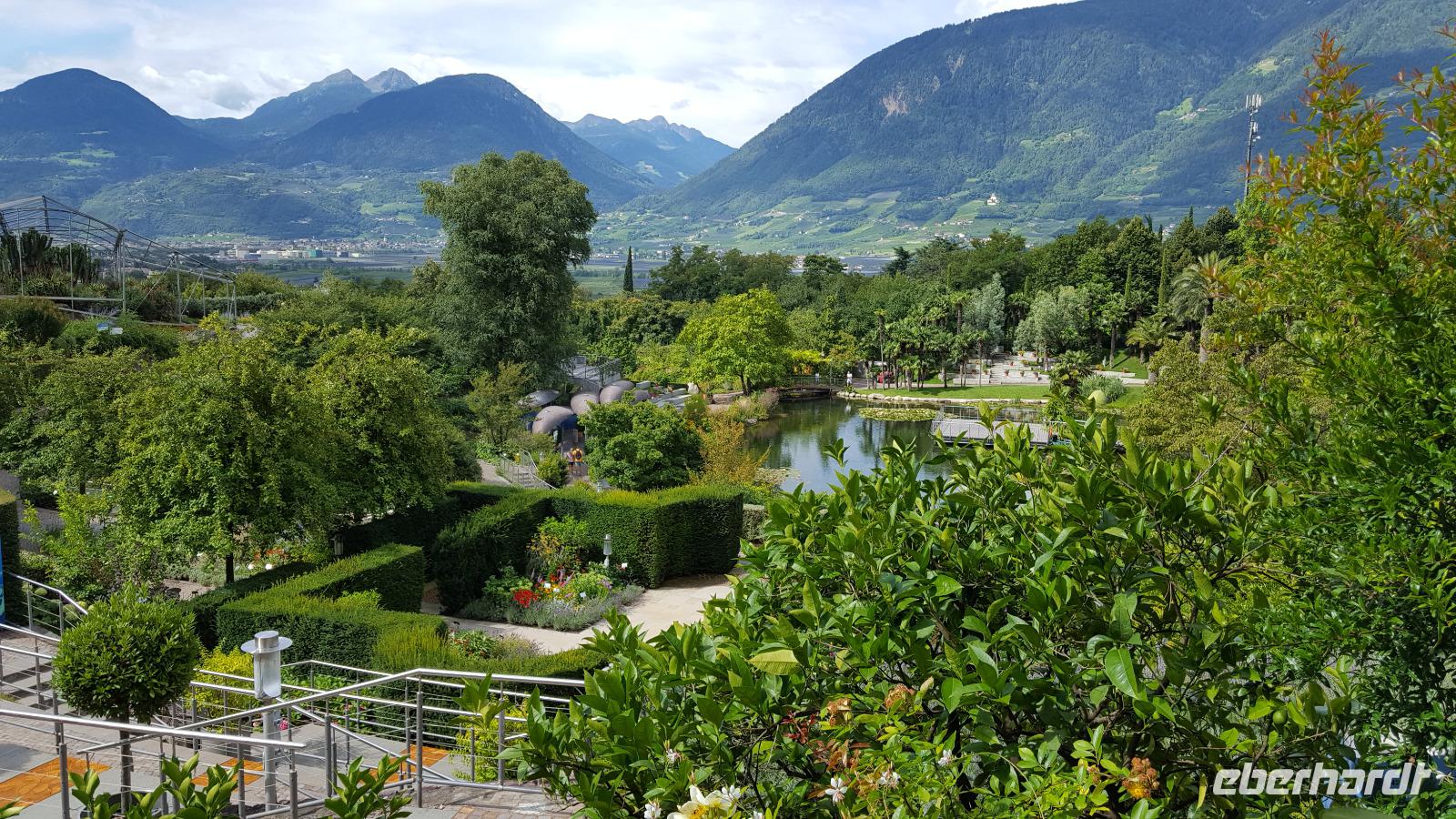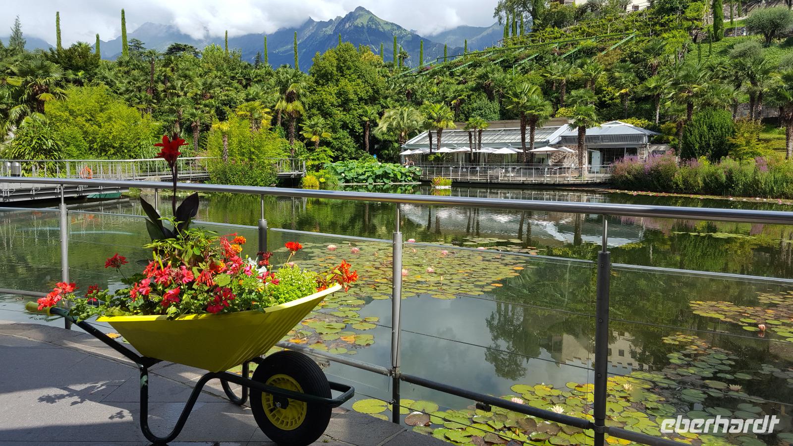 Am letzten Tag führte uns ein kurzer Spazierweg zum Schloss Trauttmansdorff mit den blühenden Gartenwelten. Auf 12 Hektar wurden in unterschiedlichen Ebenen verschiedene Pflanzen und Bäume angebaut, die sich harmonisch in die Landschaft einfügten. Diverse Wasserläufe und ein See mit Teichrosen schaffen eine harmonische Atmosphäre, die zum Träumen einlädt. Abwechslungsreich sind die verschiedenen Aussichtspunkte, die den weiten Blick ins Passeier Tal und ins Vinschgau ermöglichten. 25 bis 30 fleißige Gärtner bemühen sich die ca. 80 Gartenlandschaften mit Pflanzen aus aller Welt zum Blühen zu bringen.