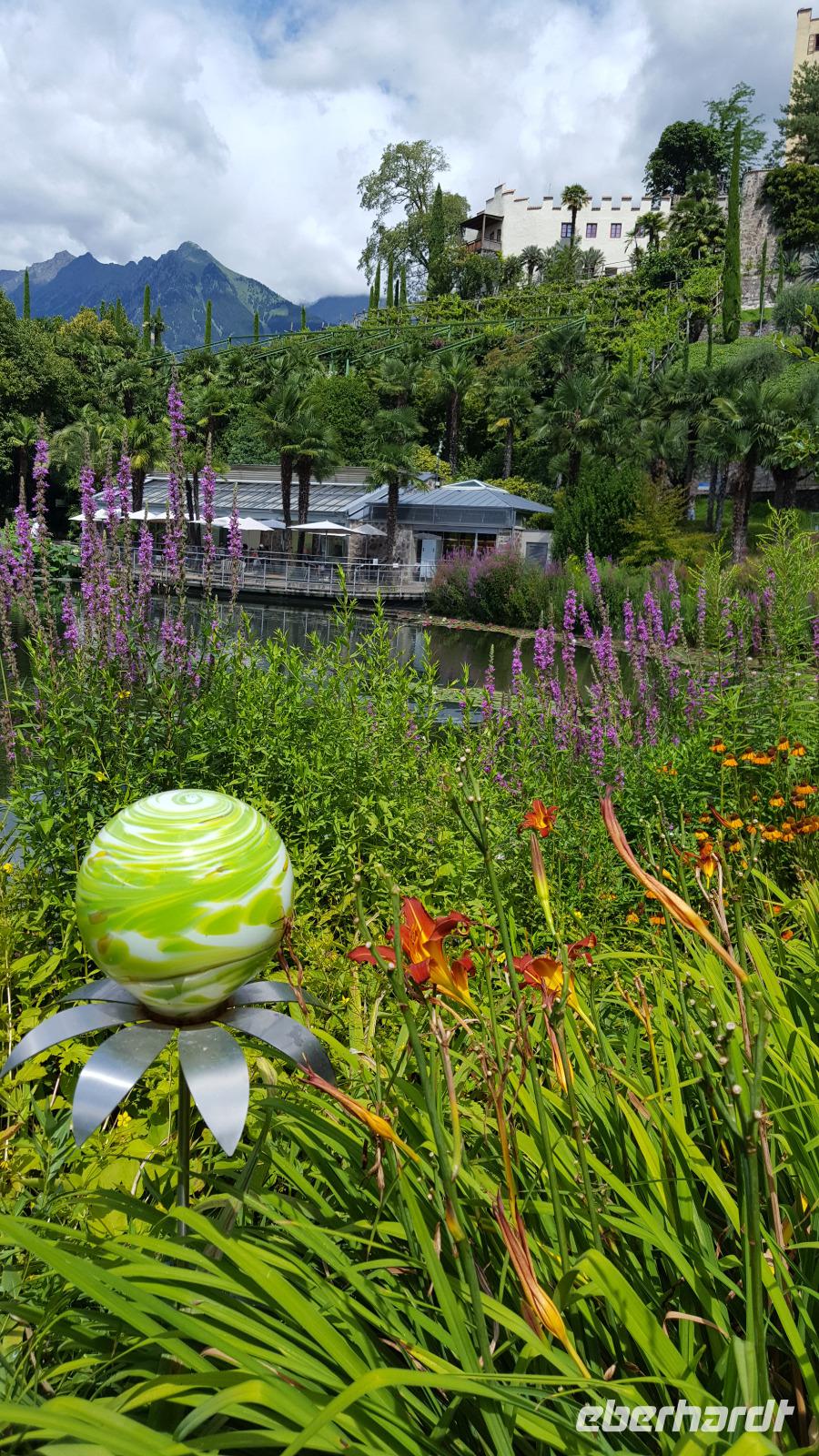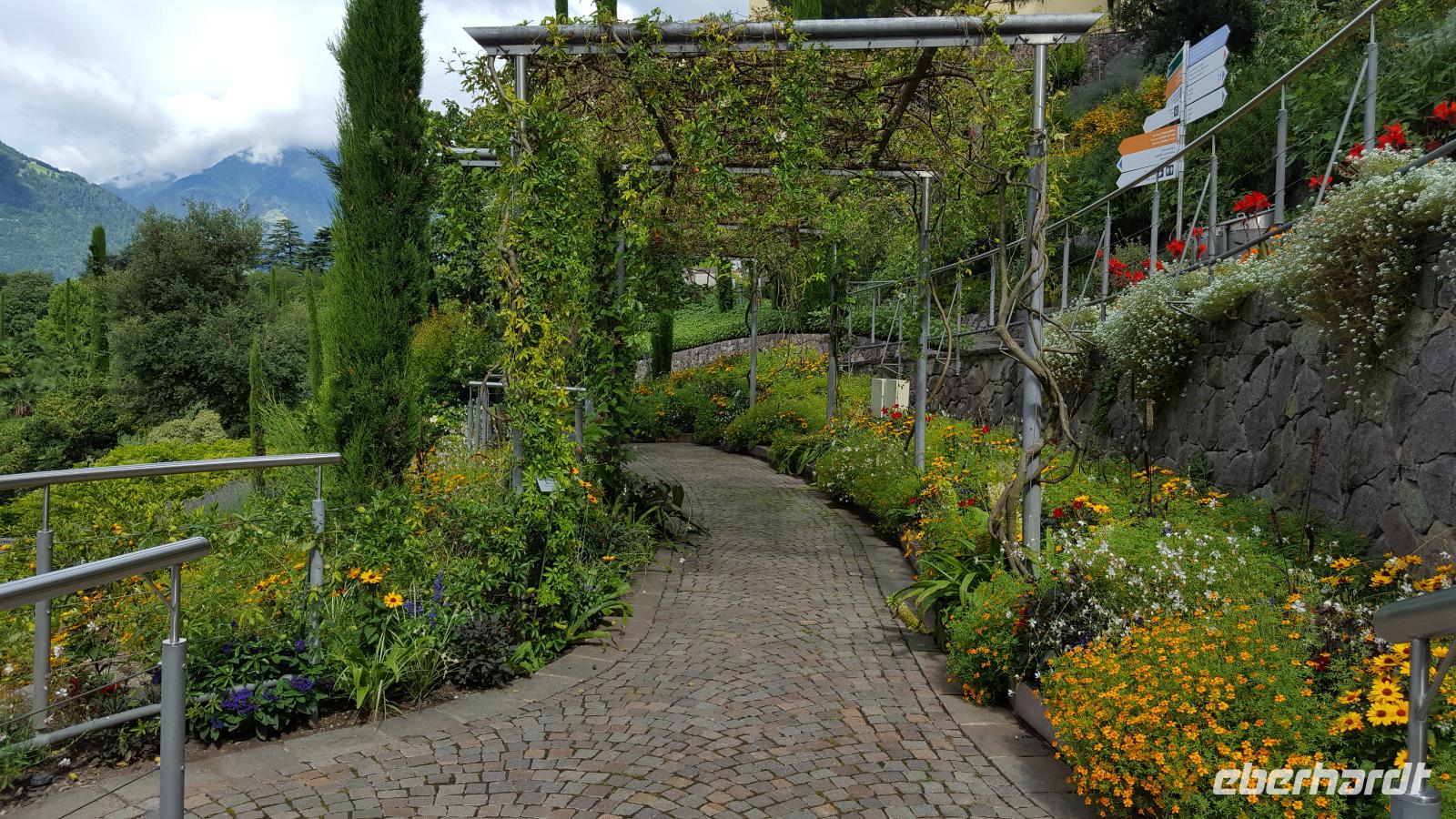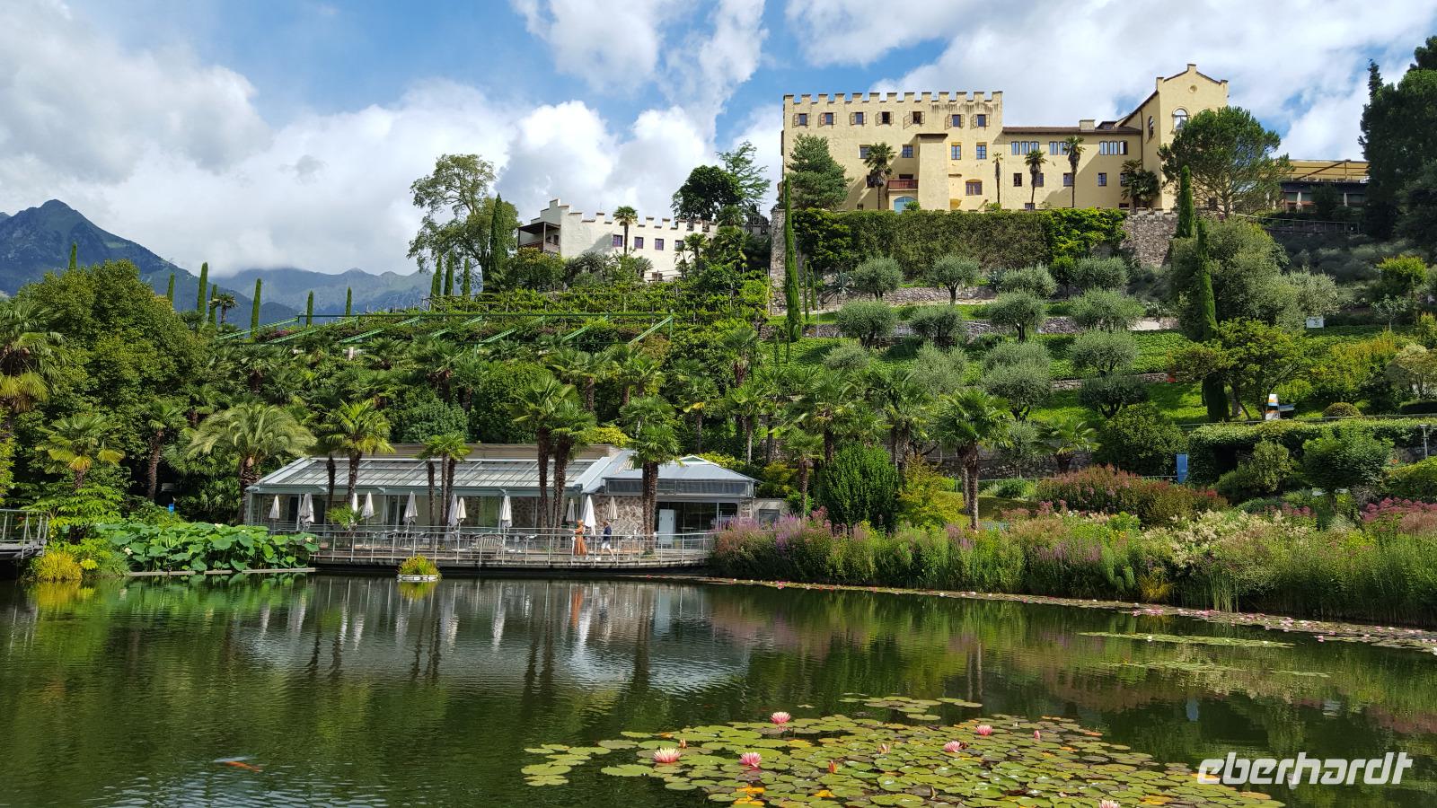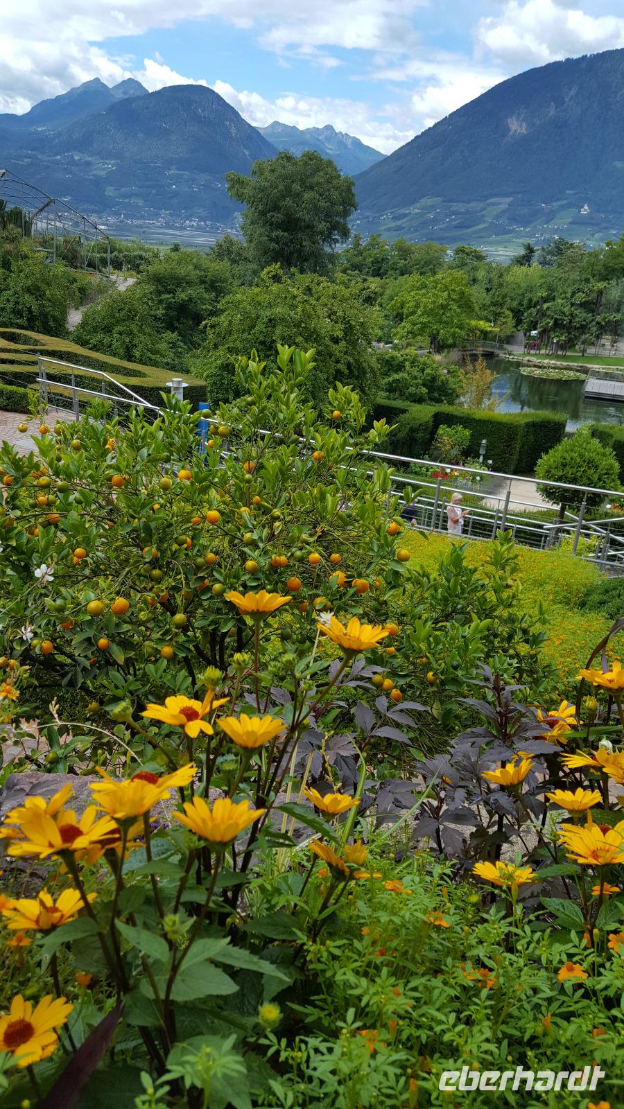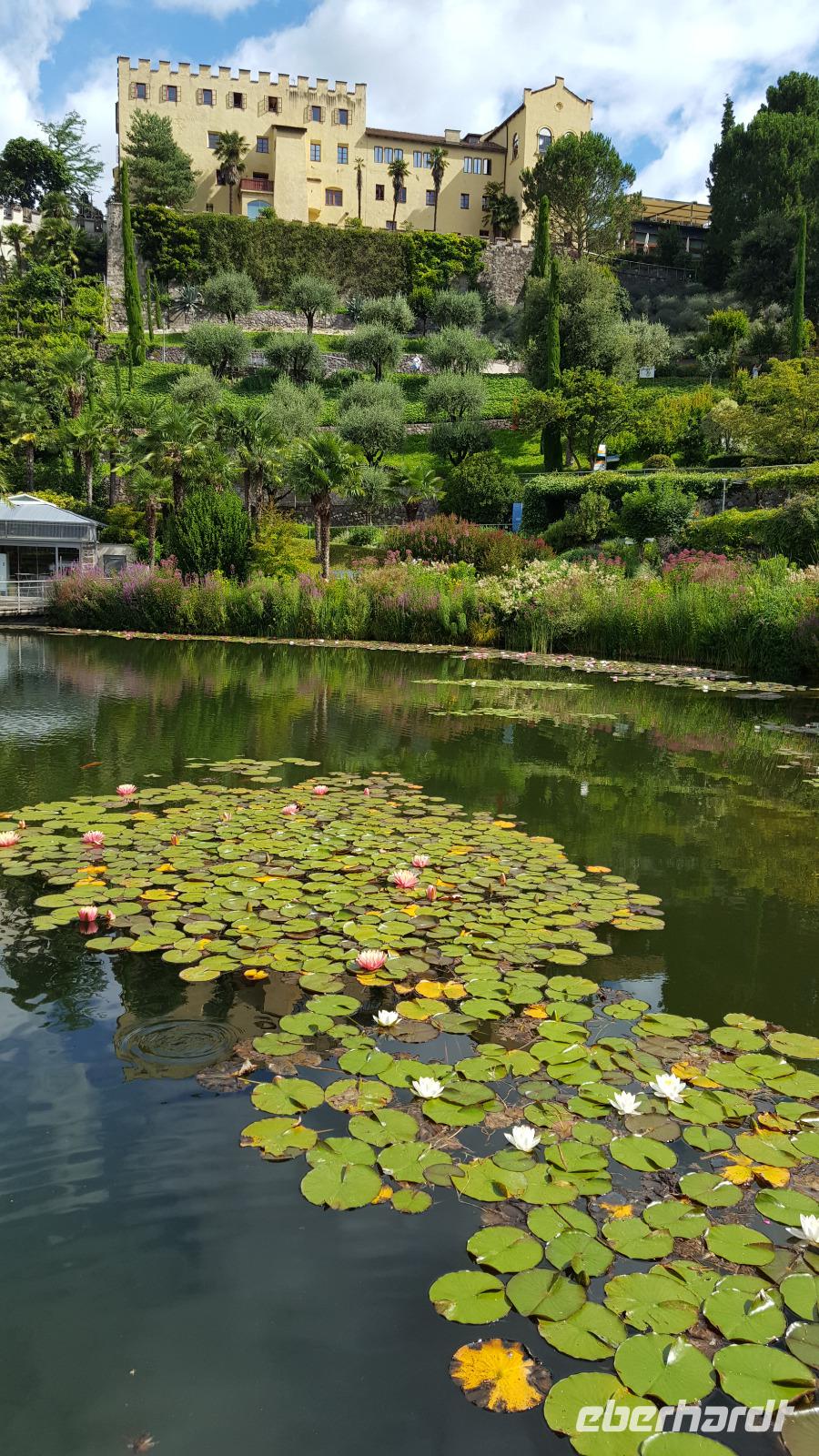 Am letzten Tag führte uns ein kurzer Spazierweg zum Schloss Trauttmansdorff mit den blühenden Gartenwelten. Auf 12 Hektar wurden in unterschiedlichen Ebenen verschiedene Pflanzen und Bäume angebaut, die sich harmonisch in die Landschaft einfügten. Diverse Wasserläufe und ein See mit Teichrosen schaffen eine harmonische Atmosphäre, die zum Träumen einlädt. Abwechslungsreich sind die verschiedenen Aussichtspunkte, die den weiten Blick ins Passeier Tal und ins Vinschgau ermöglichten. 25 bis 30 fleißige Gärtner bemühen sich die ca. 80 Gartenlandschaften mit Pflanzen aus aller Welt zum Blühen zu bringen.