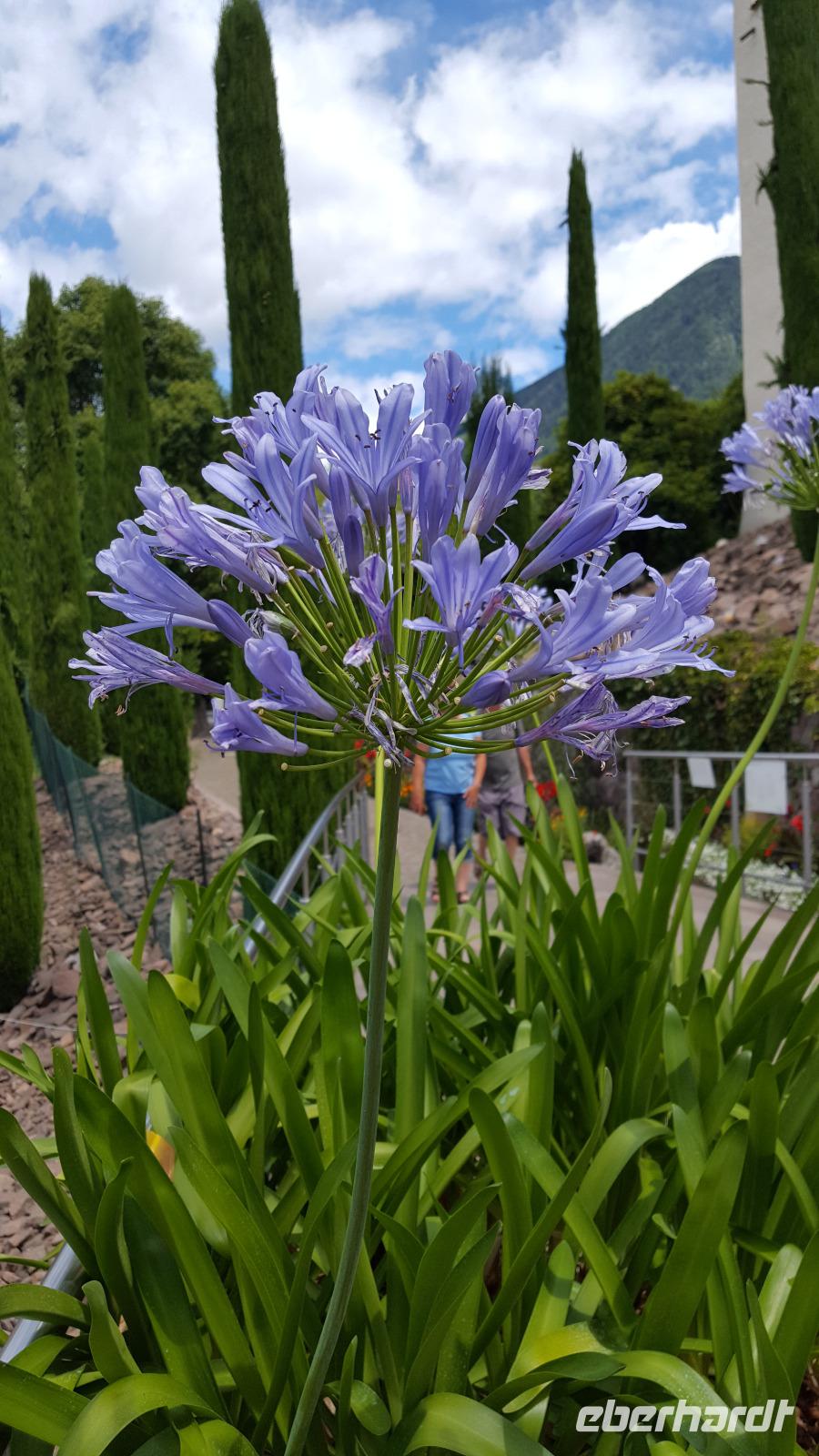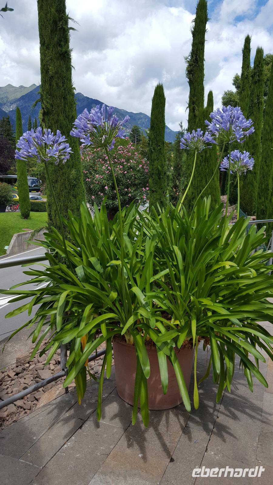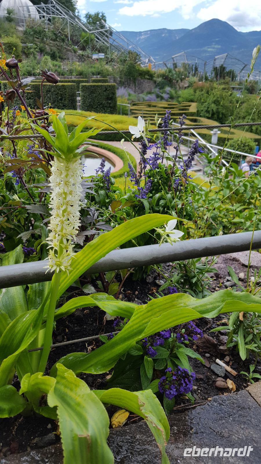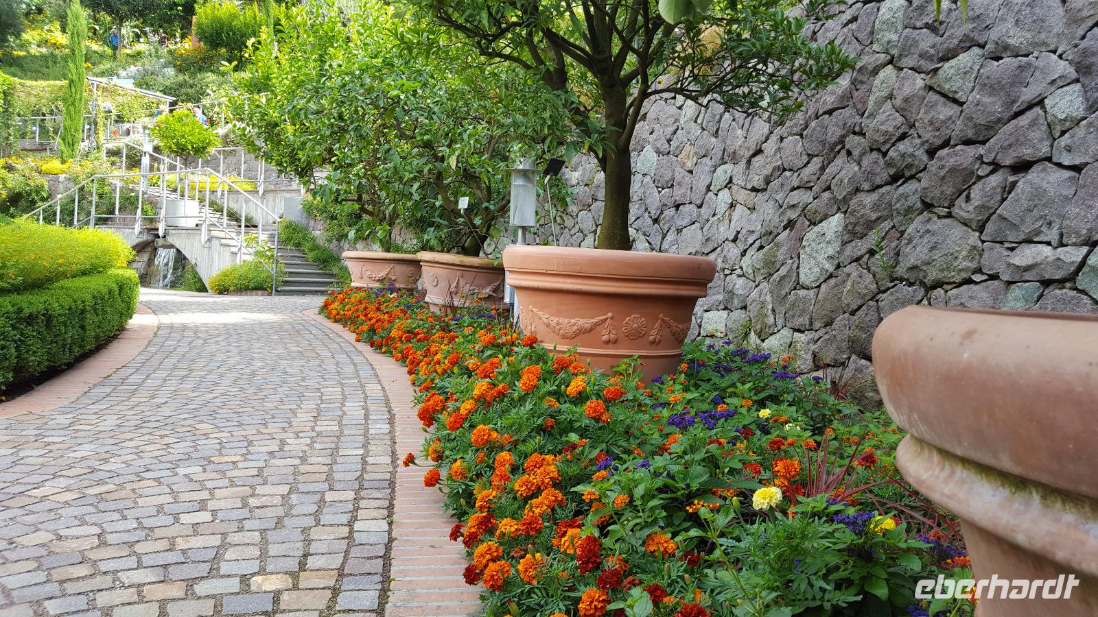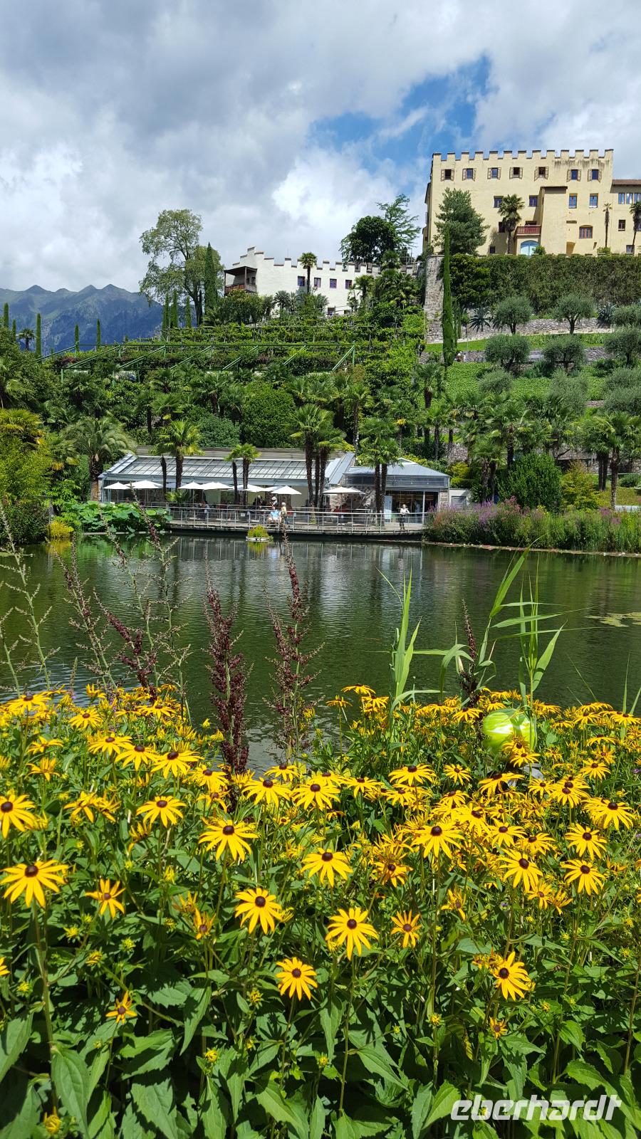 Am letzten Tag führte uns ein kurzer Spazierweg zum Schloss Trauttmansdorff mit den blühenden Gartenwelten. Auf 12 Hektar wurden in unterschiedlichen Ebenen verschiedene Pflanzen und Bäume angebaut, die sich harmonisch in die Landschaft einfügten. Diverse Wasserläufe und ein See mit Teichrosen schaffen eine harmonische Atmosphäre, die zum Träumen einlädt. Abwechslungsreich sind die verschiedenen Aussichtspunkte, die den weiten Blick ins Passeier Tal und ins Vinschgau ermöglichten. 25 bis 30 fleißige Gärtner bemühen sich die ca. 80 Gartenlandschaften mit Pflanzen aus aller Welt zum Blühen zu bringen.