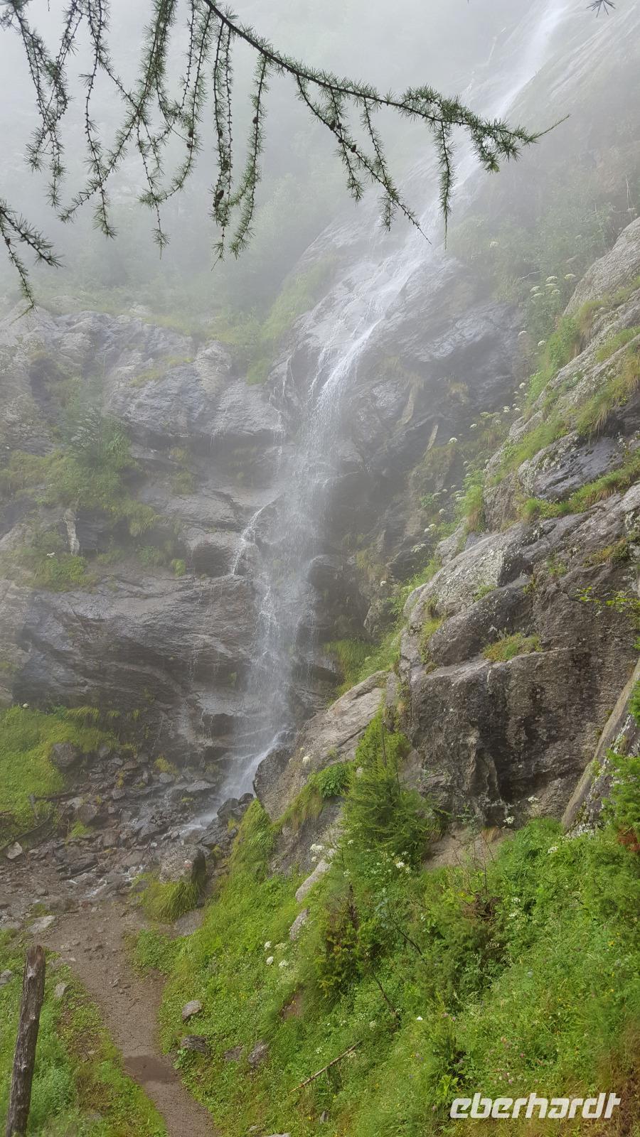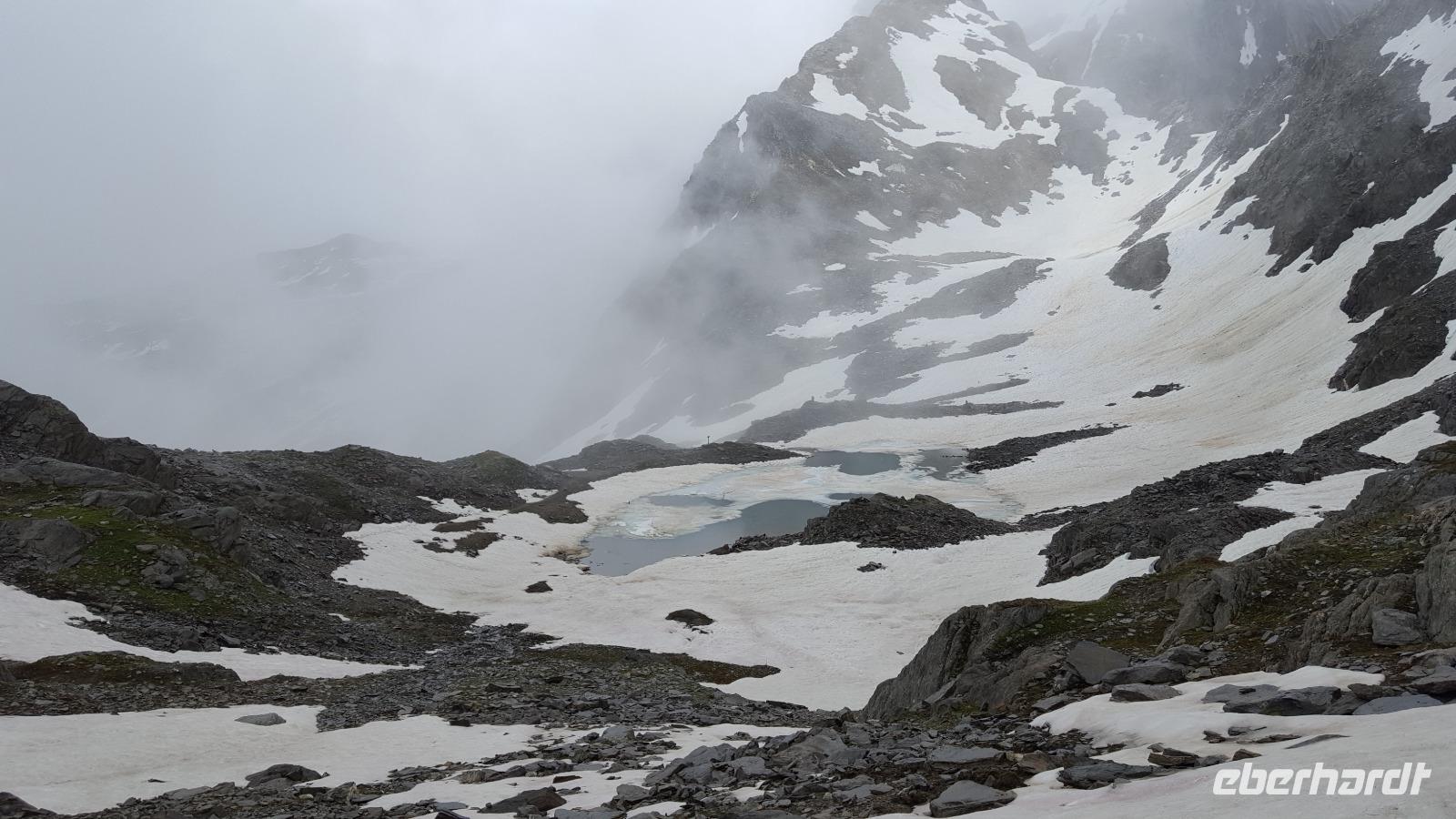 Zuerst durchquerten wir einen wunderschönen Lärchenwald. Oft plätscherte es rechts und links entlang des Weges, da mehrere Quellen in der Texel Gruppe entspringen. Am Plateau angekommen, erspähten wir den Gipfel des Similaun. Dieser markiert die Grenze zwischen Österreich und Italien. Flankiert wurde unser Weg von der Gebirgskette mit dem Lodner, der „Hohen Weisse" und der „ Hohen Wilde". Es ist ein anspruchsvoller Weg, deren Verlauf auch über eine alte Militär Trasse führte. Nach unzähligen Kehren erreichten wir das 2.900 m hohe Eisjöchl. Somit war der höchste Punkt der Tour erreicht und der passende Moment für ein Gipfelfoto. Der Blick war frei auf die Stettiner Hütte, die sich apart in eine kleine Mulde schmiegte und durch den Nebel kaum zu erkennen war. Zeit zur wohlverdienten Mittagspause und etwas Ruhe für unsere Füße. Im Anschluss folgte der Abstieg, der alle Kraft von uns erforderte.