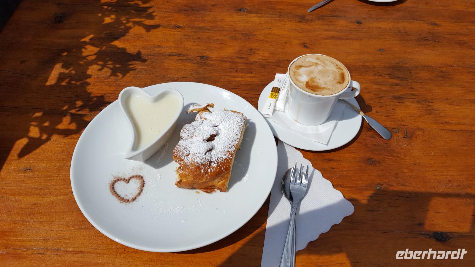 Dr. Franz Tappeiner aus Laas im Vinschgau begann 1892 mit dem Bau und der privaten Finanzierung des Weges. Heute zählt dieser Spazierweg zweifelsohne zu den schönsten Höhenpromenaden Europas und besticht durch einen Mix aus alpiner und mediterraner Vegetation seine Besucher. Am Panorama Aussichtspunkt nahmen unsere Augen einen einzigartigen 360 Grad Rundblick über die Dächer von Meran war. Die Mengen der Apfel- und Weinplantagen sind erstaunlich, sie erstrecken sich über den gesamten Talkessel soweit das Auge blicken kann. Nach 6 km hatten wir am Ende des Tappeiner Weges das Café Unterweger erreicht. Mit Köstlichkeiten aus der hauseigenen Konditorei wurden wir verwöhnt.