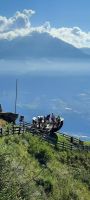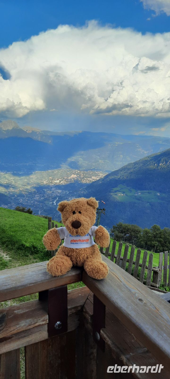 Ganz bequem fuhren wir mit der Seilbahn Hochmuth vom Dorf Tirol zu den Muthöfen. Nach einem steilen Anstieg erreichten wir die Aussichtsplattform, die erst 2018 fertig gestellt wurde. Unser Blick schweifte über Meran, weiter ins Passeier Tal, ins Vinschgau und zum Fluss Etsch. Dieser fließ in Richtung Bozen. Ein abwechslungsreicher Weg führte uns zum Hochganghaus, wo wir eine Mittagsrast einlegten. Nach stetigem bergauf- und bergab passierten wir die Tablander Alm und eine halbe Stunde später die Nassereith Hütte. Dort rauschte ein Gebirgsbach von den Spronserer Seen entlang, weit sichtbar bis ins Tal. Nach einer weiteren Stunde erreichten wir den Gasthof Giggelberg am späten Nachmittag (17.00 Uhr), unsere erste Übernachtung auf 1.565 Höhenmetern.