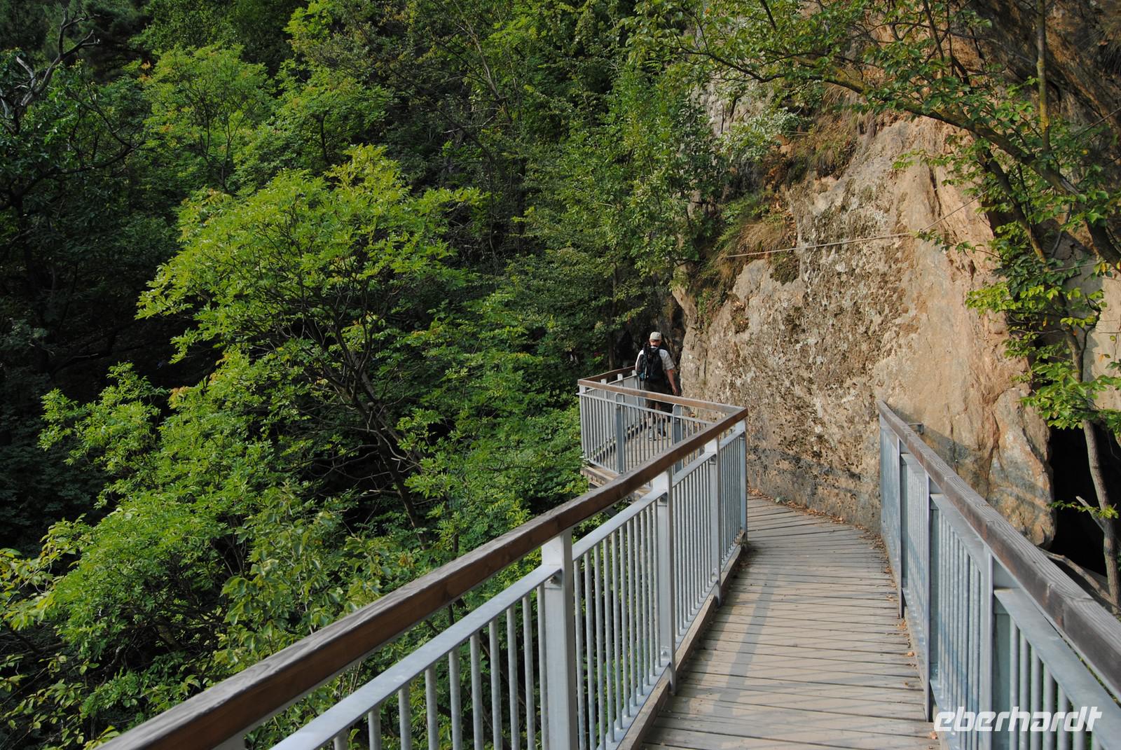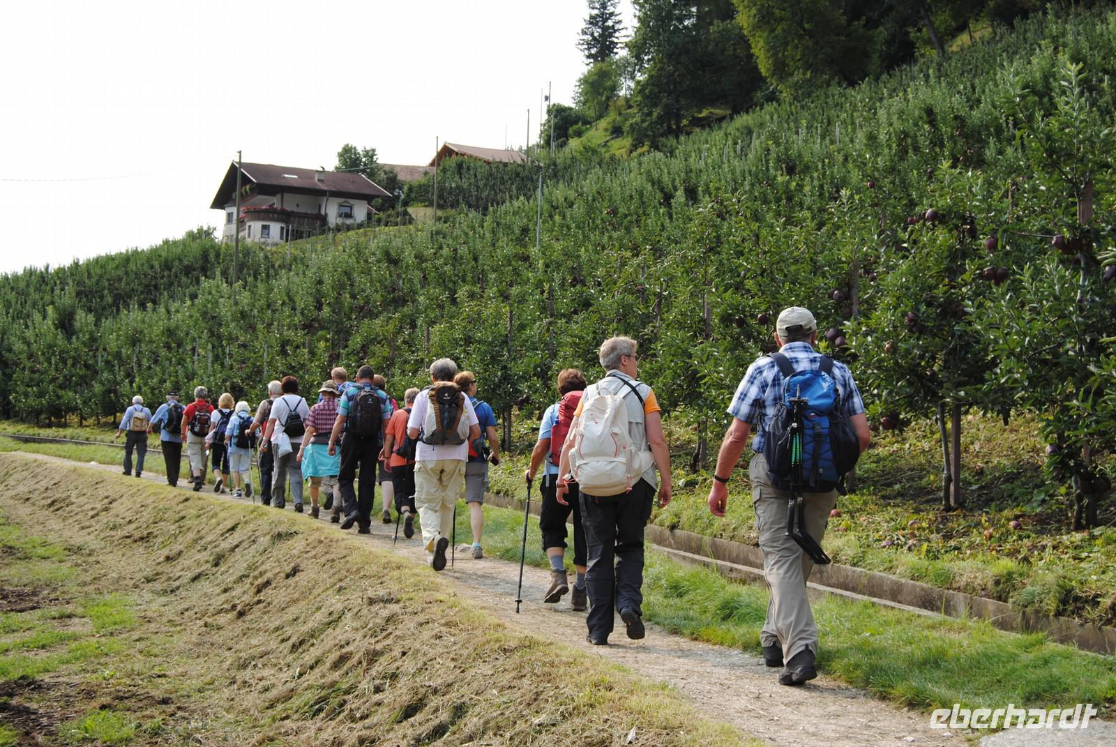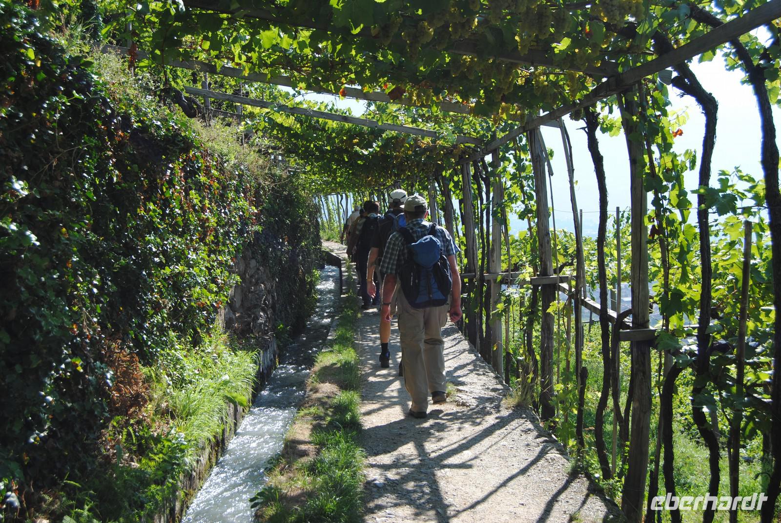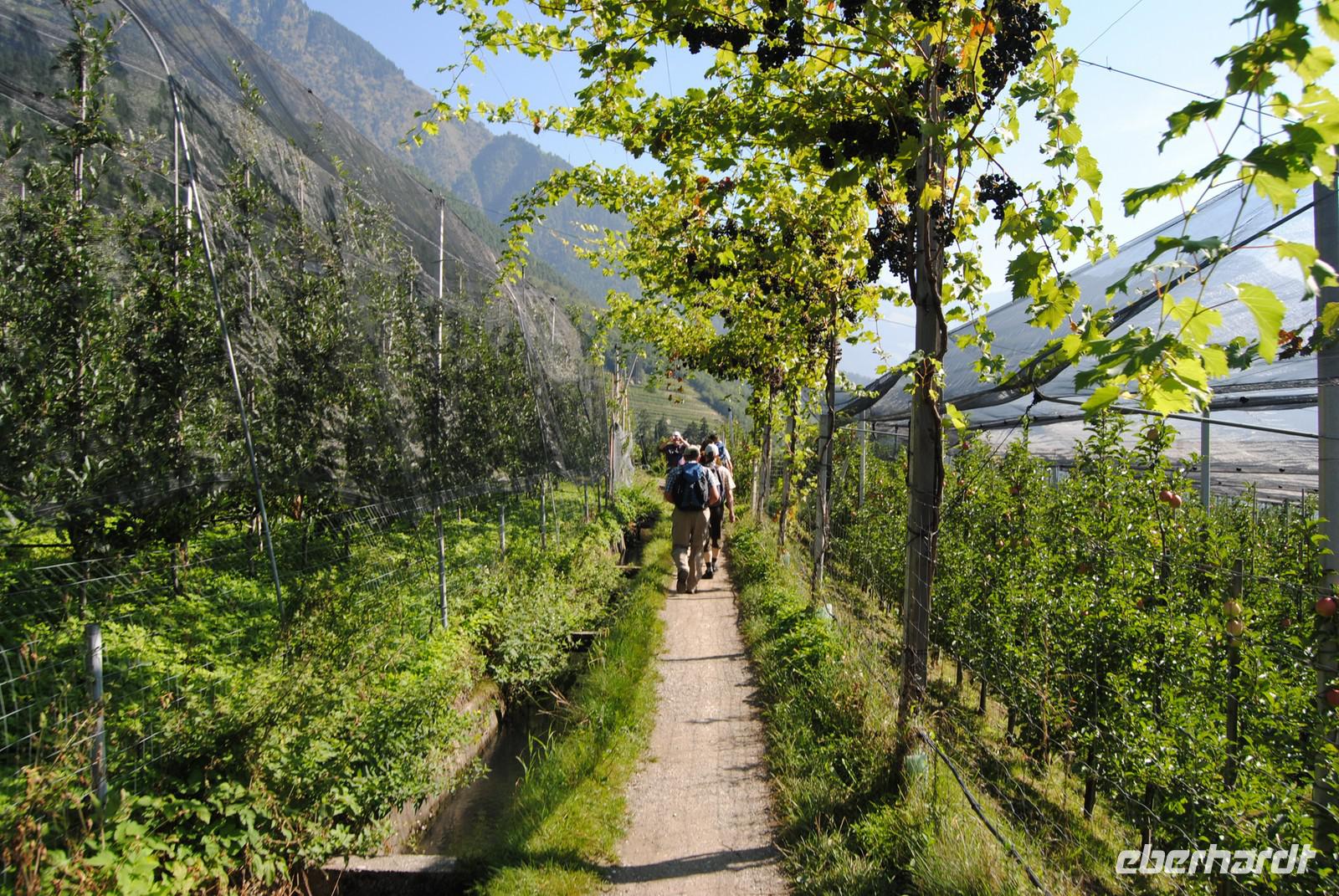 Roy fuhr uns am Morgen mit dem Bus erneut in die Nähe des Ortes Töll, von wo wir bereits zu unserer ersten Wanderung auf dem Waalweg aufbrachen. An diesem sonnreichen Freitag wanderten wir, umgeben von unzähligen und in voller Reife befindlichen Weinreben auf dem Algunder Waalweg sowie auf dem Tappeinerweg bis nach Meran. Durch das milde Klima Merans, befindet sich entlang des Weges auch eine sehr artenreiche Pflanzenvielfalt. Zum Abschluss unserer Wanderung kehrten wir im Braugarten der örtlichen Brauerei Forst ein und ließen die vergangenen Wanderungen noch einmal Revue passieren. Am Nachmittag unternahm Toni mit uns noch einen Stadtrundgang durch Meran und vermittelte uns dabei wissenswertes über die Geschichte der Kurstadt.