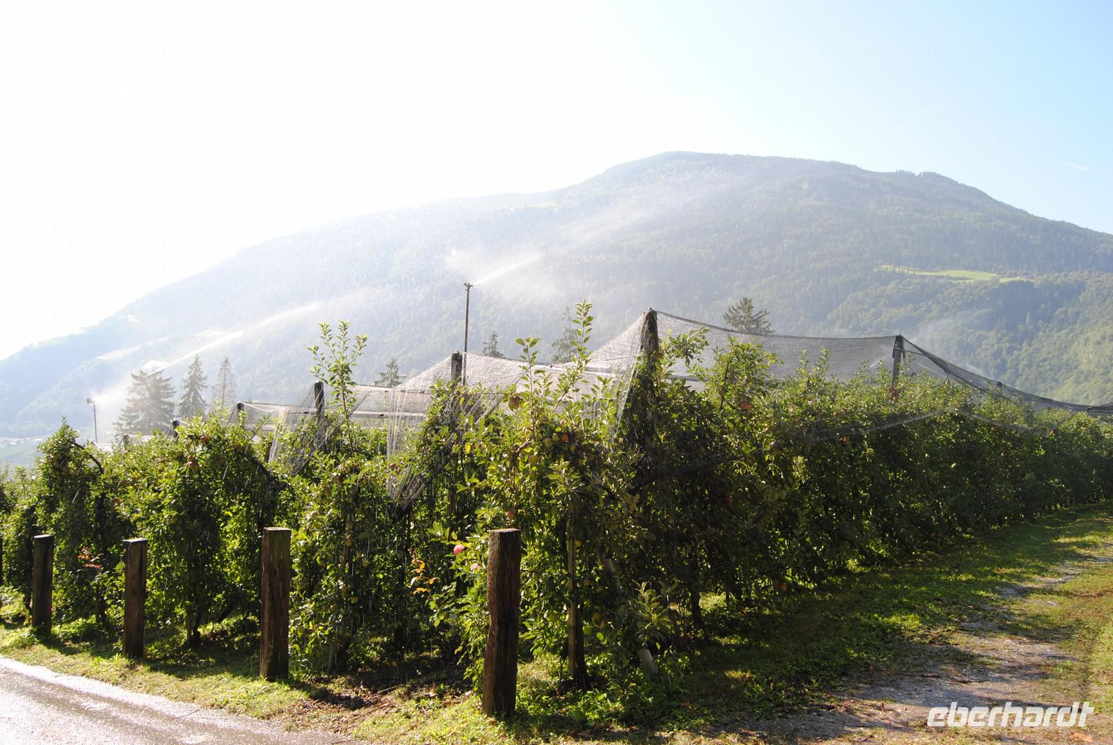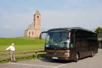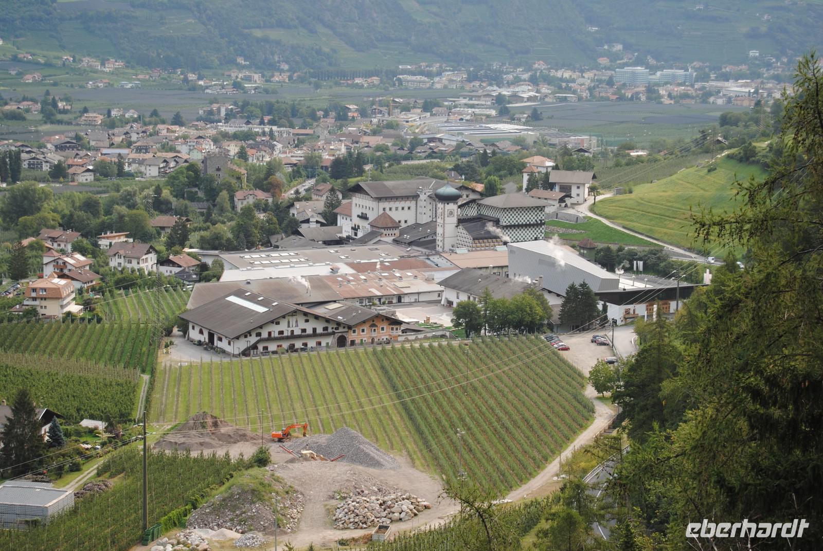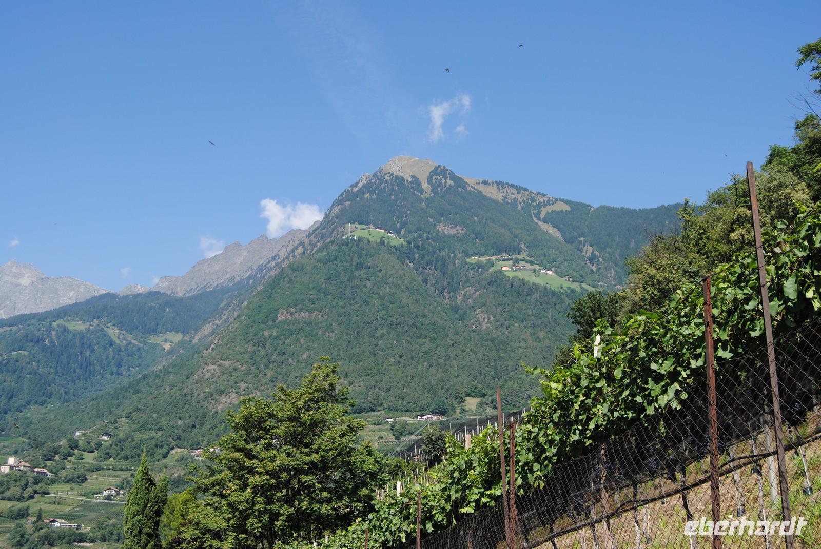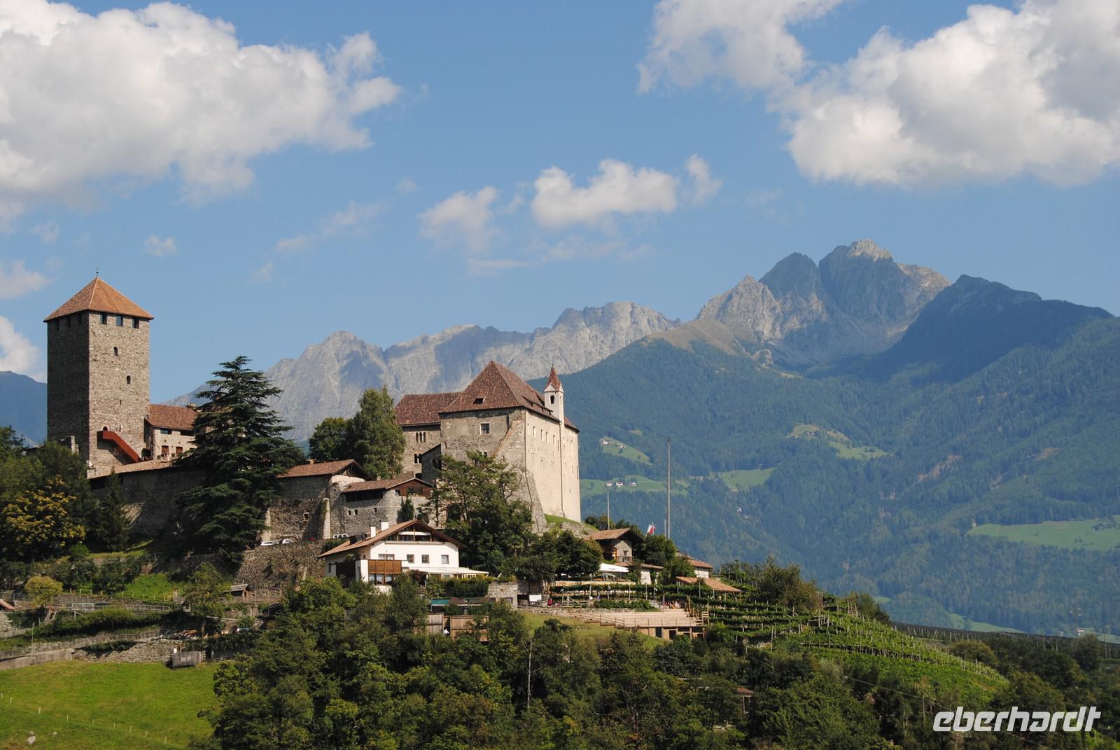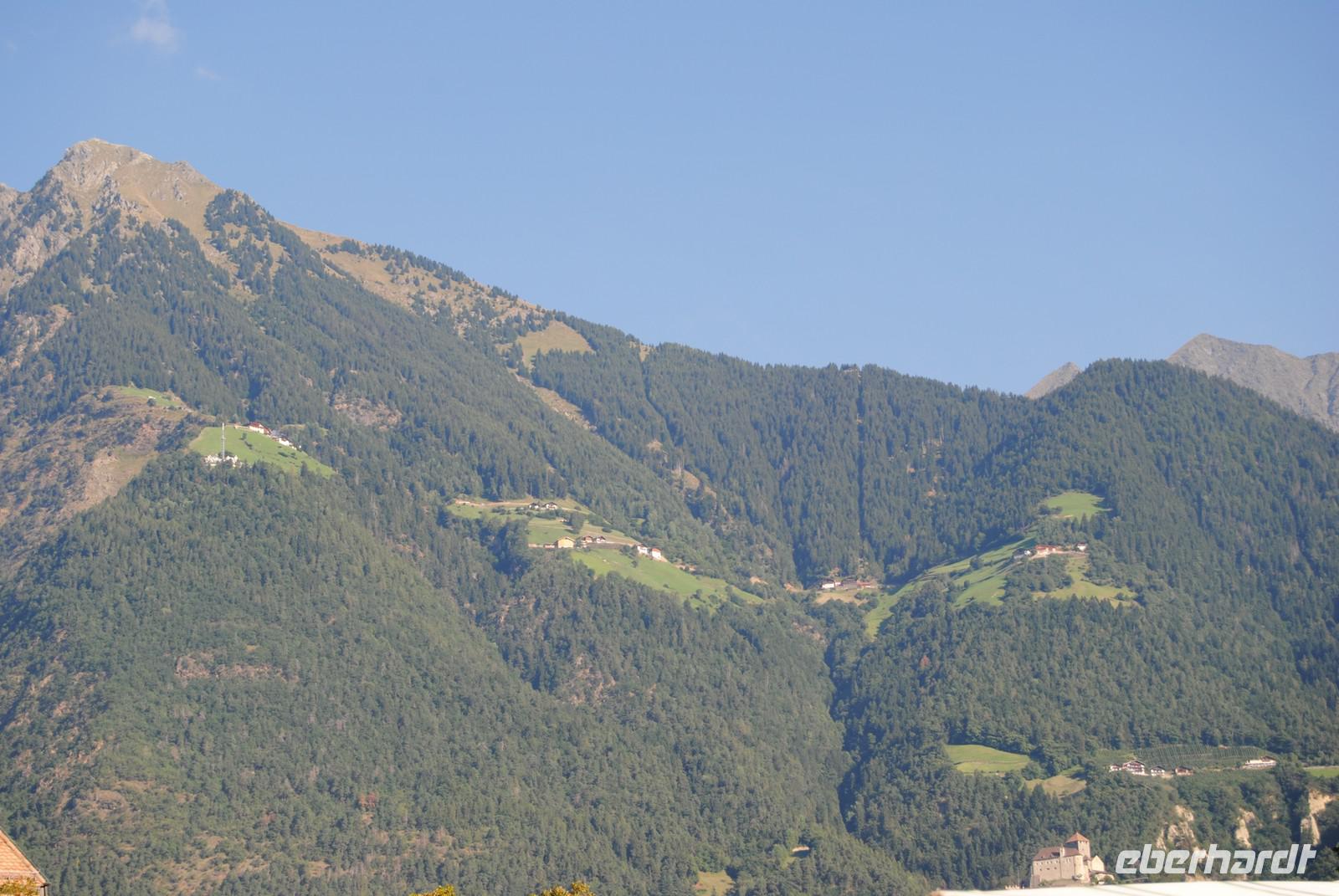 Am frühen Sonntagmorgen starten wir am Dresdner Flughafen, um in den kommenden Tagen zu Fuß die Gegend um Meran zu entdecken. Nachdem am Rasthof in Münchberg unsere Wandergruppe komplett war, fuhren wir vorbei an Nürnberg, Ingolstadt, München, Innsbruck und weiter über die Brennerautobahn bis nach Bozen. Hier passierten die Burganlage Schloss Sigmundskron, bevor wir nach 12-stündiger Fahrt unser Hotel „Siegler im Thurm" erreichten.
