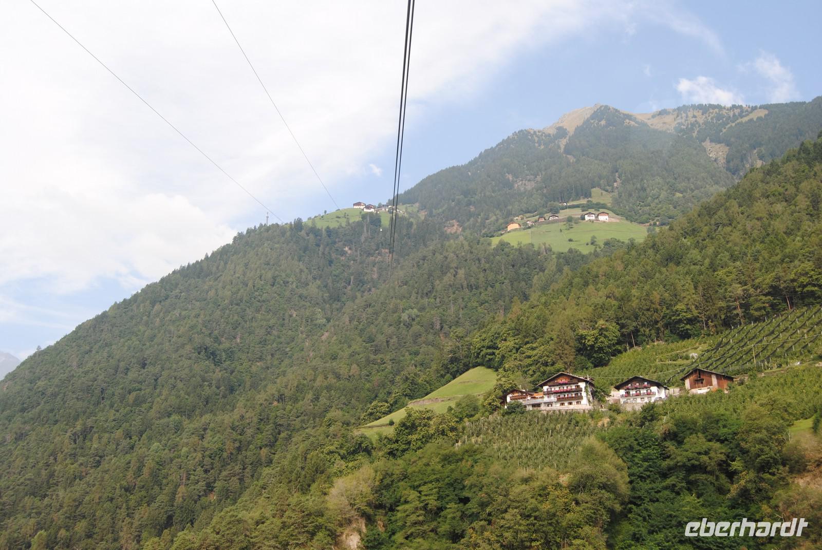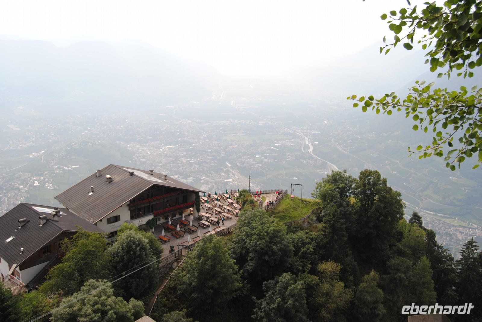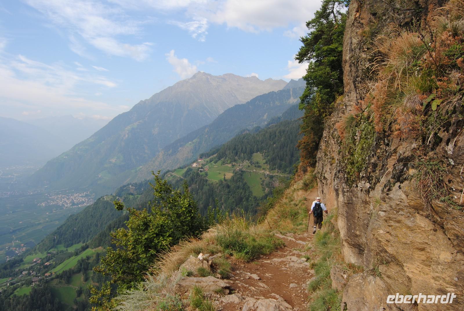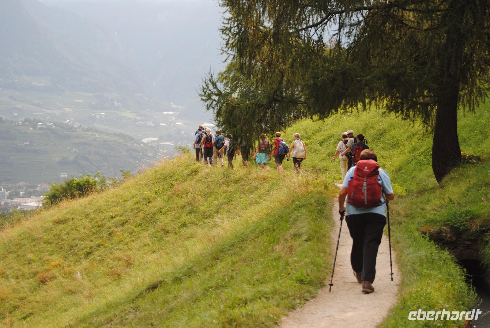 Der Bus brachte uns am Morgen in das Dorf Tirol, von dem wir mit der Seilbahn das auf ca. 1.400 m gelegene Hochmuth erreichten. Hier teilten wir uns als Gruppe, da es an diesem Tag verschiedene Möglichkeiten gab, die Wanderung zurück ins Dorf Tirol anzugehen. Toni wanderte daher mit einem Teil der Gruppe unterhalb des Meraner Höhenweg bis nach Velau, während ich mit zwei Gästen den Meraner Höhenweg über die Leiteralm nach Velau nahm, wo wir uns dann zum Mittagessen wieder trafen und gemeinsam weiter nach Dorf Tirol abstiegen. Auf der gesamten Wanderung hatten wir sehr klare Sicht, sodass wir die sehr schöne Aussicht auf Meran und das Etschtal fast durchgängig genießen konnten.