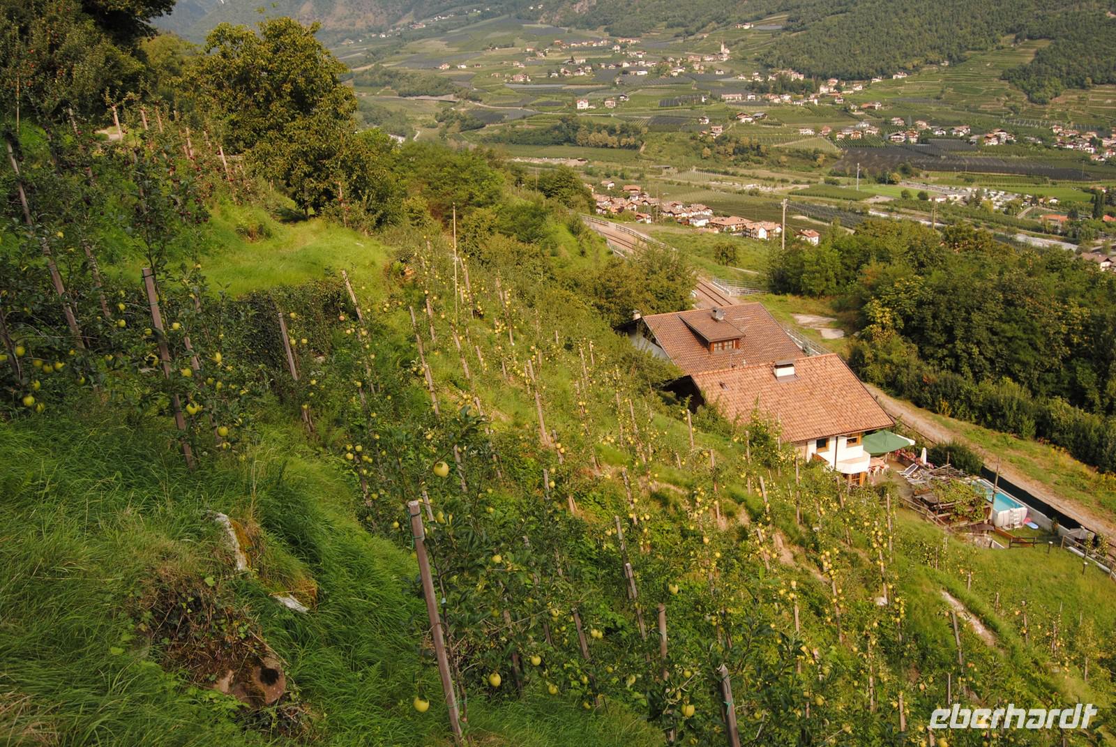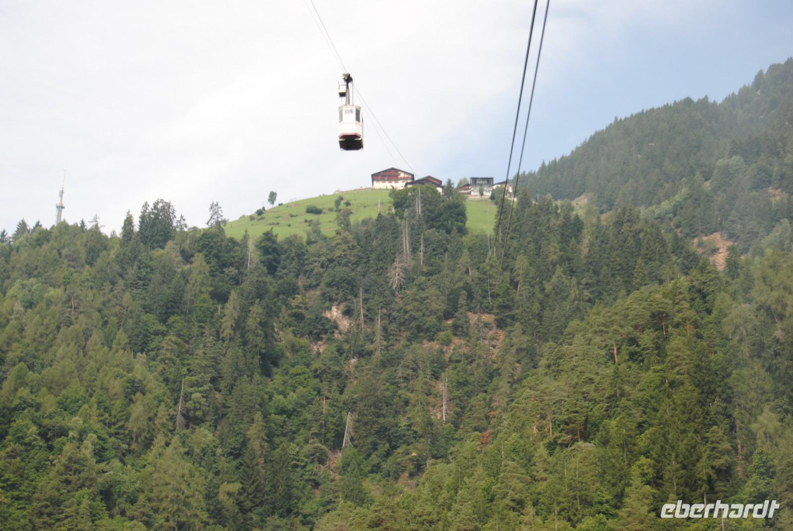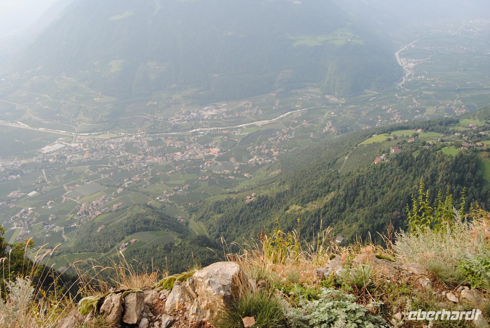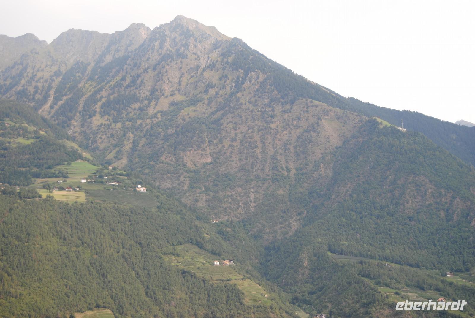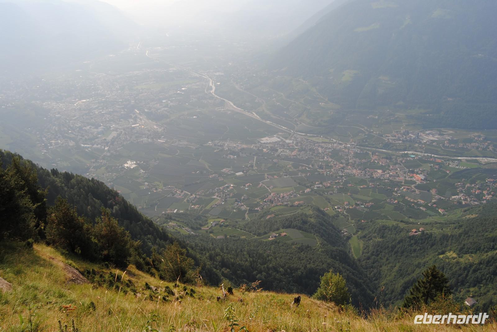 Der Bus brachte uns am Morgen in das Dorf Tirol, von dem wir mit der Seilbahn das auf ca. 1.400 m gelegene Hochmuth erreichten. Hier teilten wir uns als Gruppe, da es an diesem Tag verschiedene Möglichkeiten gab, die Wanderung zurück ins Dorf Tirol anzugehen. Toni wanderte daher mit einem Teil der Gruppe unterhalb des Meraner Höhenweg bis nach Velau, während ich mit zwei Gästen den Meraner Höhenweg über die Leiteralm nach Velau nahm, wo wir uns dann zum Mittagessen wieder trafen und gemeinsam weiter nach Dorf Tirol abstiegen. Auf der gesamten Wanderung hatten wir sehr klare Sicht, sodass wir die sehr schöne Aussicht auf Meran und das Etschtal fast durchgängig genießen konnten.