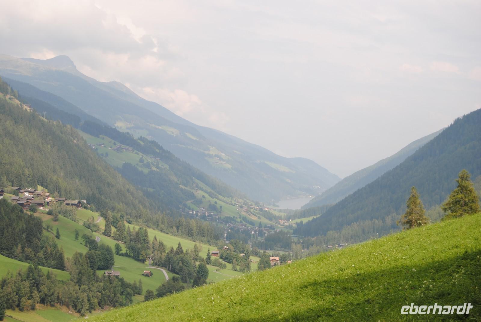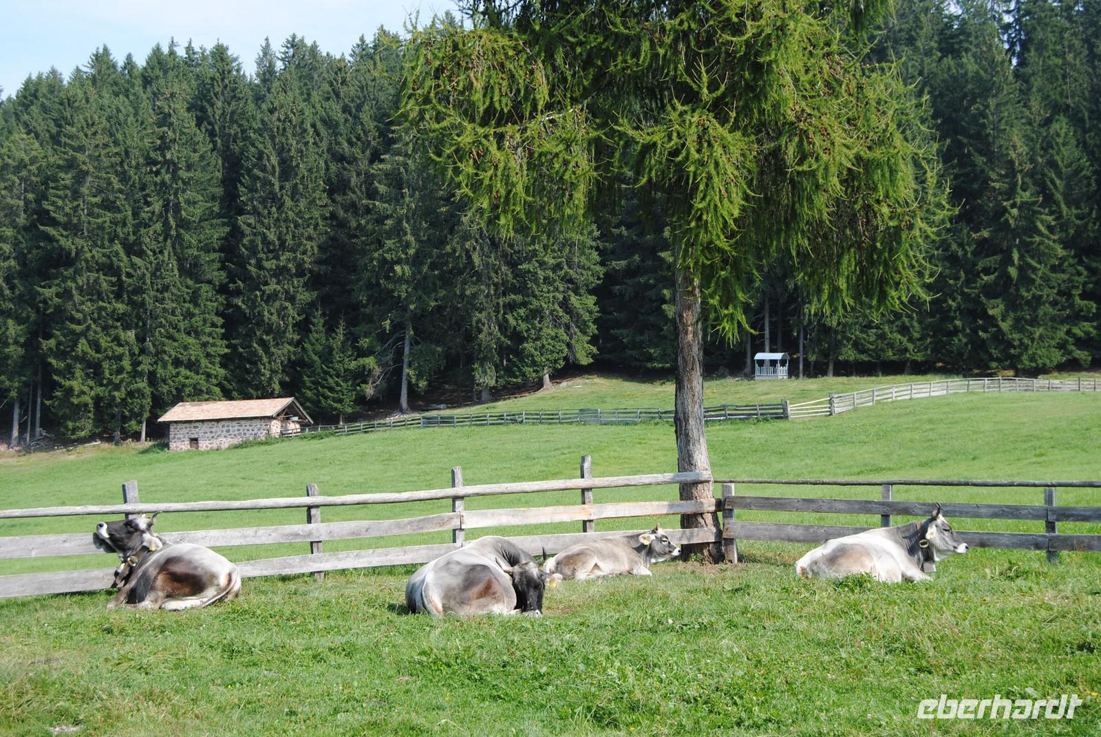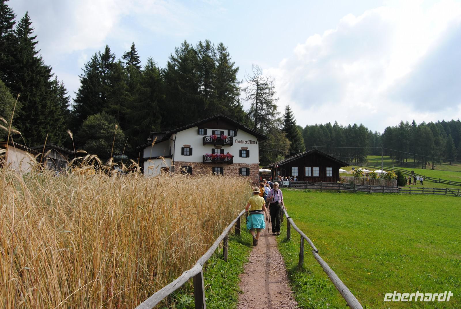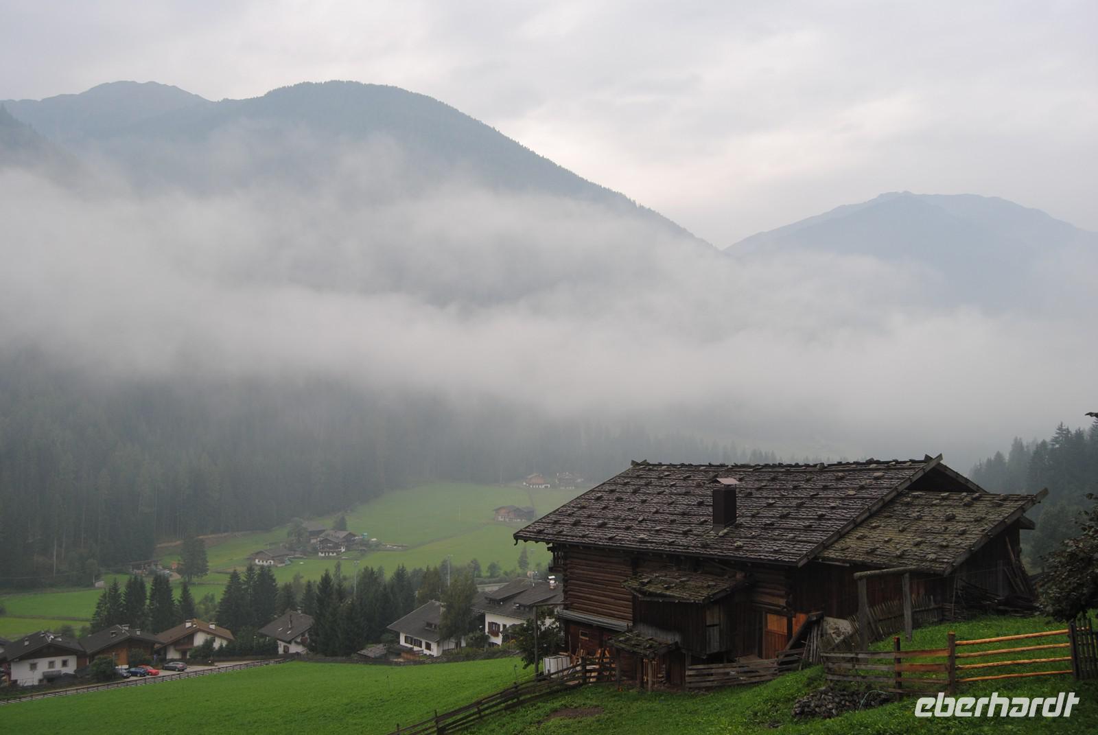 Da über Nacht Regenwolken die Region um Meran einhüllten, entschieden wir uns an diesem Tag anstatt der Wanderung um das Haflinger Gebiet zu einer Wanderung in das Ultental. Auf der Busfahrt bis zum Ausgangspunkt unserer Wanderung, dem Ort St. Nikolaus, erzählte uns Toni interessantes über das autonome Südtirol und deren Geschichte. Nachdem wir den Bus in St. Nikolaus verließen, wanderten wir über den Ultener Höfeweg bis fast in den Ort St. Gertraud. Hier nahmen wir über den Dächern des kleinen Ortes im Ultener Hof unser Mittag ein und probierten so manche Tiroler Köstlichkeit. Auf dem Rückweg nach St. Nikolaus besuchten wir die unterhalb von St. Gertraud die Ultener Lärchen, die mit einem Alter von fast 2000 Jahren, die ältesten Nadelbäume Europas sind. Im Anschluss folgten wir weiter dem Ultener Höfeweg und erreichten am Nachmittag wieder St. Nikolaus, wo uns bereits unser Busfahrer Roy mit dem Bus erwartete.