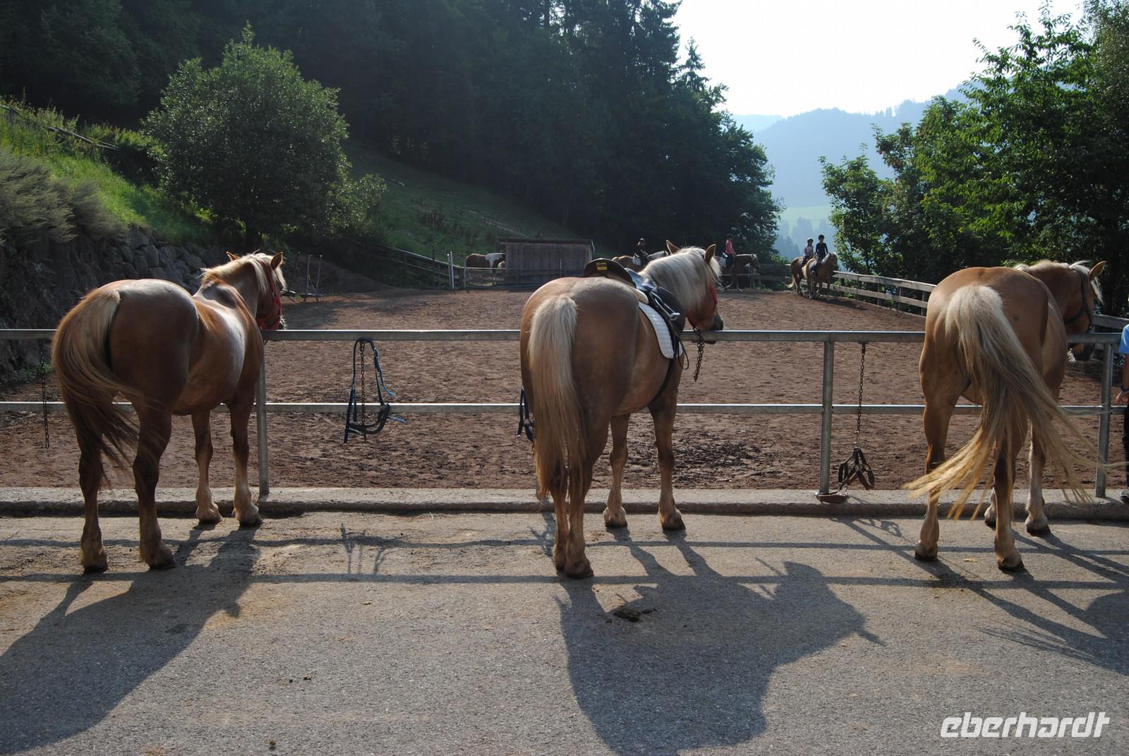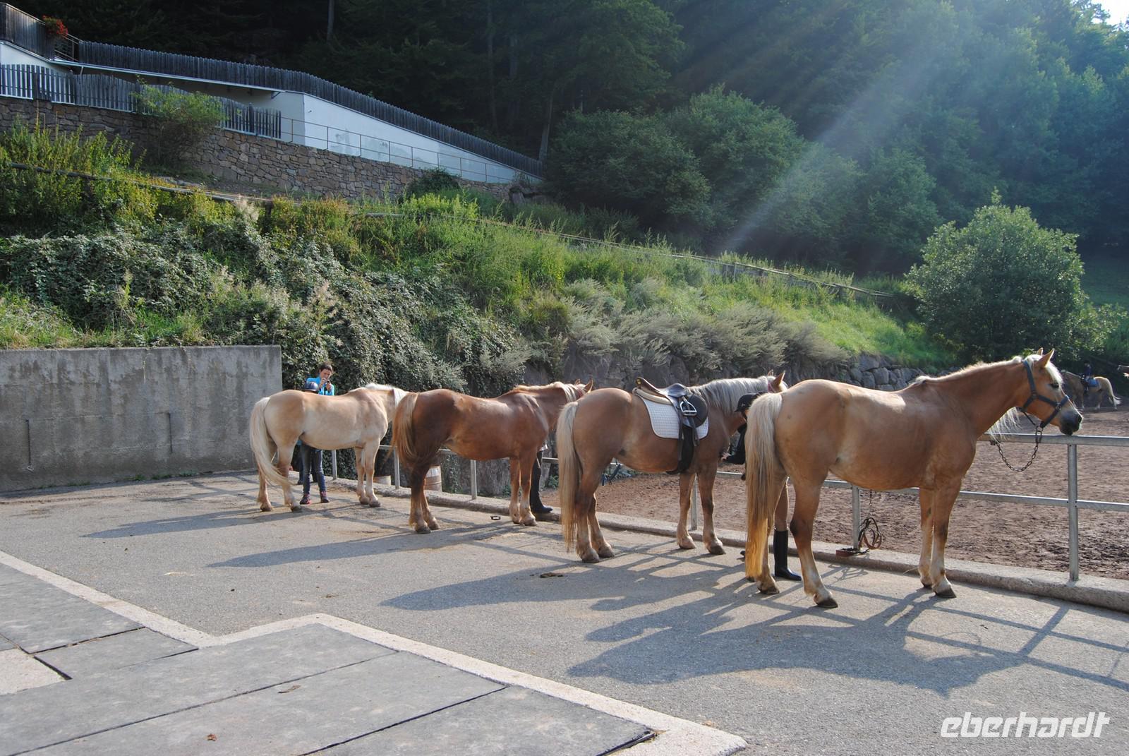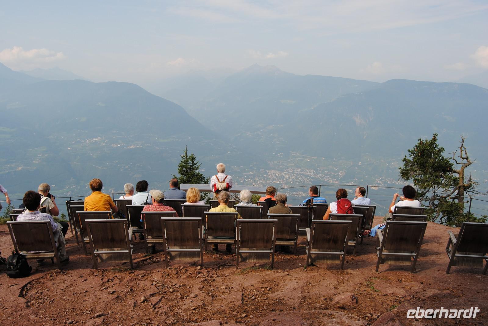 Bei sonnigem Wetter fuhren wir am Morgen mit dem Bus in den Ort Hafling und besuchten dort die bekannten Haflinger Pferde und im Anschluss die St. Kathrein Kirche, von der man einen schönen Blick in das Etschtal hat. Im Anschluss fuhren wir noch wenige Minuten mit dem Bus bis zum Gasthof Alpenrose, der sich zwischen den beiden Orten Hafling und Vöran befindet und Ausgangspunkt der Wanderung in das Haflinger Gebiet war. Nach einem steileren Anstieg erreichten wir das sogenannte Knottnkino, einer der wohl schönsten Panoramaaussichten Südtirols. Im Südtiroler Dialekt bedeutet Knottn dabei so viel wie Fels. Das Knottnkino ist dabei so angerichtet, das man wie in einem Kino sitzt und dabei den Blick in die Meraner Ebene sowie das Etschtal schweifen lassen kann. Unser weiterer Weg führte uns bergan über sattgrüne Bergwiesen zur Leadneralm, wo wir eine Mittagsrast einlegten und im Anschluss am Nachmittag über den Schützelbrünnelweg , wo unser Bus bereits wartete und uns zurück nach Meran brachte.
